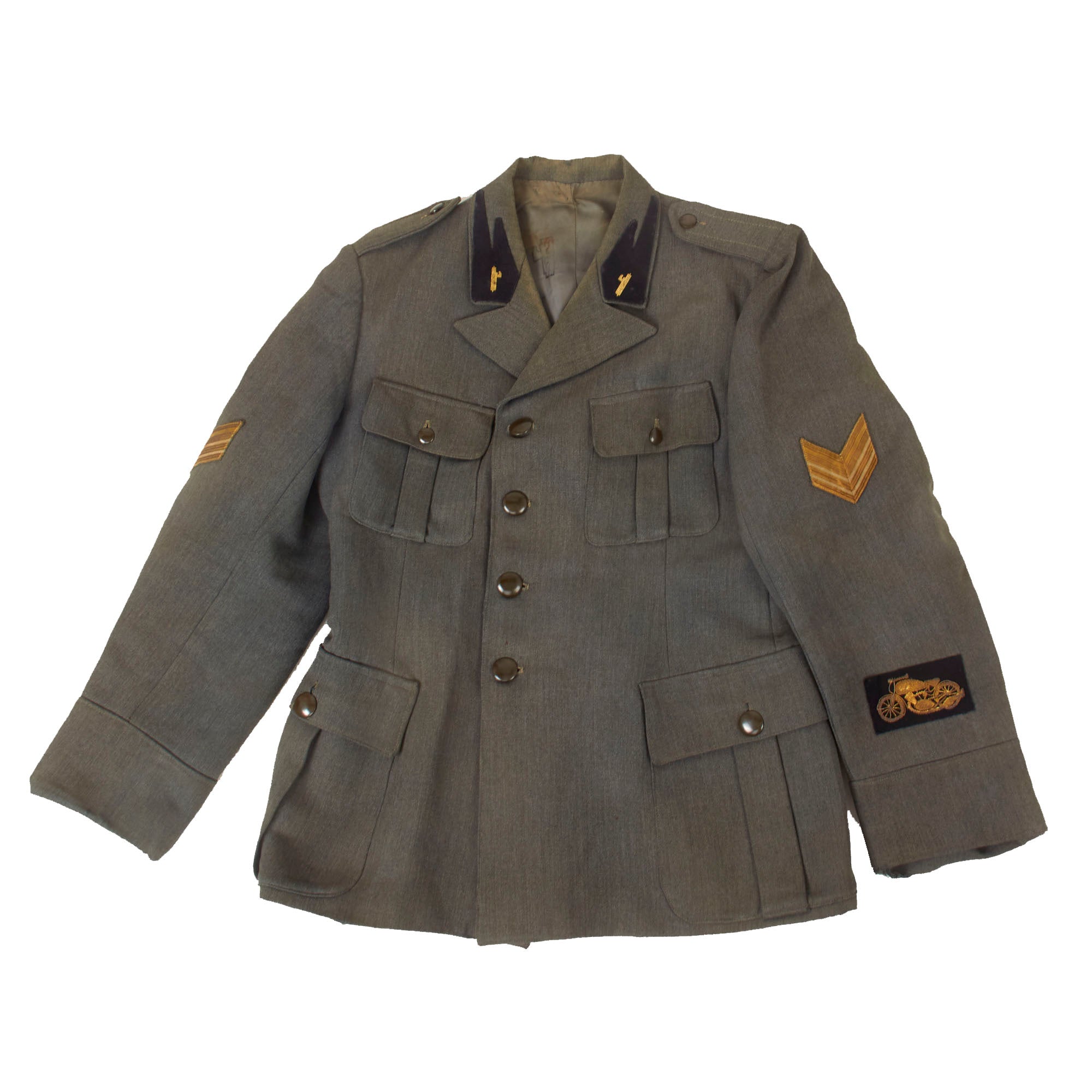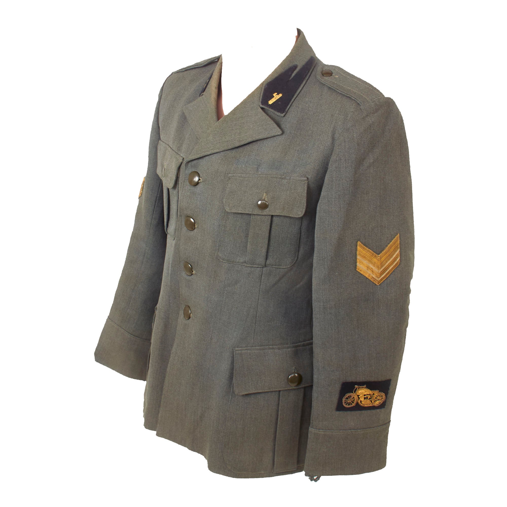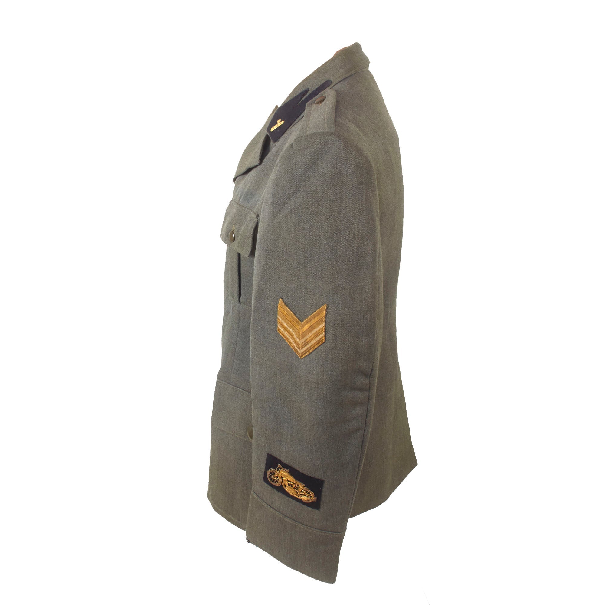 Original Item: Only One Available. This is a lovely World War Two Italian MVSN Motorcyclist Sergente’s tunic constructed of blue wool. Features MVSN black collar tabs with fascist axe collar pins, Sergente sleeve rank insignia and a lovely bullion motorcyclist’s cuff badge. The front has a four button closure, two hip pockets and chest pocket.