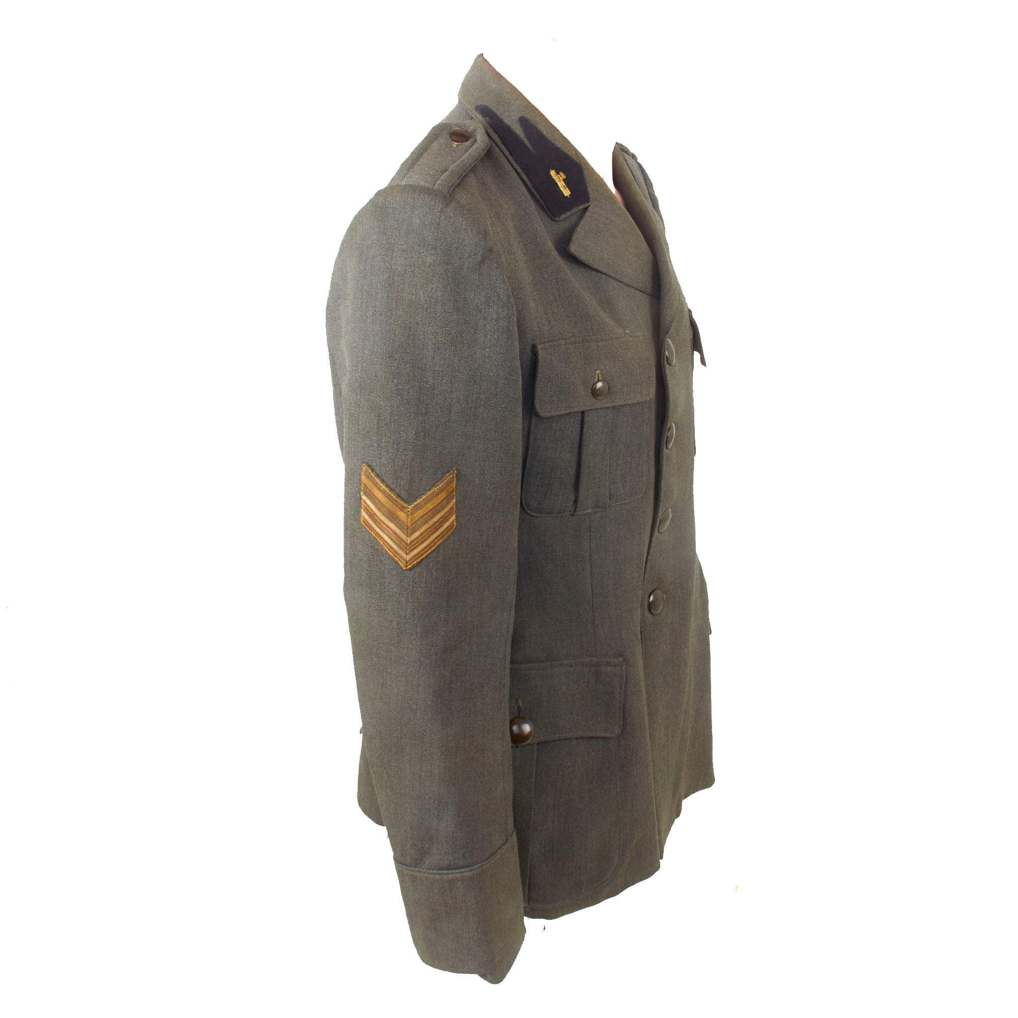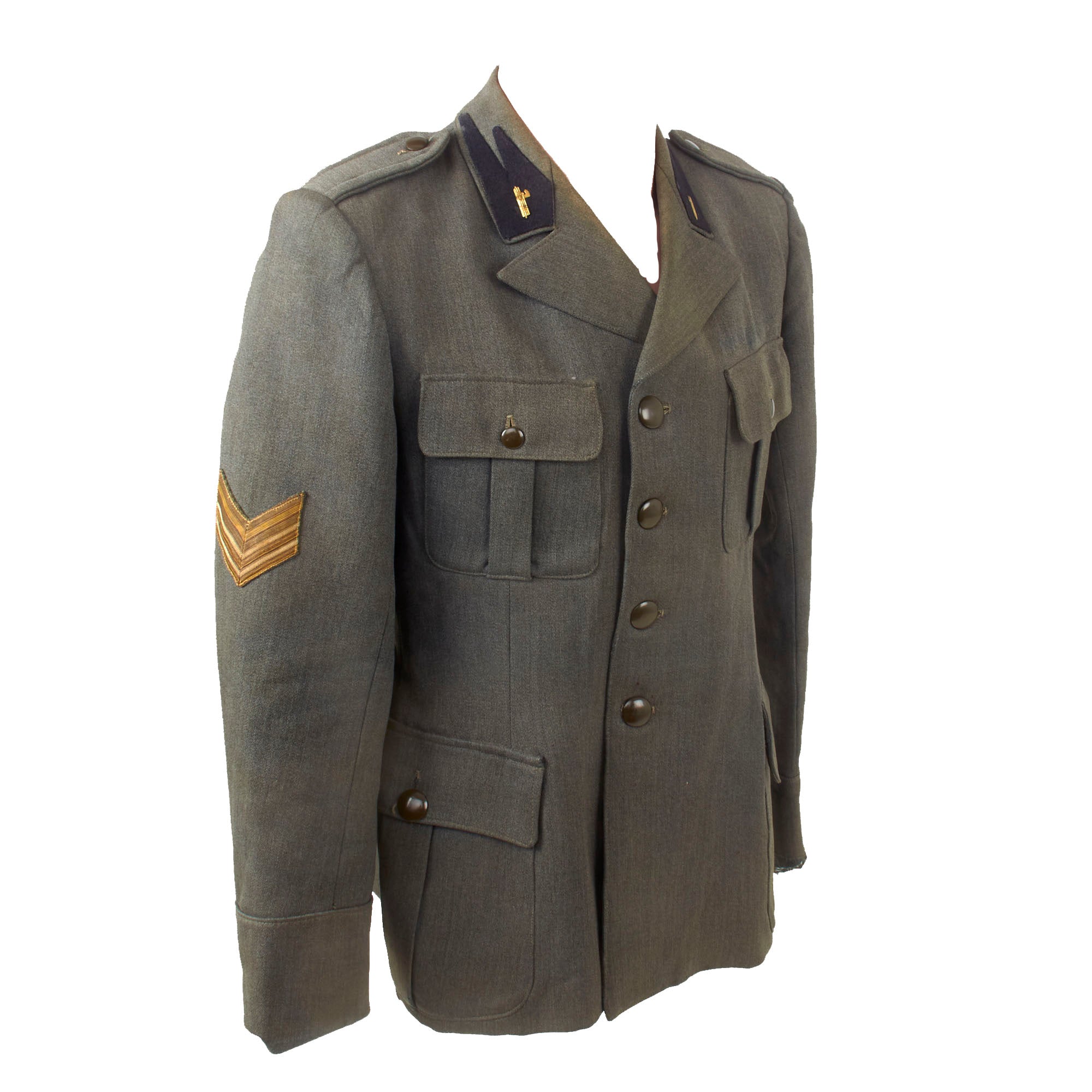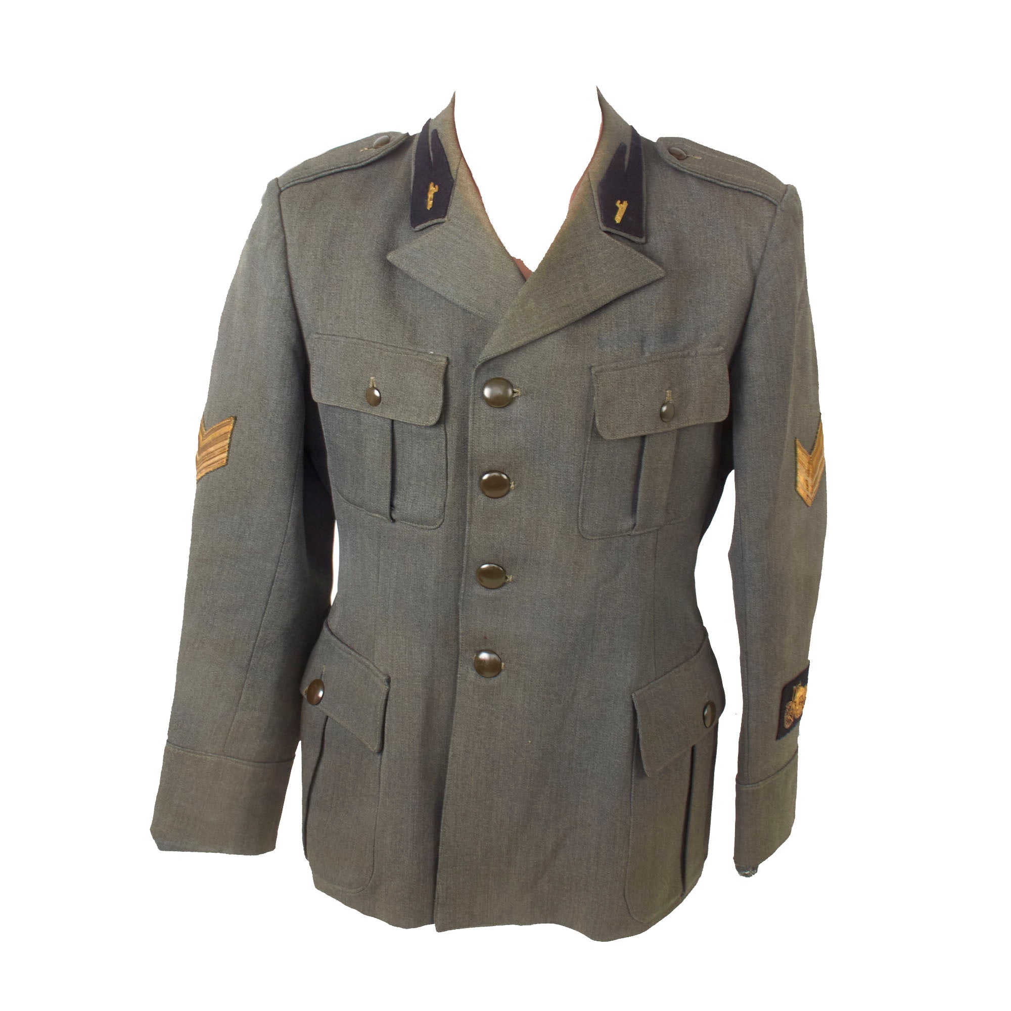 Original Item: Only One Available. This is a lovely World War Two Italian MVSN Motorcyclist Sergente’s tunic constructed of blue wool. Features MVSN black collar tabs with fascist axe collar pins, Sergente sleeve rank insignia and a lovely bullion motorcyclist’s cuff badge. The front has a four button closure, two hip pockets and chest pocket.