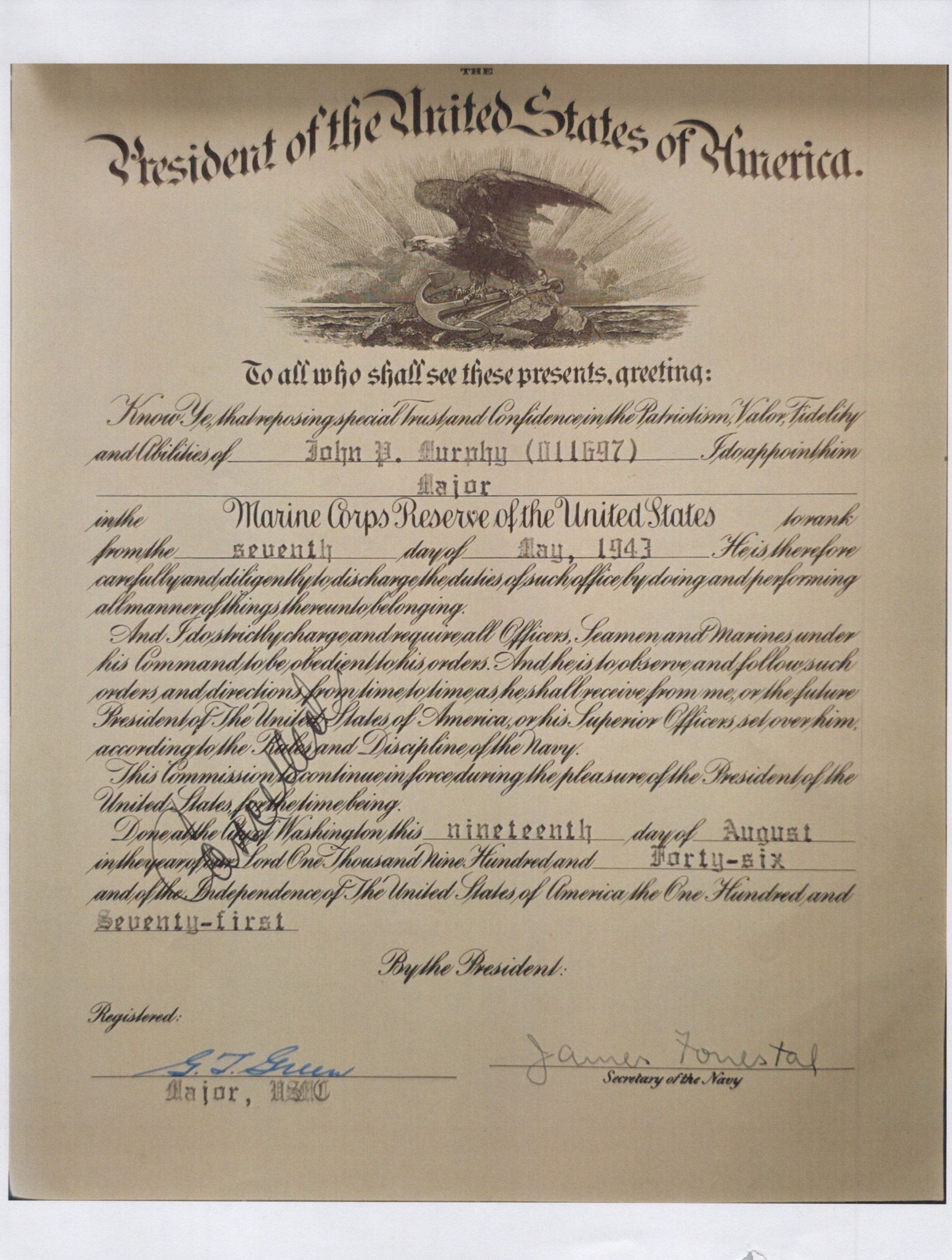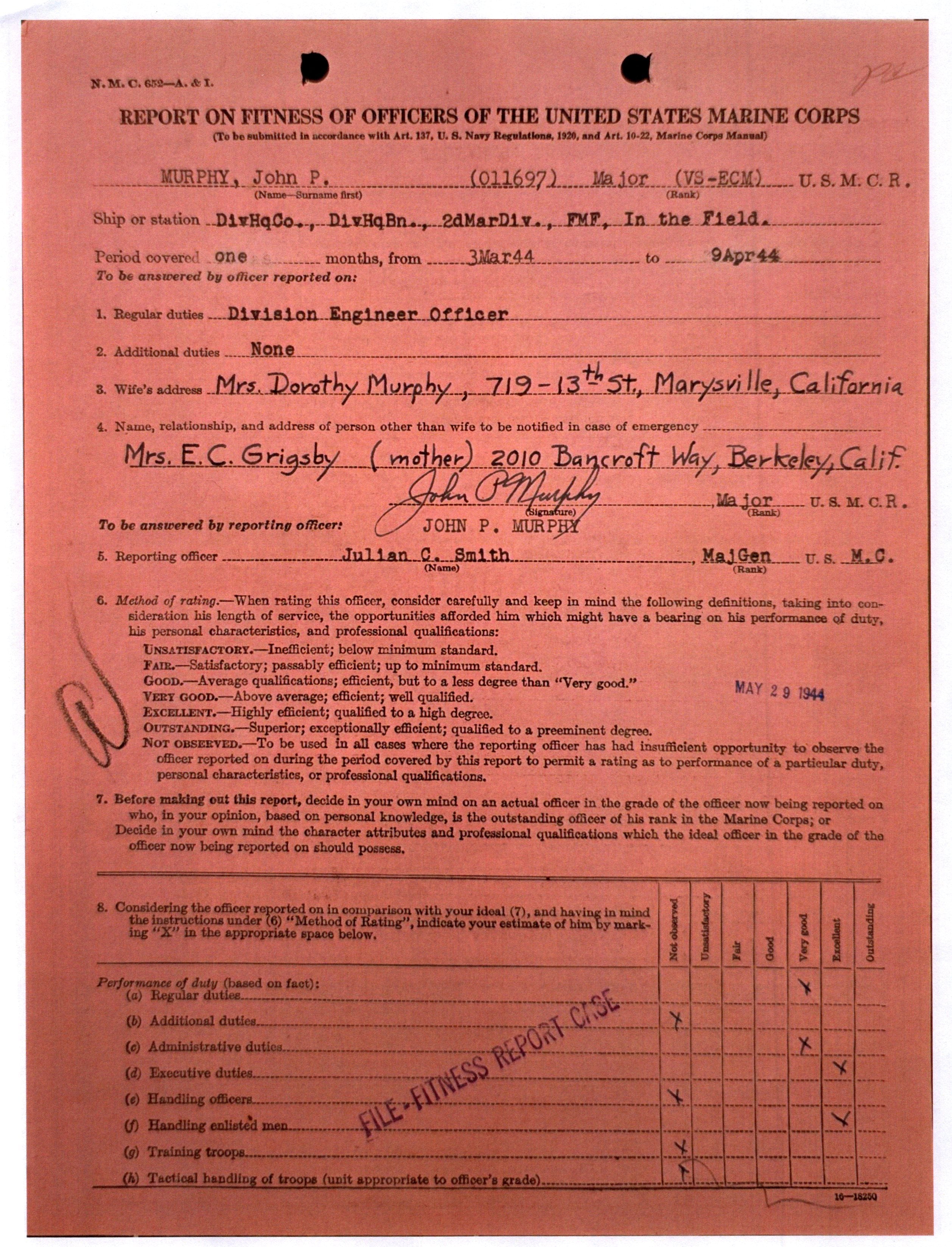 • Original Item. One-of-a-Kind Group. This is the uniform and research grouping of USMC Major John Prentice Murphy, H&S Co, 18th Marines (Engr), 2nd Marine Division, FMF. Murphy served as Construction Officer and Platoon Leader of a Construction Platoon.