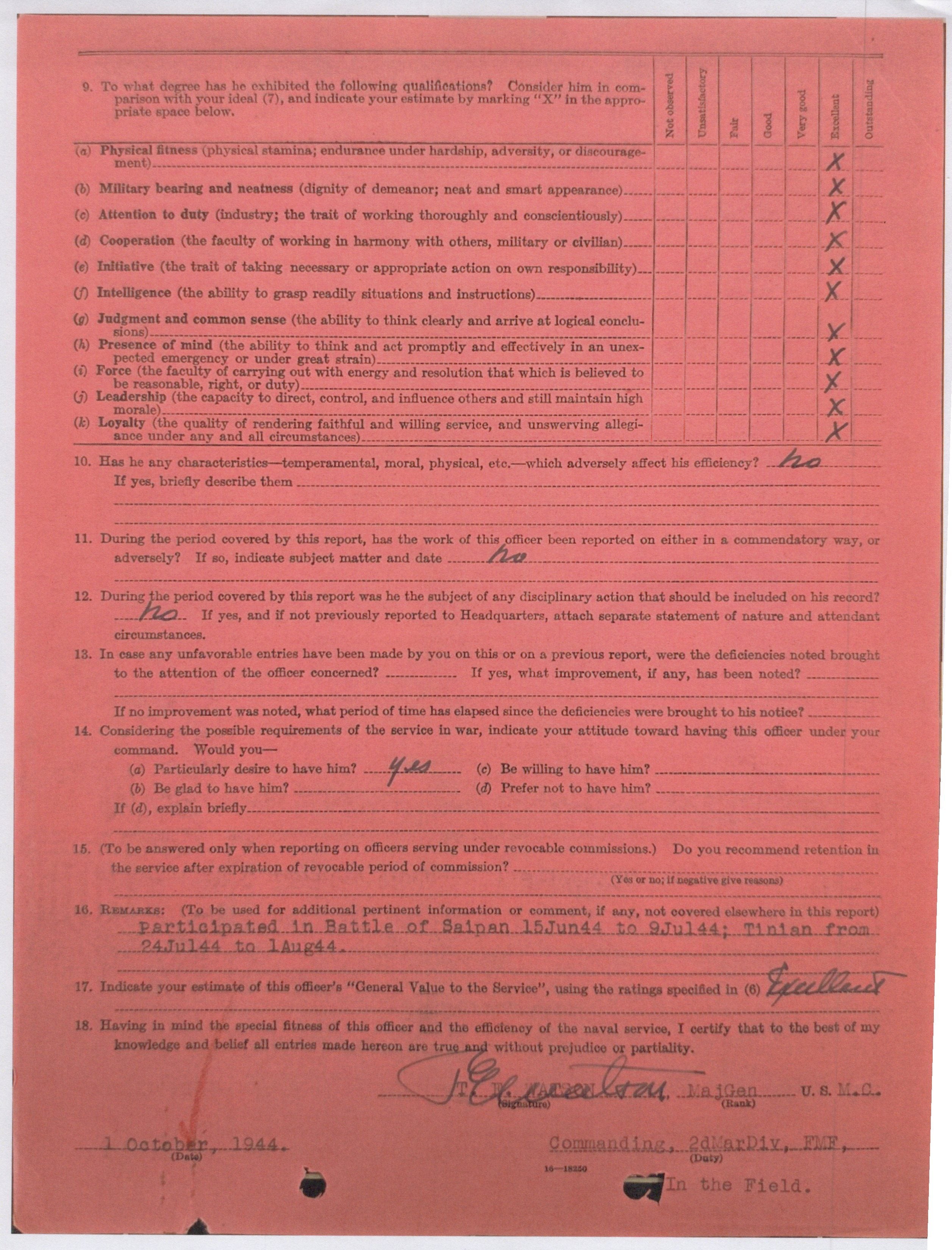 Included with the set is a folder with over 100+ pages of printed research found in the national archives. Tons of fitness reports, official documents, discharges, promotions, and much more than outlines much of Murphy’s service. According to the documents, Murphy participated in the Battle of Saipan from June 15th to July 9th, 1944, and Tinian from July 24th to August 1st, 1944.