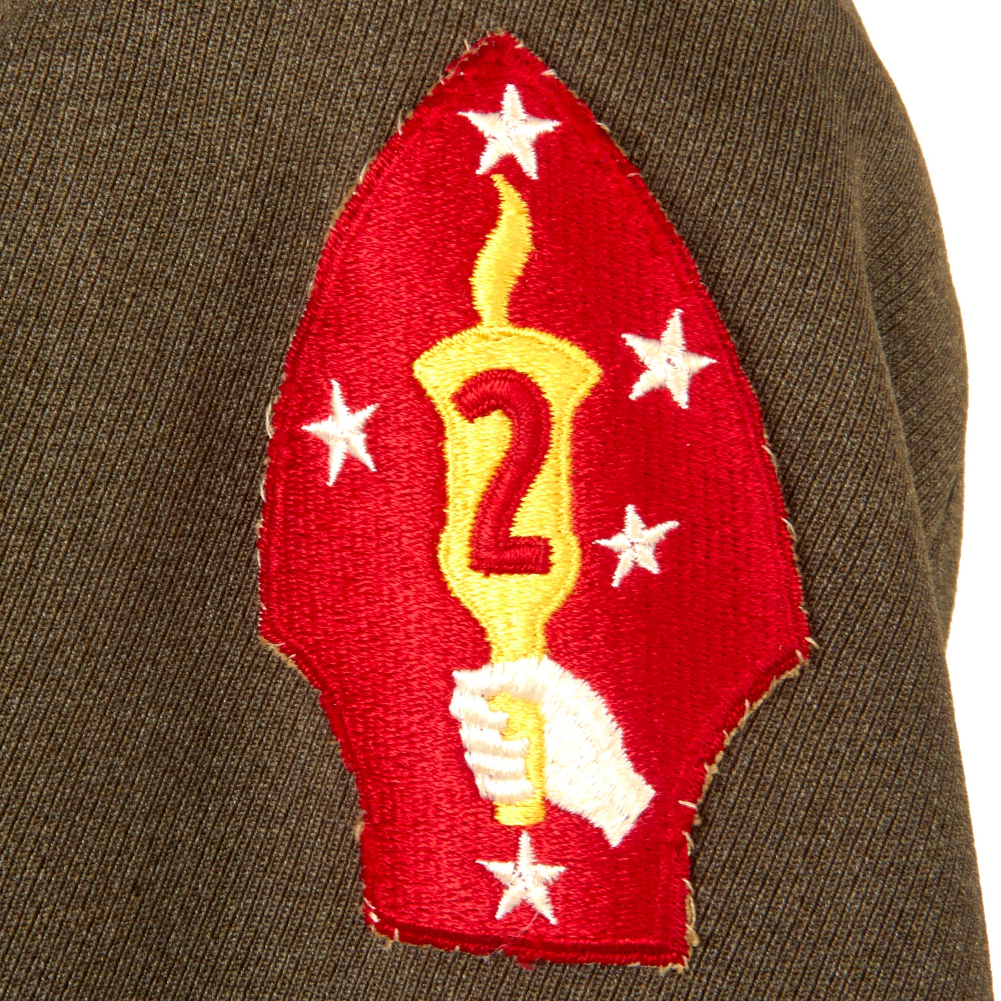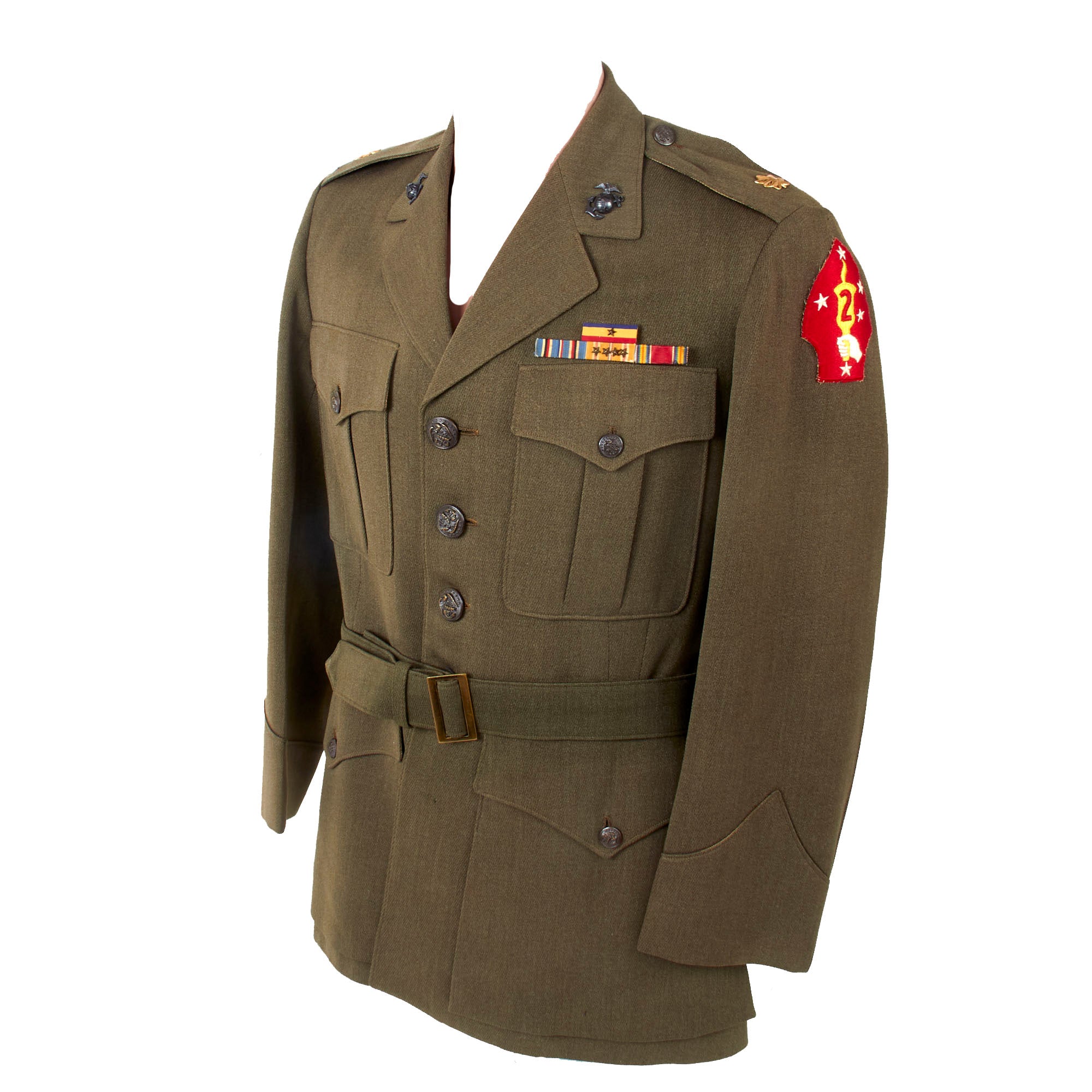 Murphy’s uniform has a 2nd Marine Division patch on the left shoulder, Major rank insignia on each shoulder board, and EGA collar insignia. There is a four-place ribbon bar over the left breast pocket with the Navy Presidential Unit Citation with a star, the American Campaign Medal, the Asiatic-Pacific Campaign medal with four campaign stars, and the WWII Victory Medal. The interior shows moderate wear, and the name J.P. MURPHY is stamped in the interior right shoulder. The jacket appears to be private purchase, which makes sense for an officer.