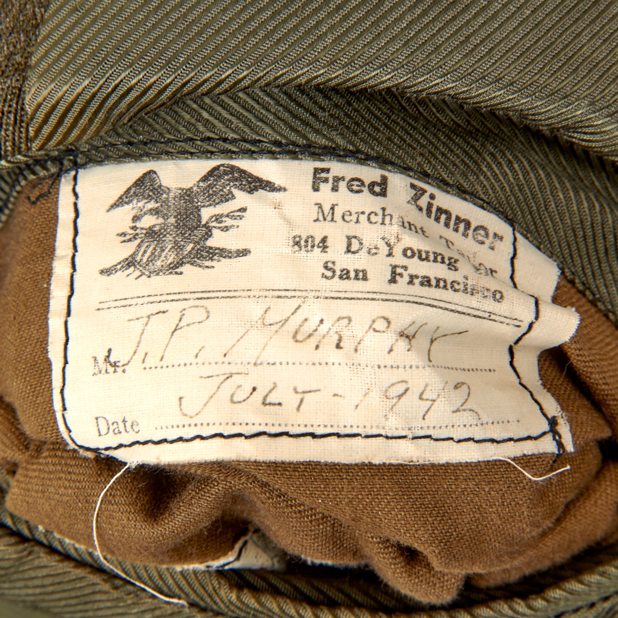 The included trousers are in good shape and also appear private purchase. The trousers have a tag for Fred Zinner of San Francisco, named J.P. MURPHY with a date of July 1942.