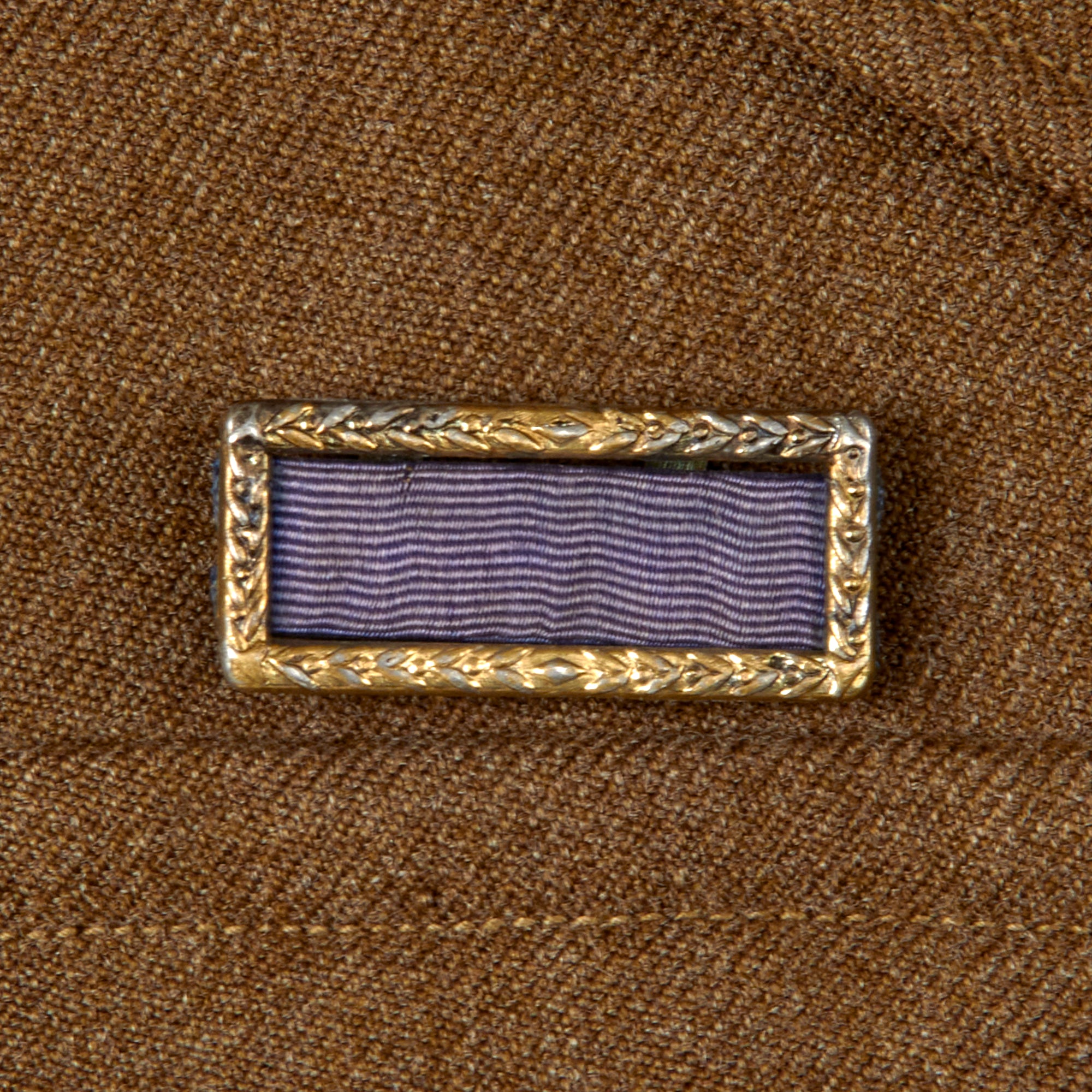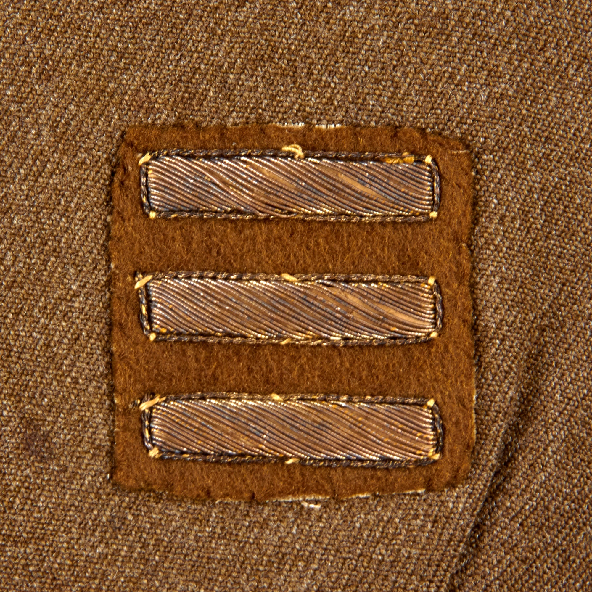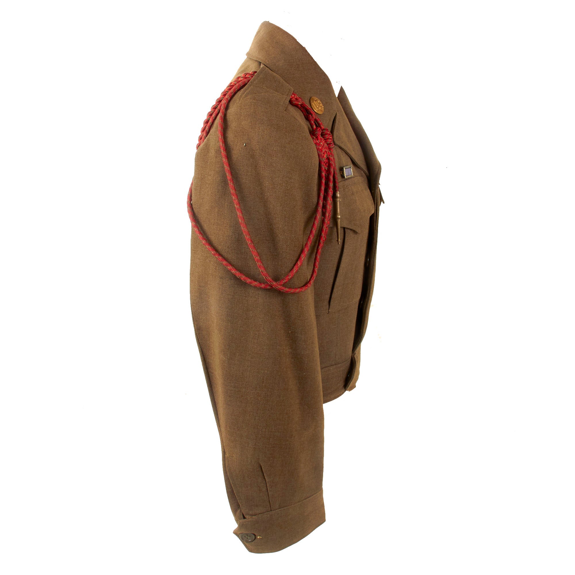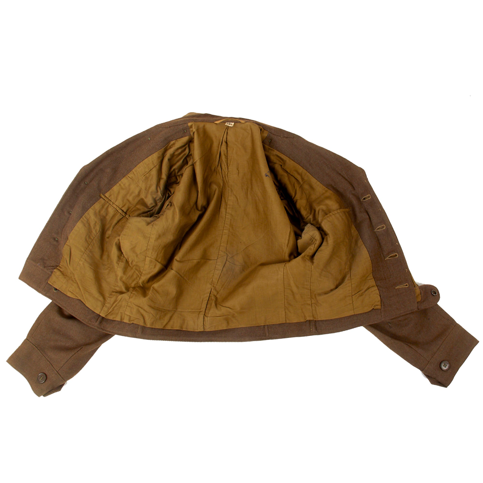 The jacket has some minor moth nipping on the collar and across the exterior. The interior retains a tag in the pocket, with a contract date of June 9th, 1944.