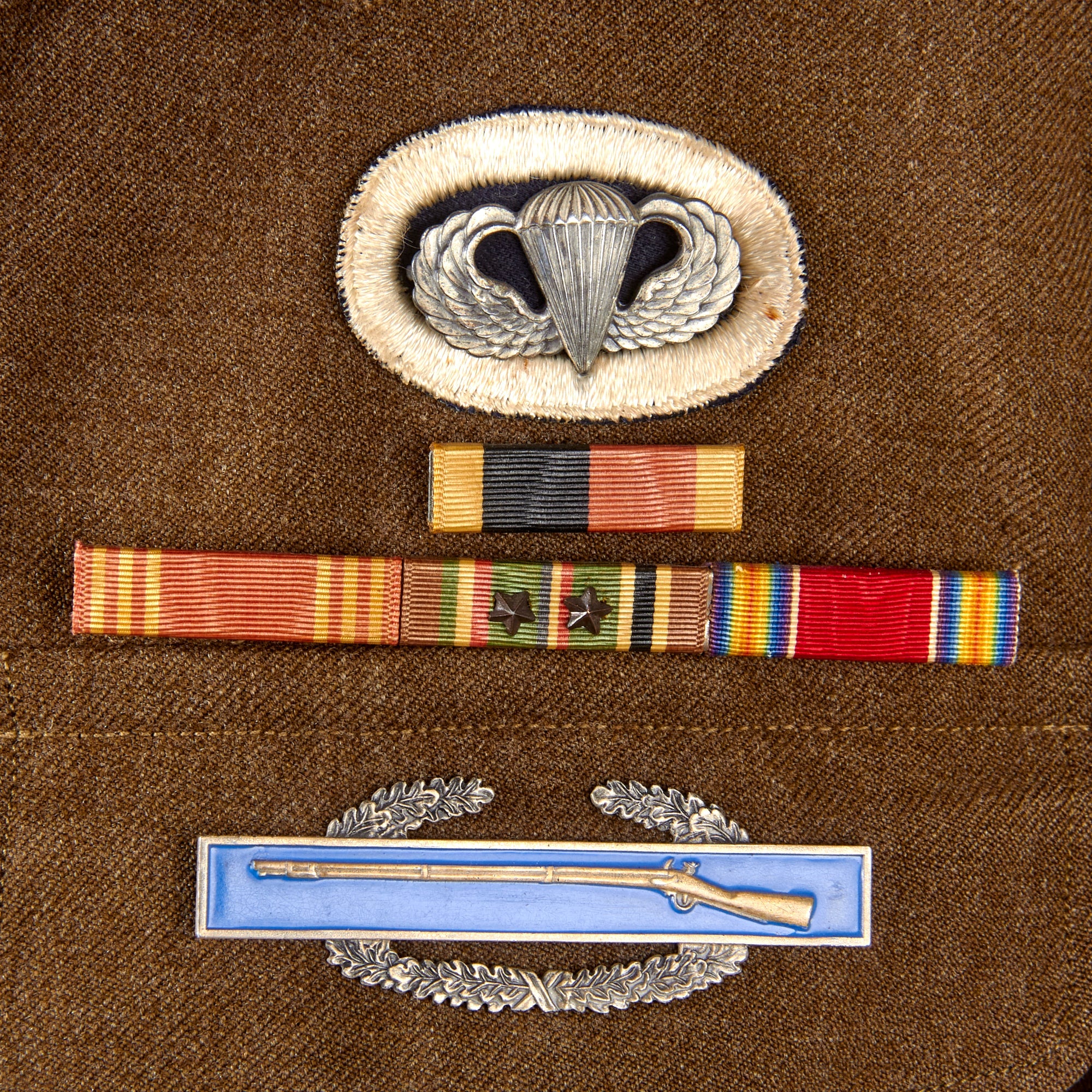 The jacket has an 82nd Airborne patch and rocker on the left shoulder, three bullion overseas stripes on the left cuff, US & Infantry collar discs, and a French Fourragere cord on the right shoulder. There is a Presidential unit citation over the right breast pocket, and four ribbons over the right breast pocket including the Occupation Medal, the Good conduct medal, the European-African-Middle Eastern campaign medal with two campaign stars, and the WWII Victory medal. Over this is a great Airborne oval for the 508th Parachute Infantry Regiment with a set of Sterling Glider wings pinning it to the jacket. The oval has no stitching. On the pocket is a Combat Infantryman Badge. There is a size tag under the collar, for 34S.