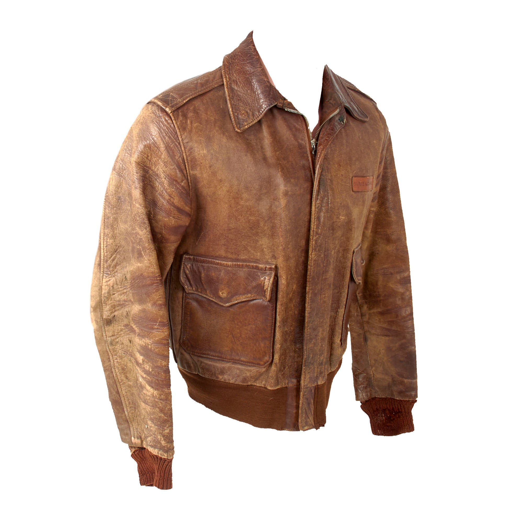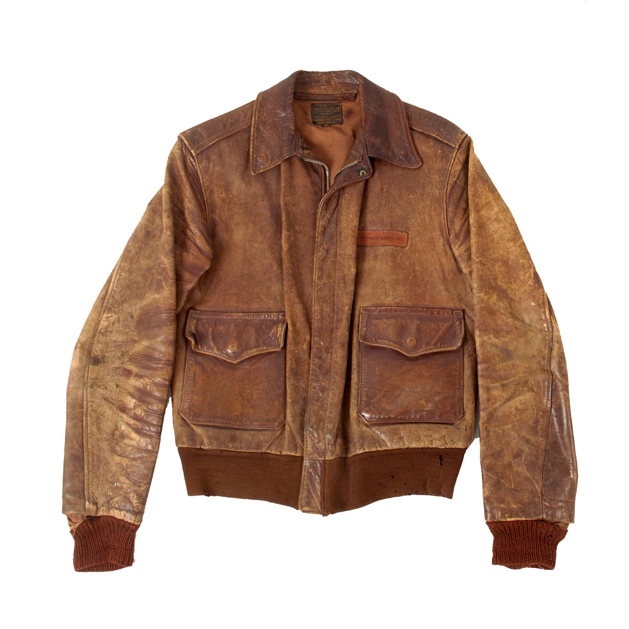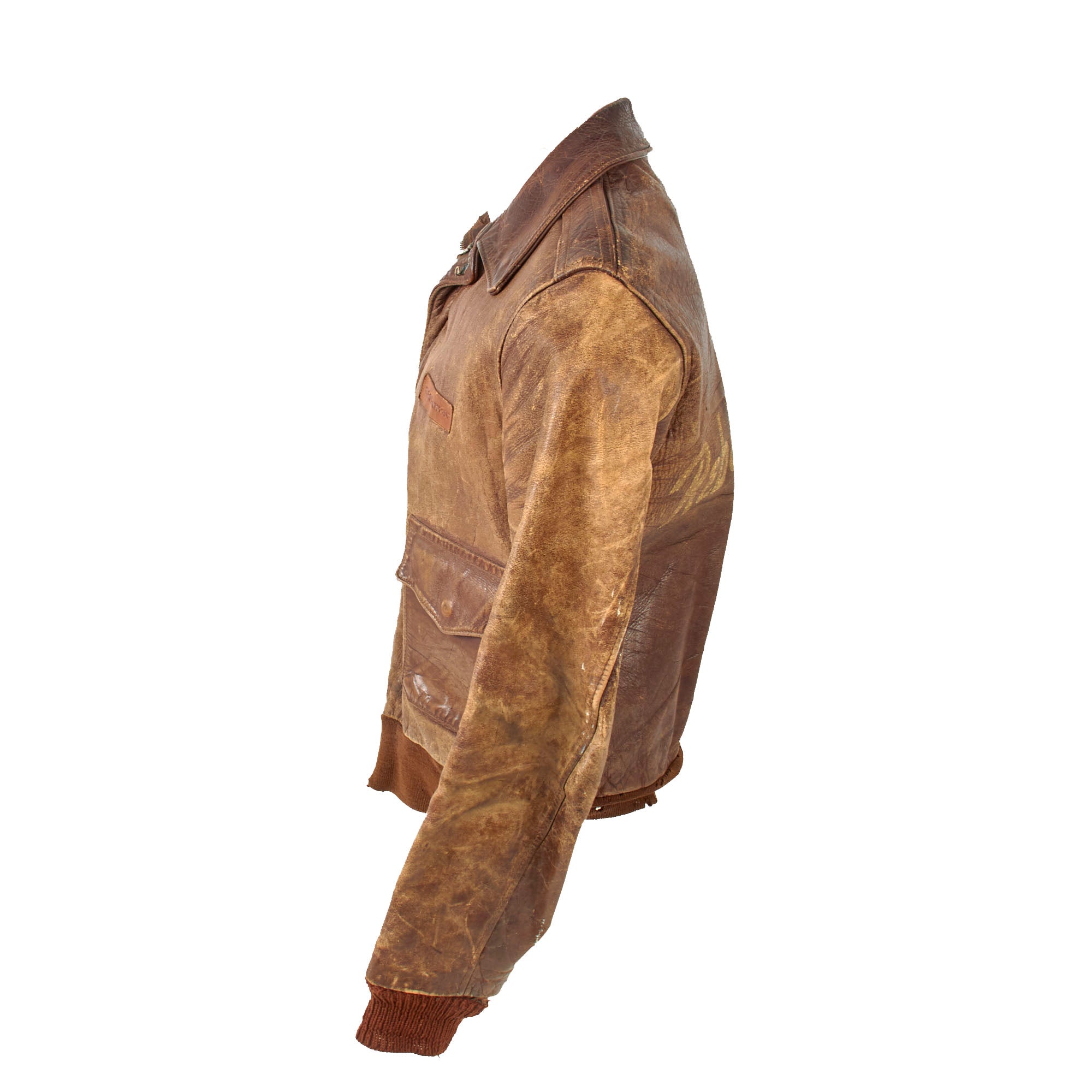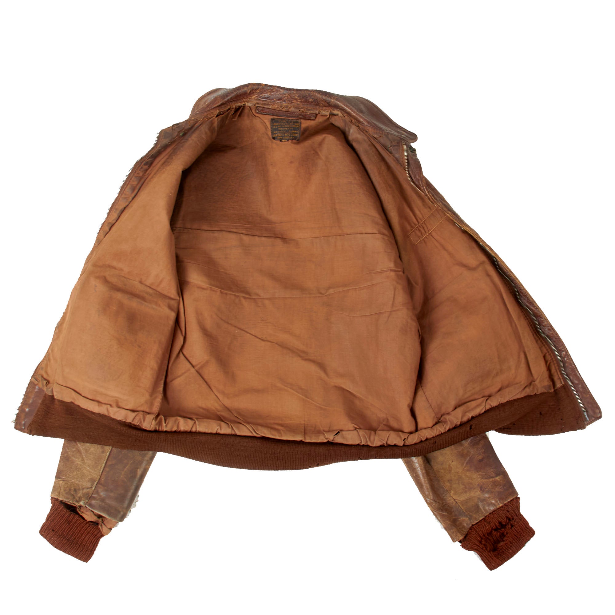 The interior lining appears to be original but may be a period replacement. The knit cuffs and waistband appear original but have heavy tearing and damage as shown. The leather also is torn up a bit around the collar as shown. This example was certainly worn on some of his 26 missions. The zipper is marked CROWN and still works fine.