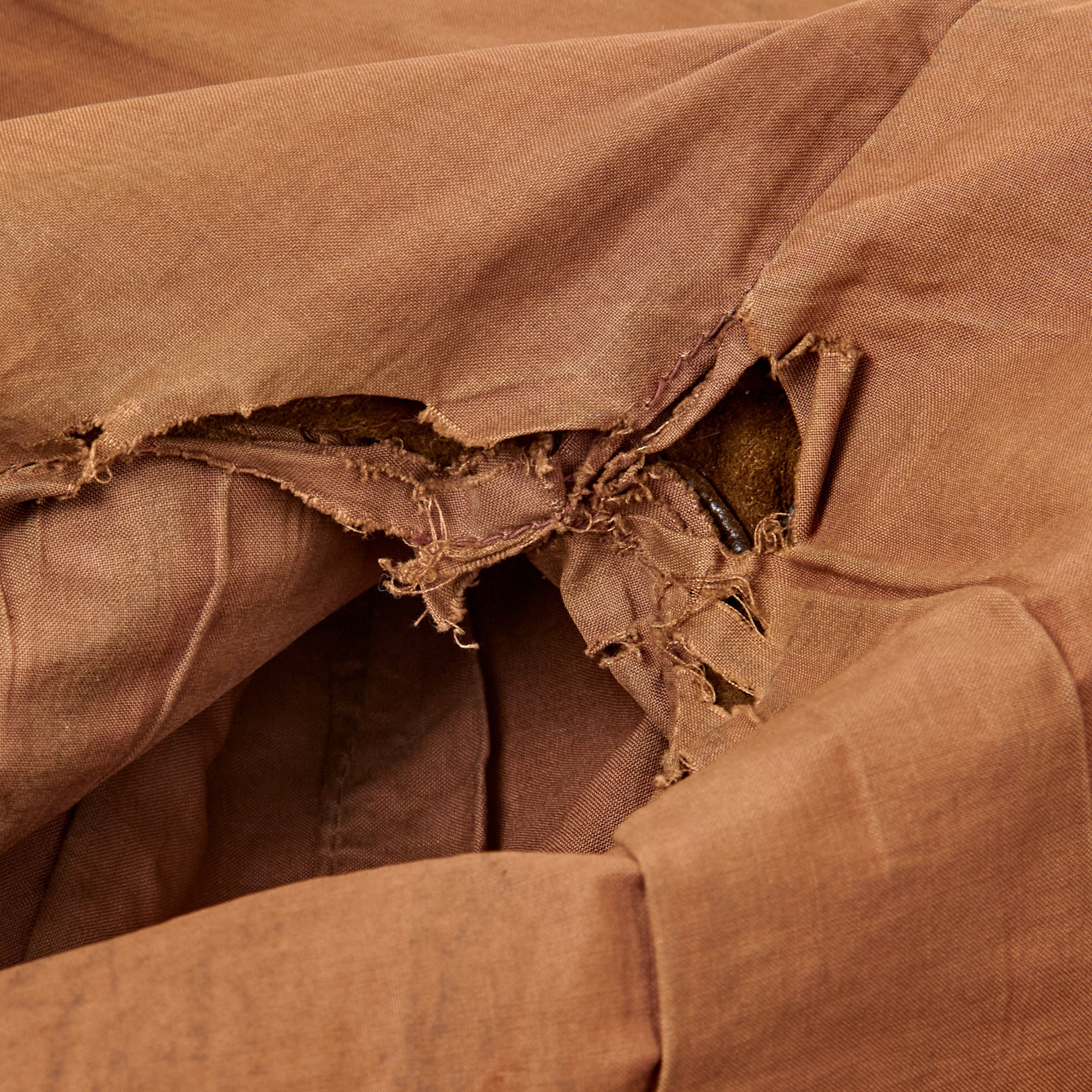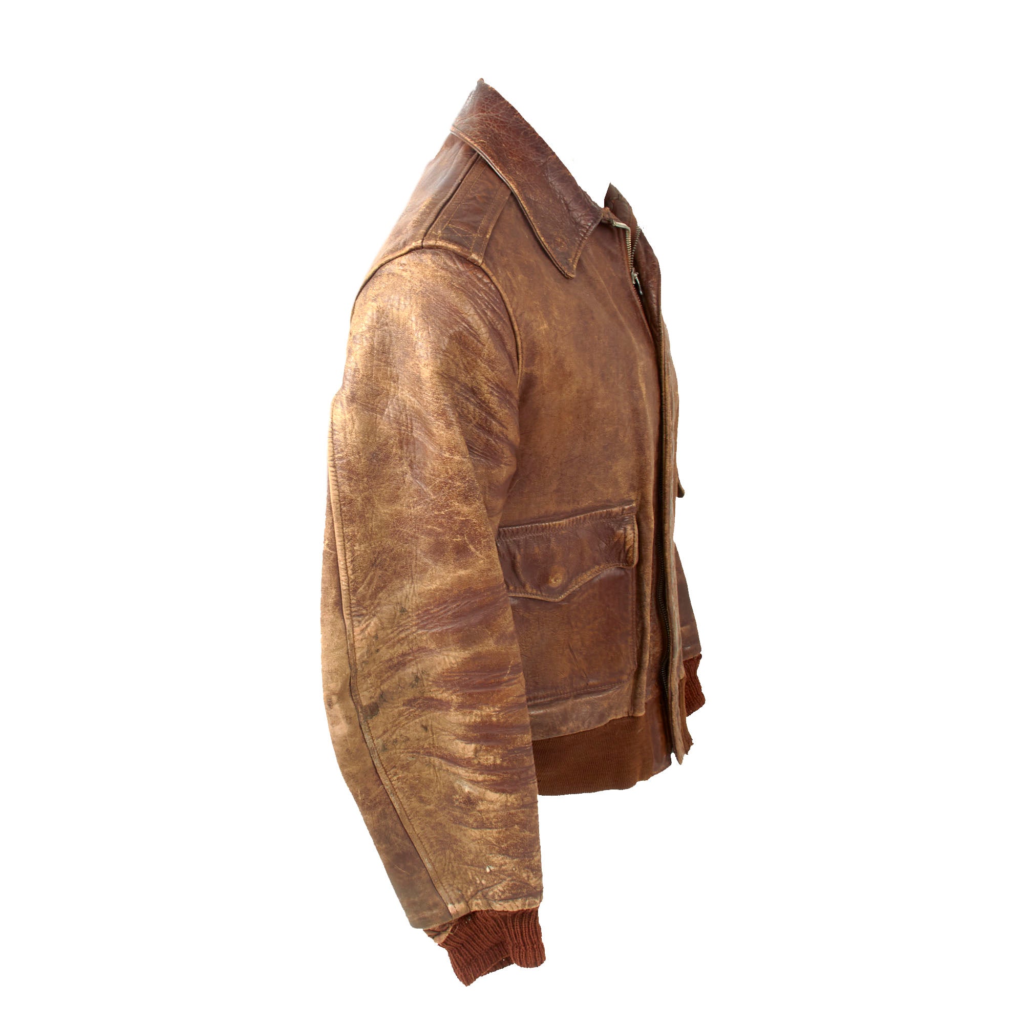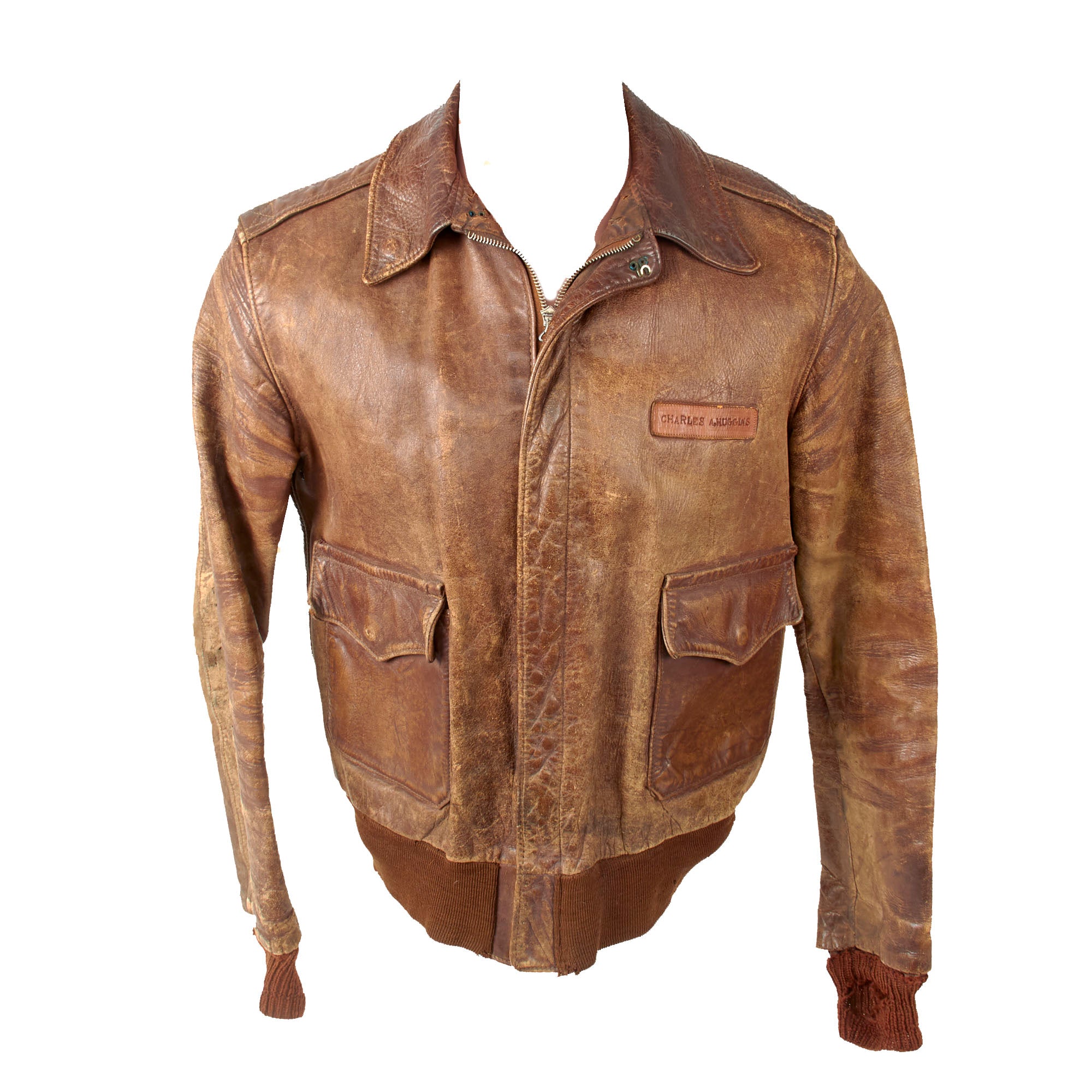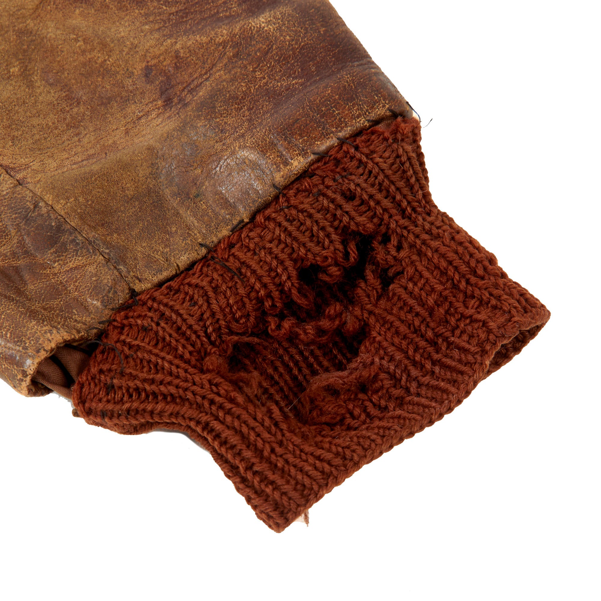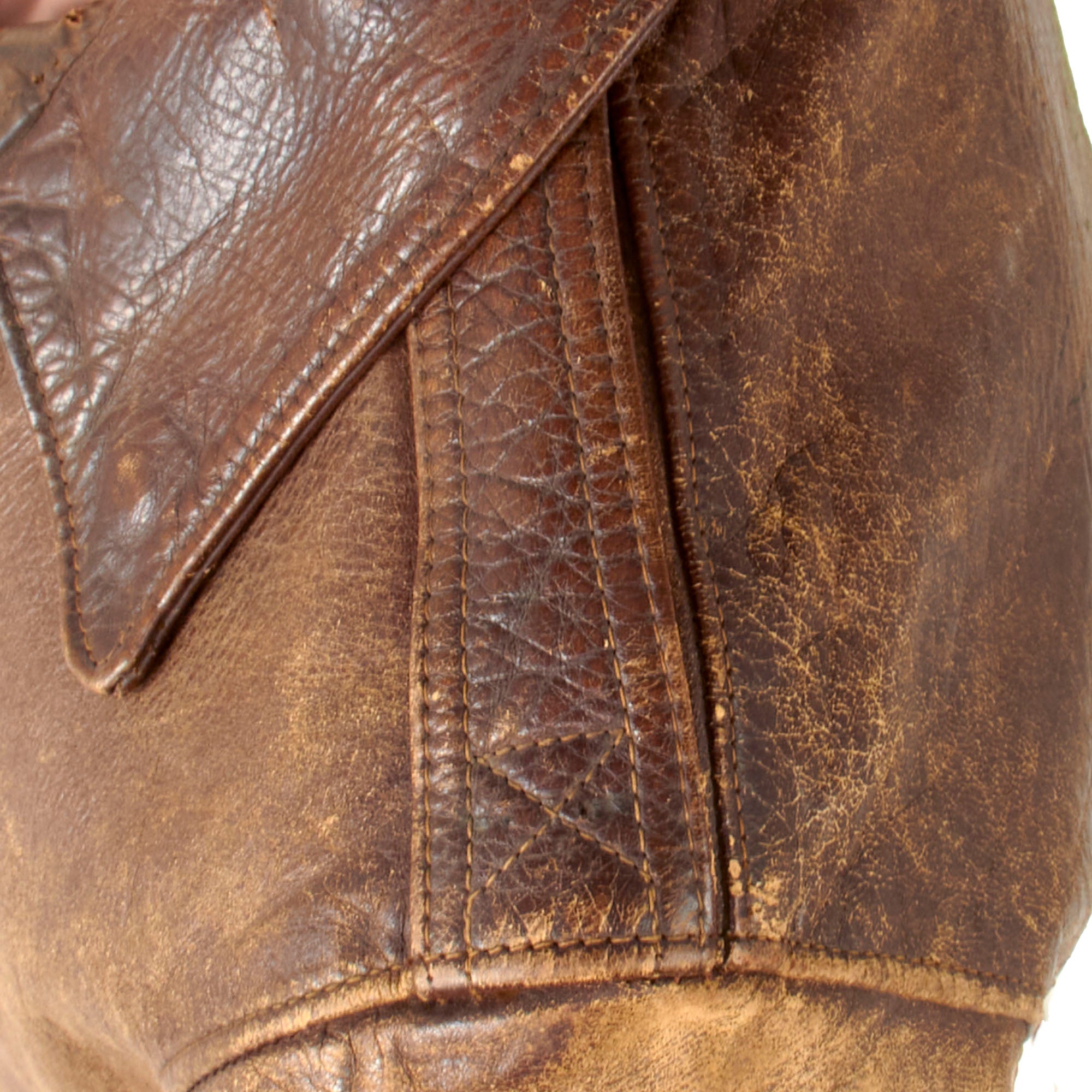 The interior lining appears to be original but may be a period replacement. The knit cuffs and waistband appear original but have heavy tearing and damage as shown. The leather also is torn up a bit around the collar as shown. This example was certainly worn on some of his 26 missions. The zipper is marked CROWN and still works fine.