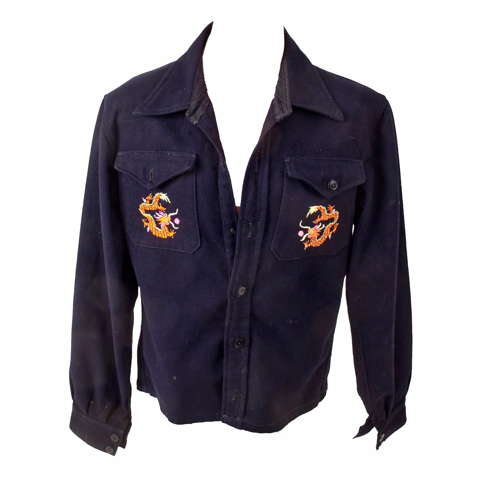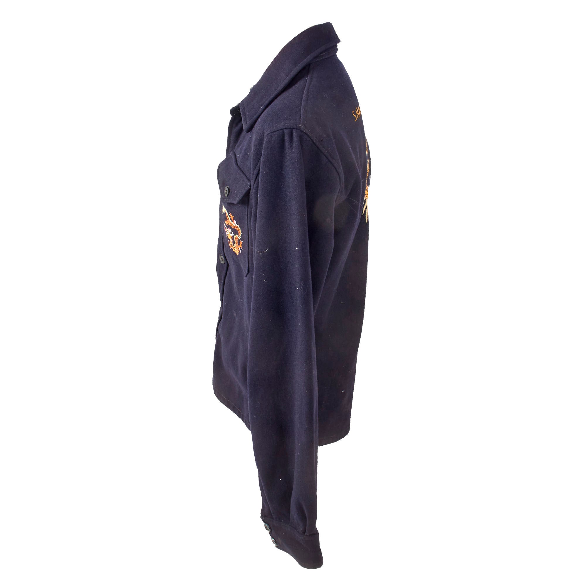 The roots of the Souvenir Jacket, or Sukajan in Japanese, can be traced back to American soldiers stationed in the Pacific Theater following the end of World War II. During the post-war occupation, American troops began getting traditional Japanese designs hand-stitched into the backs of their jackets to commemorate their time in Japan. Popular designs included Japanese (and Chinese) style dragons, cherry blossoms and trees. Other soldiers chose local artwork that ranged from traditional maps to Geisha girls. These jackets would often incorporate rayon and silk and, in some cases, were actually constructed from excess silk salvaged from military parachutes. These jackets were brought back to the United States as literal souvenirs and sometimes were purchased as gifts for family members and close friends. Other than the embroidered designs themselves, this style of jacket is defined by its cut, which is similar to a classic American baseball jacket, or in this case, a “battle jacket”. They often incorporated bold colors and contrasting sleeves. The origin of the term ‘Sukajan’ is contested; with some believing the word was an amalgamation of Sky Dragon Jumper in Japanese. Others trace the origins of the name to Yokosuka, an area where American soldiers were stationed; simply combine the words ‘Yokosuka’ and Japanese-accented ‘Jumper’ and you get ‘Sukajan.’