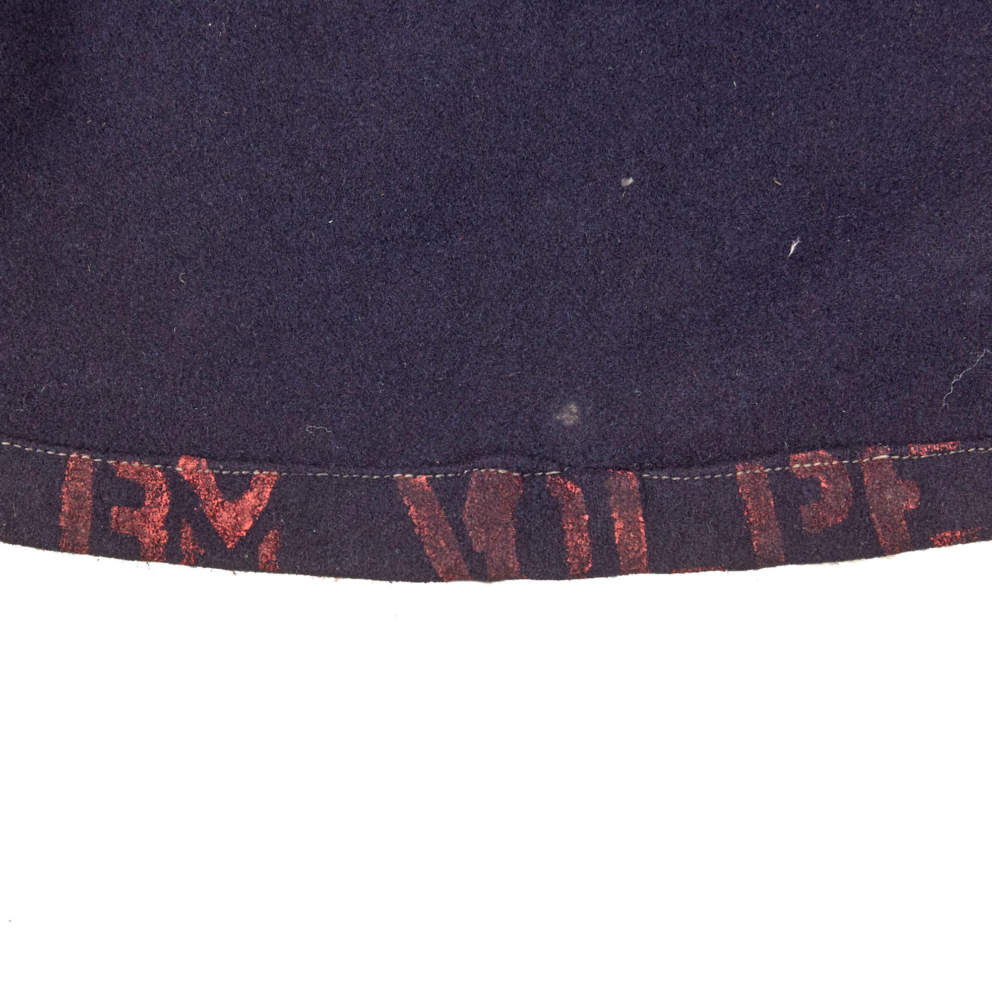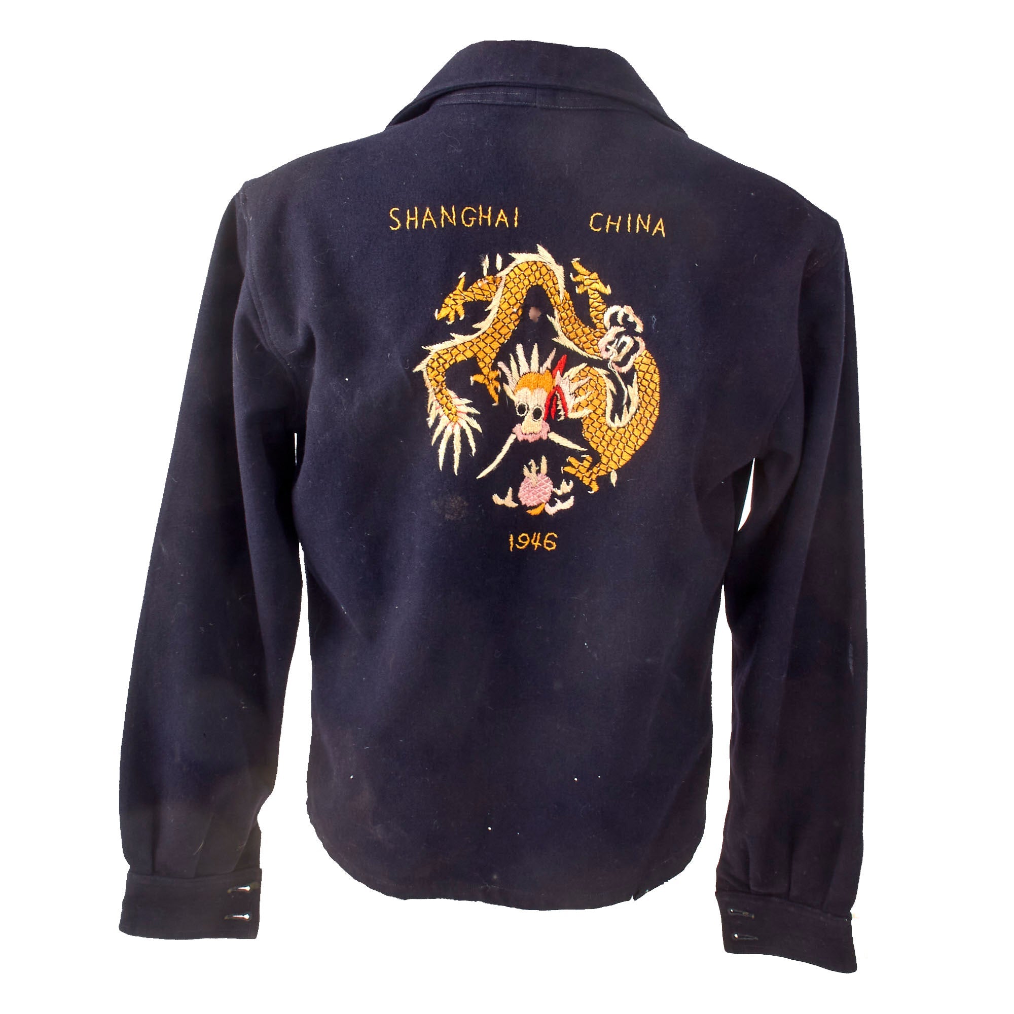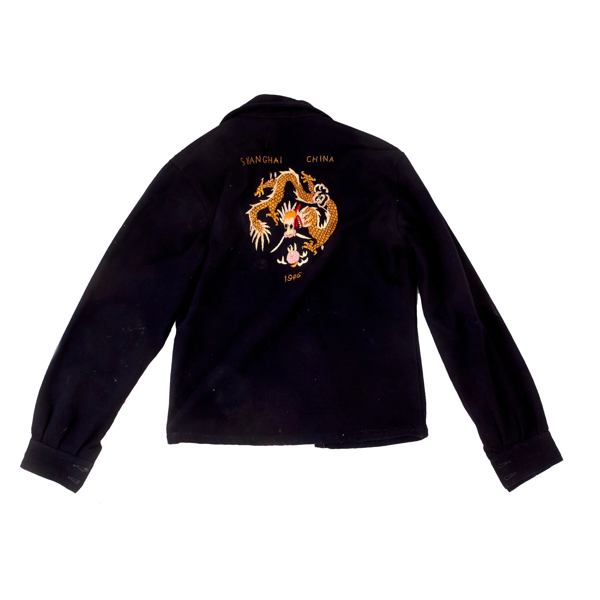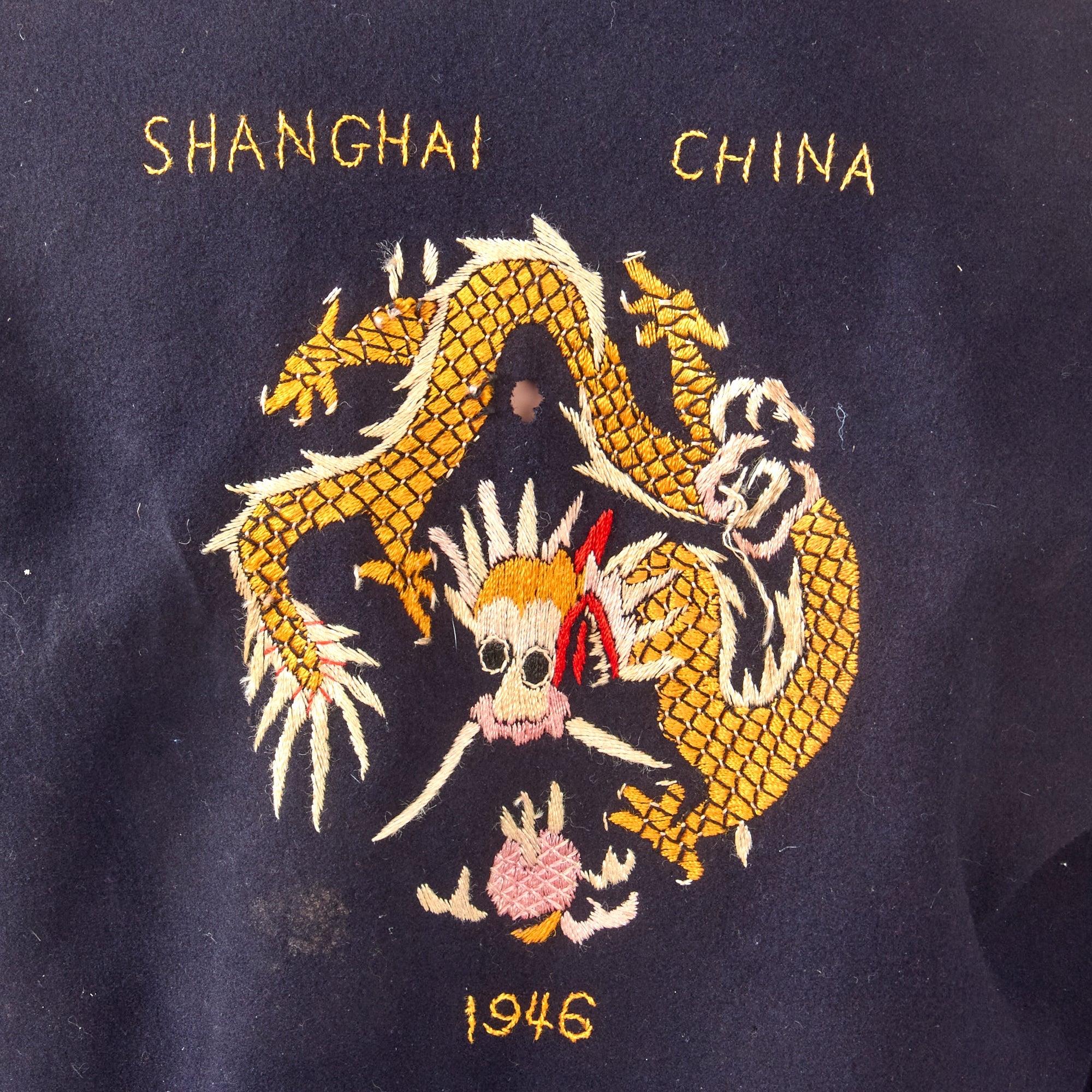 This example is in good condition but does have some holes and mothing across the exterior. All embroidery is still very vibrant and complete but there are holes in the back. This is hands-down one of the best examples we have seen of these souvenir jackets! The back reads SHANGHAI CHINA / 1946. There is a faint stenciled name along the interior edge.