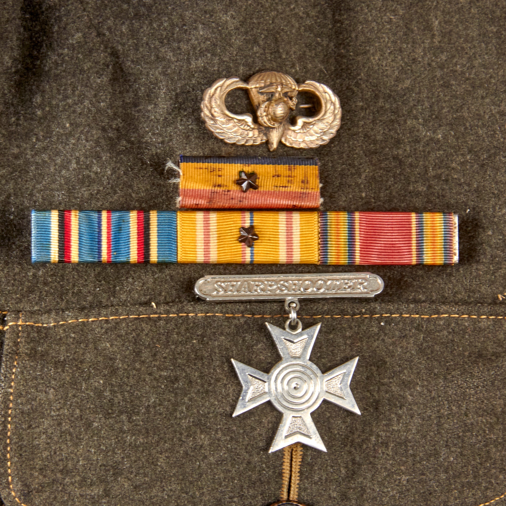 The uniform comes with several printed pages of research from the USMC Muster Rolls. Although Robertshaw never made a combat jump, he still saw the end of the war with the 27th Marines and was one of very few Marines to earn the distinction during the war. He was obviously very proud of it to have had custom wings made.