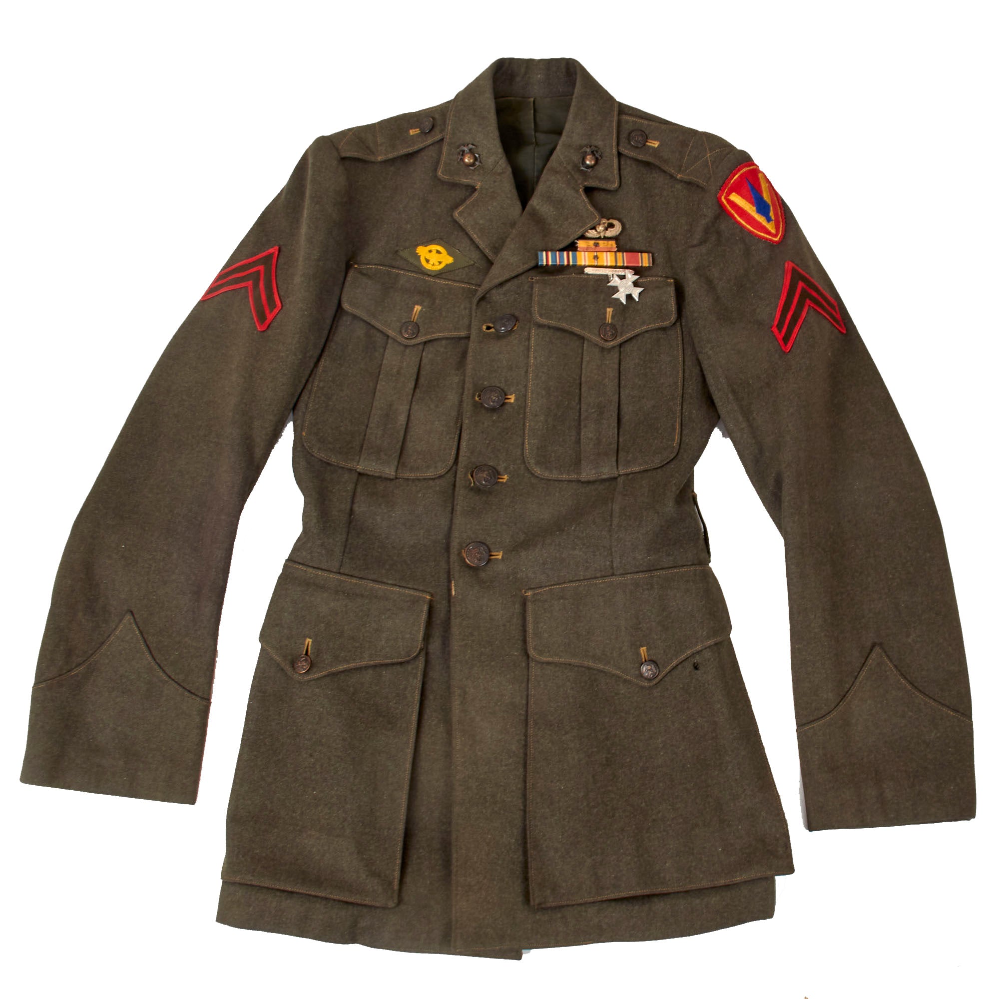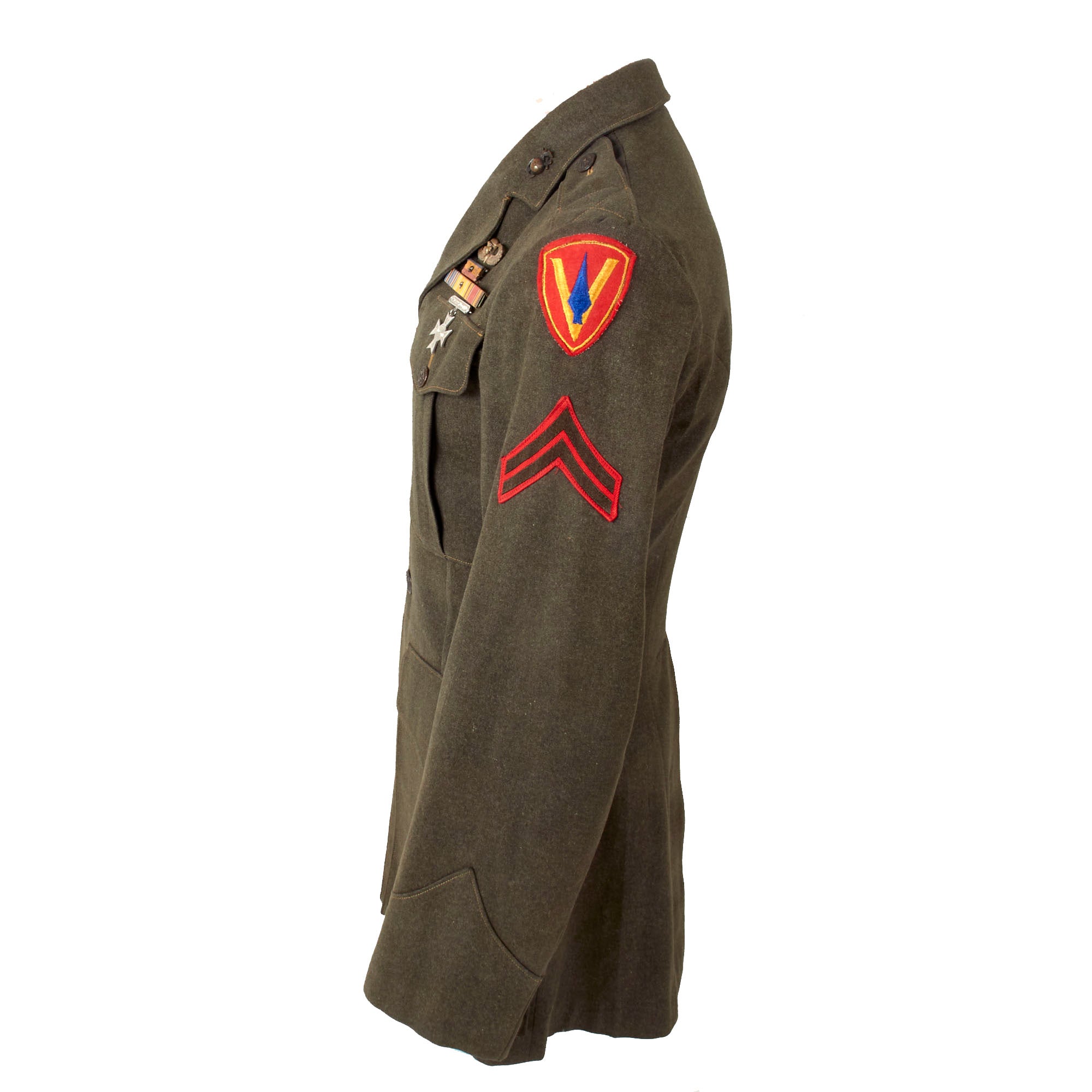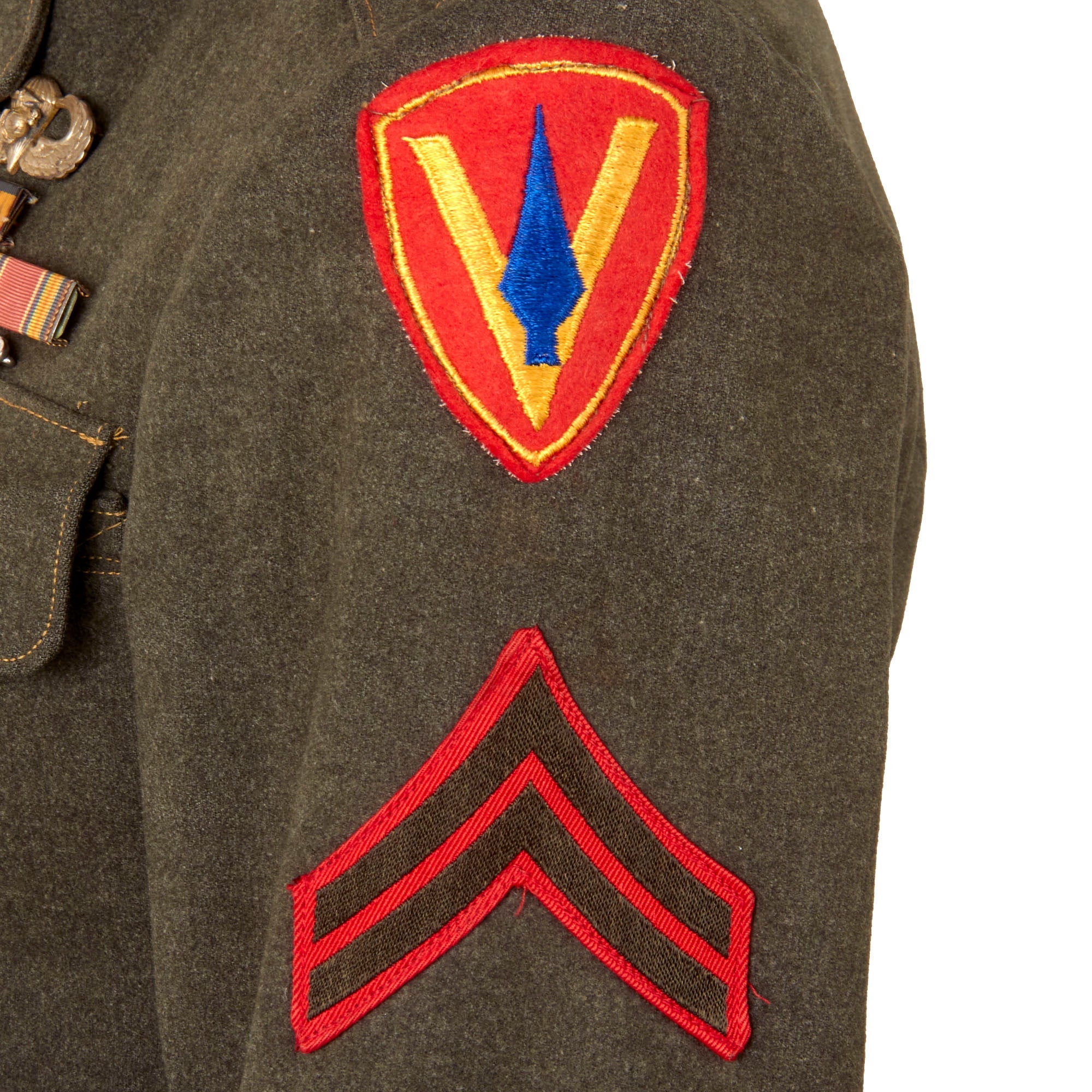 His uniform bears a 5th Marine Division patch on the left shoulder, Corporal chevrons on each sleeve, EGA collar insignia, a Ruptured Duck discharge patch over the right breast pocket, a Sharpshooter badge on the left breast pocket, a 4-place ribbon bar over the left breast pocket with the Navy Presidential Unit Citation with one star, American campaign medal, Asiatic Campaign medal with one campaign star, and the WWII Victory medal, and an outstanding set of USMC Paratrooper wings. The jacket has a 1941-1942 QM marking, and the stamped name W R ROBERTSHAW.
