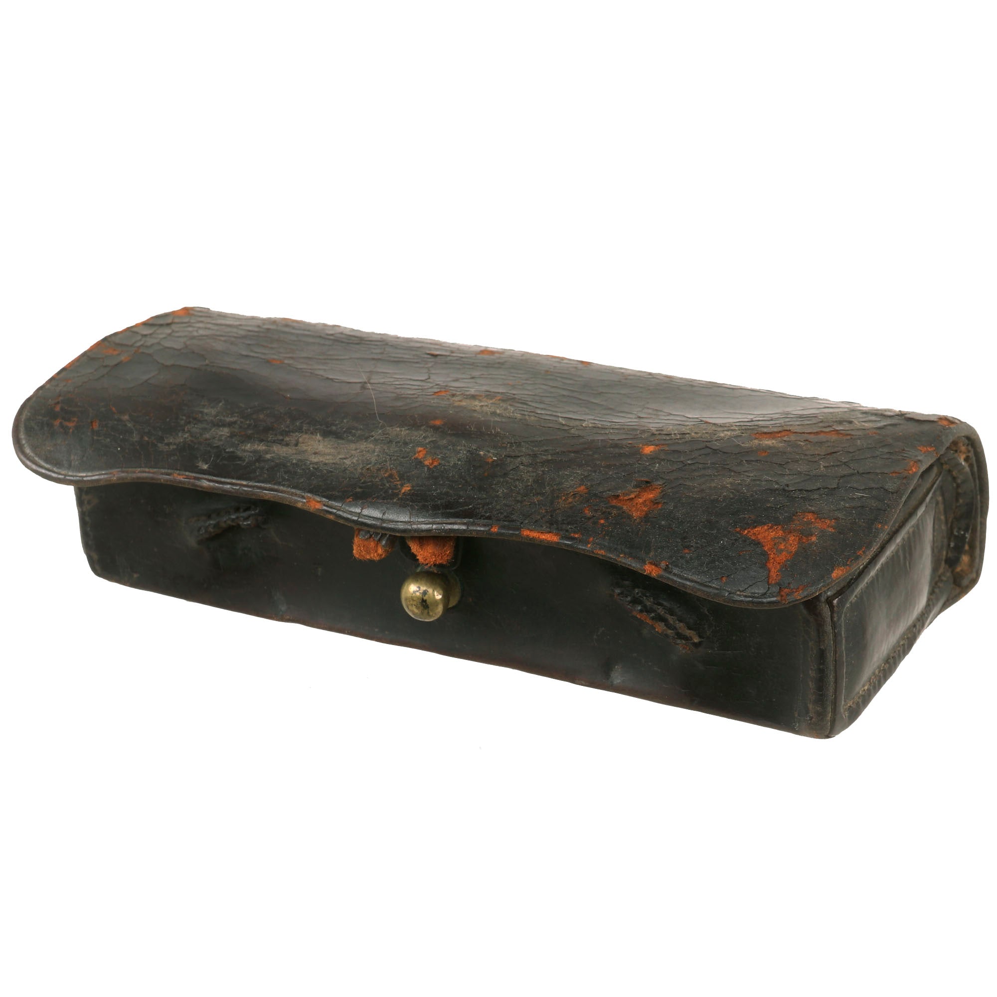 This is a nice example of a Civil War “Universal” Carbine Cartridge Box that has great color and finish. Most belt loops, buckles and tabs are in place or present, as is interior wood block bored out for twenty carbine cartridges. (Sharps Carbine rounds fit perfectly.) The cover shows some minor crazing from flexing and the reverse shows some handling marks. The tabs and inner flap show a deep luster. Measures approximately 8" x 3 1/2" x 2 1/2".