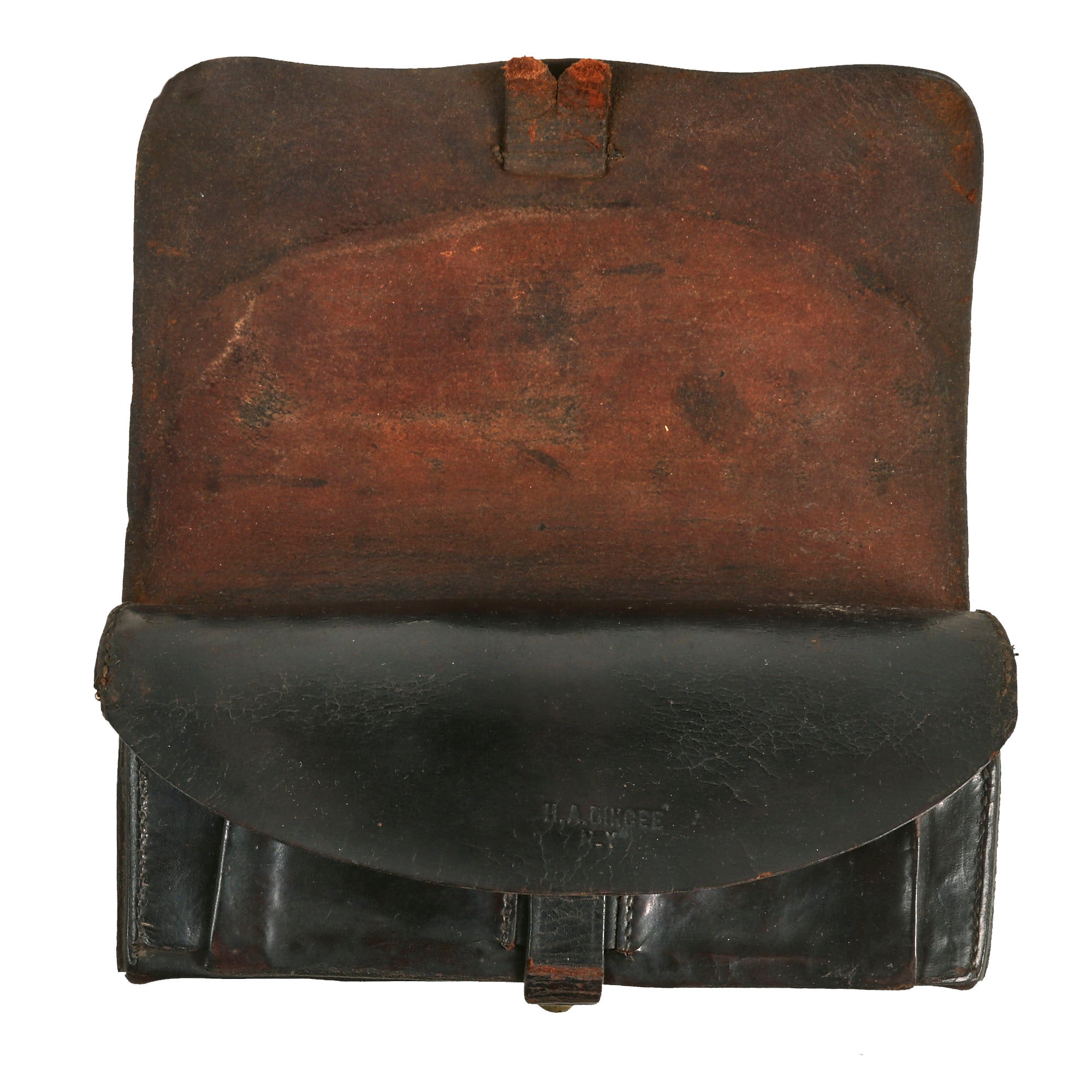 The interior flap is marked with H.A. DINGEE NY. The Dingee family of New York City was heavily involved in making and supplying U.S. military accouterments and insignia for the first half of the nineteenth century. Henry A. Dingee and a half-brother took over the business in the mid-1840s, and Henry continued to have army contracts into the 1850s and the war boosted business. In 1861 alone H.A. Dingee had contracts for more than 10,000 infantry cartridge boxes.