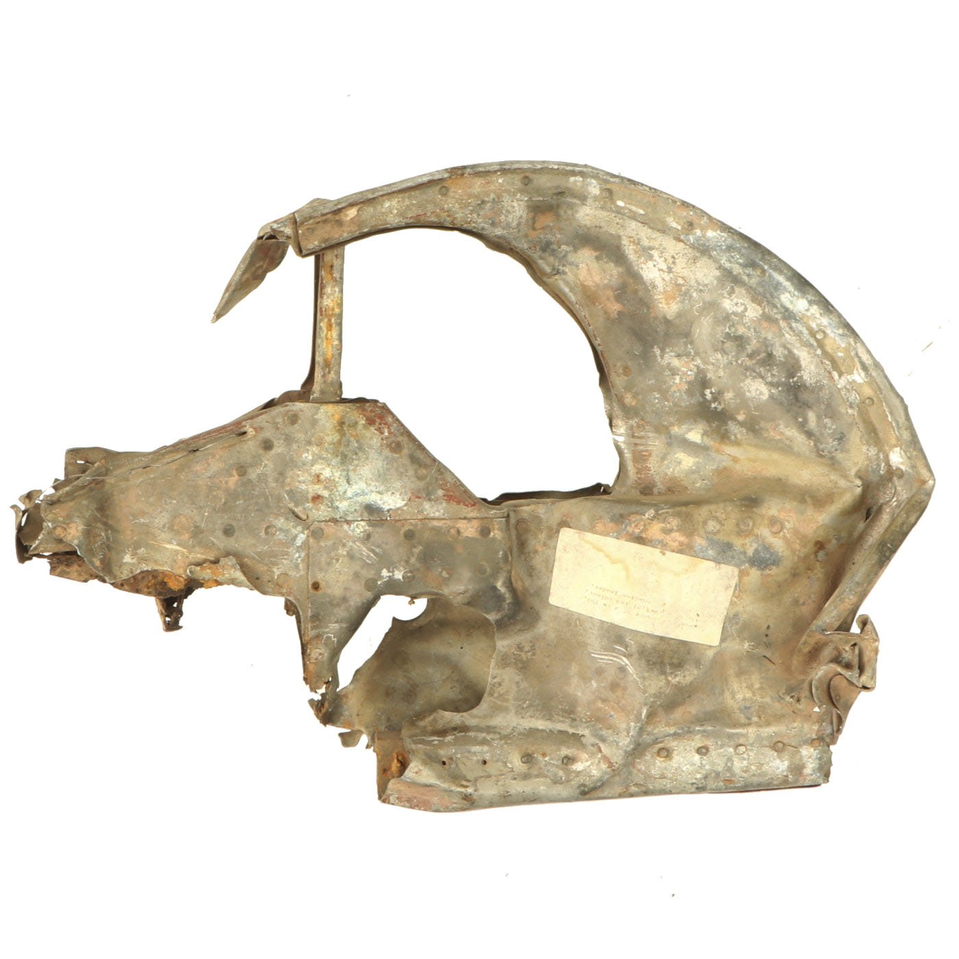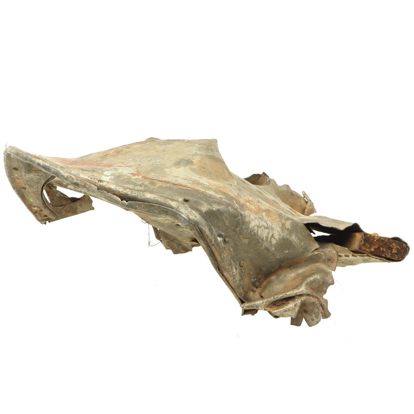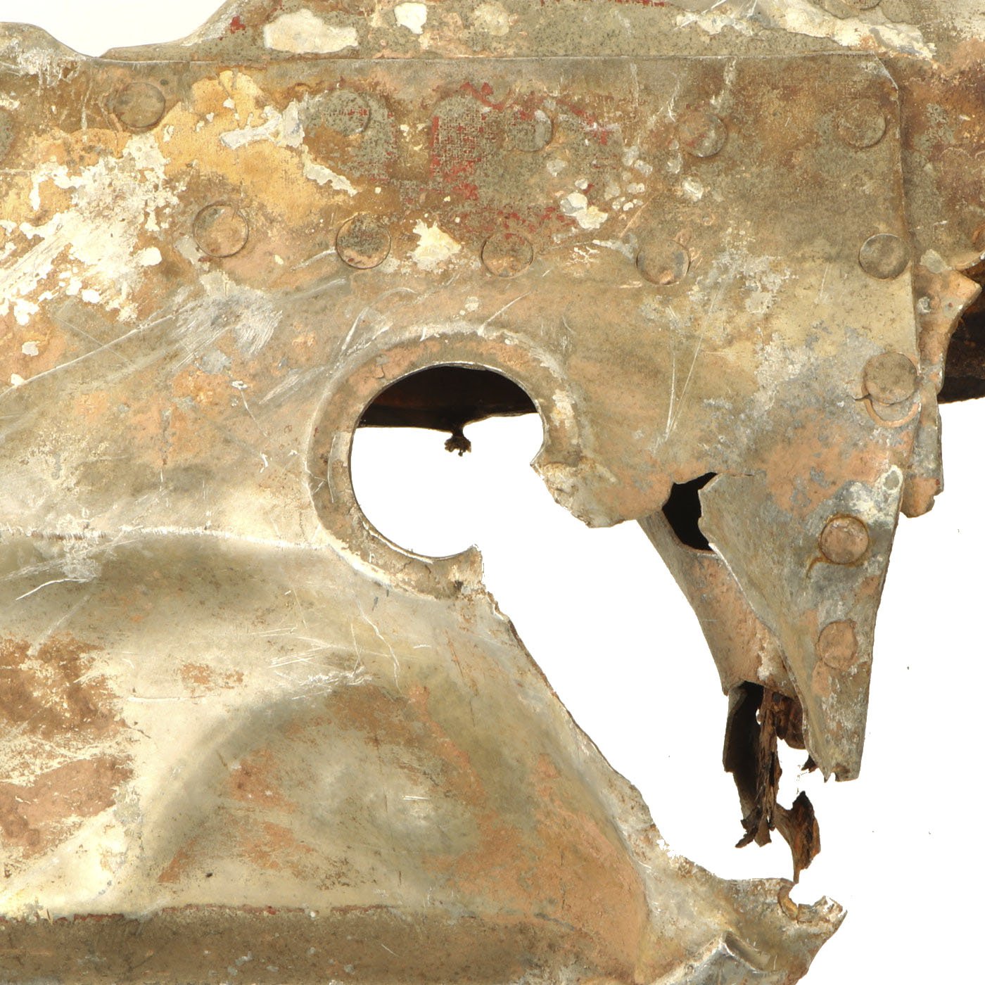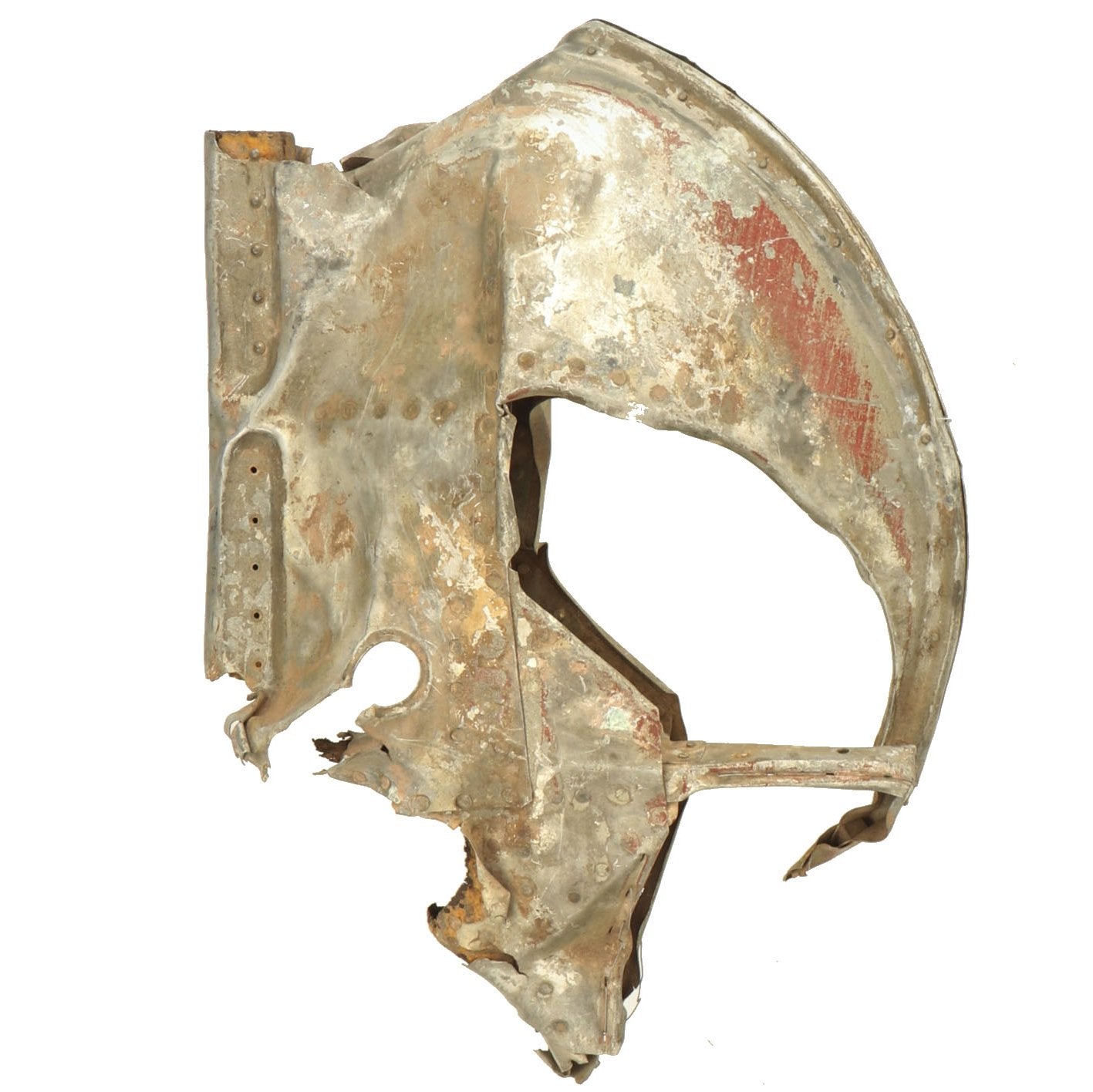 This is a piece of a Messerschmitt Bf 109 aircraft. We were told it is from the "tail section" which if that is the case it would then appear to be the top section de to the curved edge. This piece measures approximately 22" x 15".