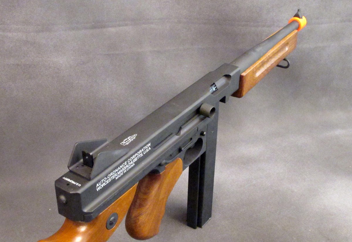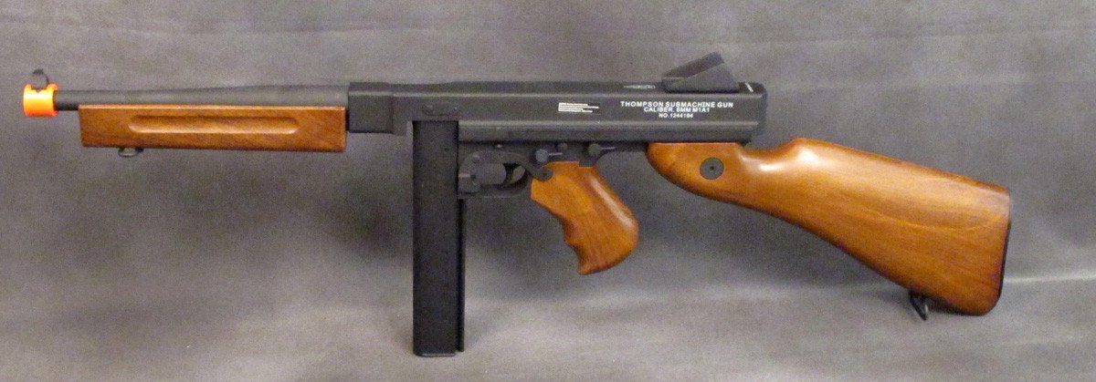 The Thompson submachine gun is an American submachine gun, invented by John T. Thompson in 1919 that became infamous during the Prohibition era. It was a common sight of the time, being used by both law enforcement officers and criminals.[1] The Thompson was also known informally as: the "Tommy Gun," the "Trench Broom," the "Trench Sweeper," the "Chicago Piano," the "Chicago Typewriter," and the "Chopper." The Thompson was favored by soldiers, criminals and police alike for its ergonomics, compactness, large .45 ACP cartridge, and high volume of automatic fire and among civilian collectors for its historical significance. This replica is true to the original and comes complete with horizontal foregrip, side cocking indicator and smooth barrel. The SMG also boasts an adjustable rear sight, steel gears, a metal gearbox, and a high-cap stick magazine. The rifle is powered by the included NiMH battery and includes a charger. The rifle can go from semi automatic to full automatic with the flip of a switch!