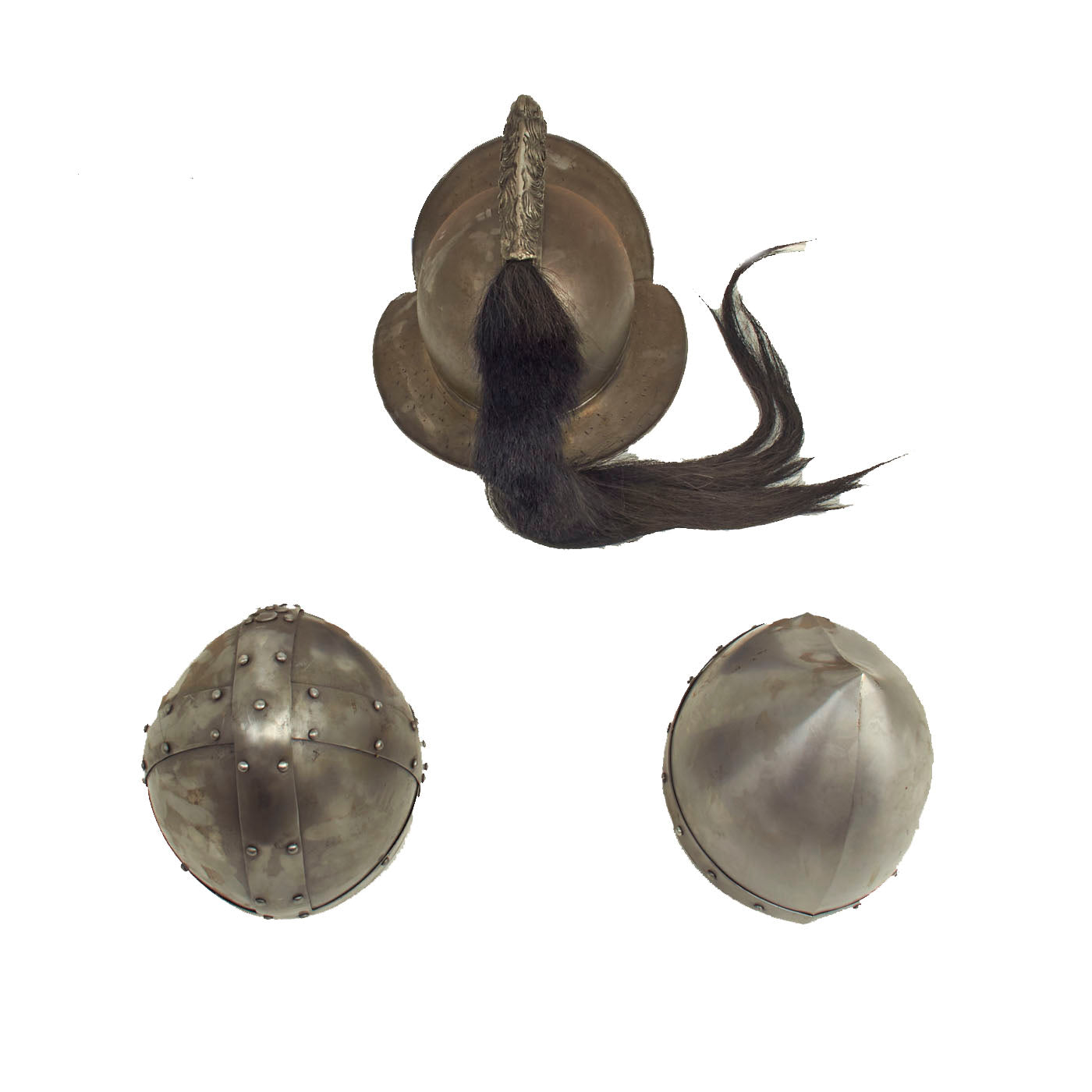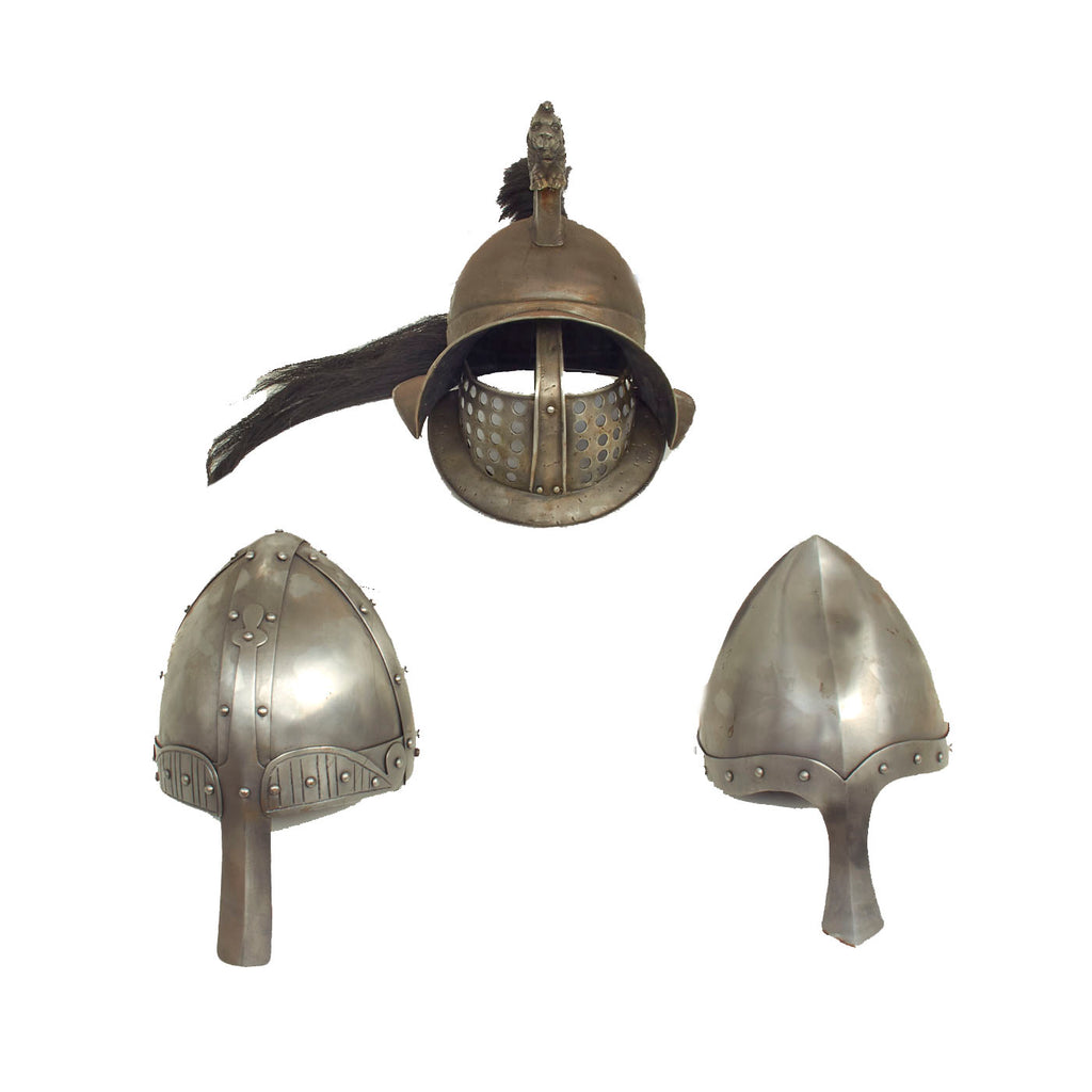 New Made Items: Only One Lot of 3 Available. Just recently discovered in the back of our warehouse here at IMA are 3 wonderful ancient style helmets! These are relatively new made items and come complete with leather lining and padding on the insides.