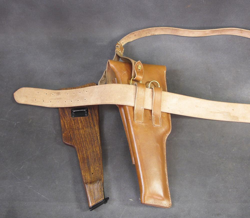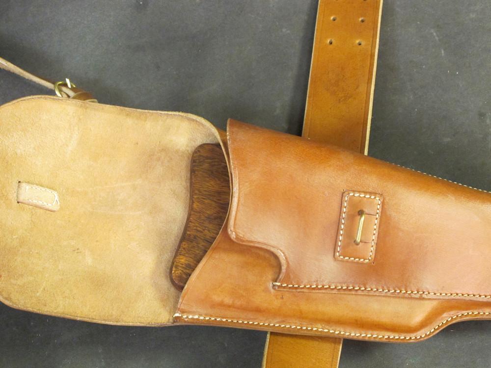 The shoulder board was contained in a rear pocket of the quality genuine brown leather holster set which was fitted with two brass suspension rings and substantial belt loops for use with Sam Browne style Belt that is included.