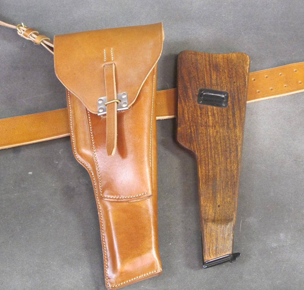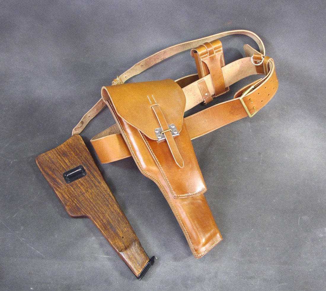 New Made Item: Never before available this is a top quality reproduction of this extremely rare First Model Stock and Harness Set used by the Belgians with the first issue of the P-1935 Browning High Power Pistol. Issued with Stock lug slot to rear of grip frame, later copied on the Canadian Inglis High Power Pistols, this used a wooden shoulder board similar to the WW1 Luger Pistols.