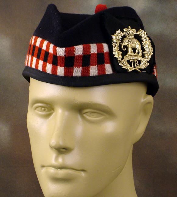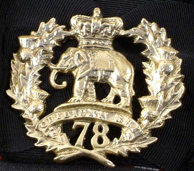 Original Item: 78th Regiment The Rosshire Buffs raised in 1793 this Scottish Regiment became the Sea Forth Highlanders after 1881. Crown over Elephant amid a thistle wreath with 78 cap badge on checker board glengarry.