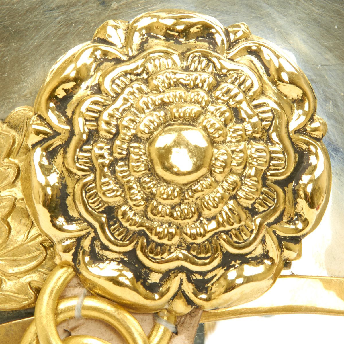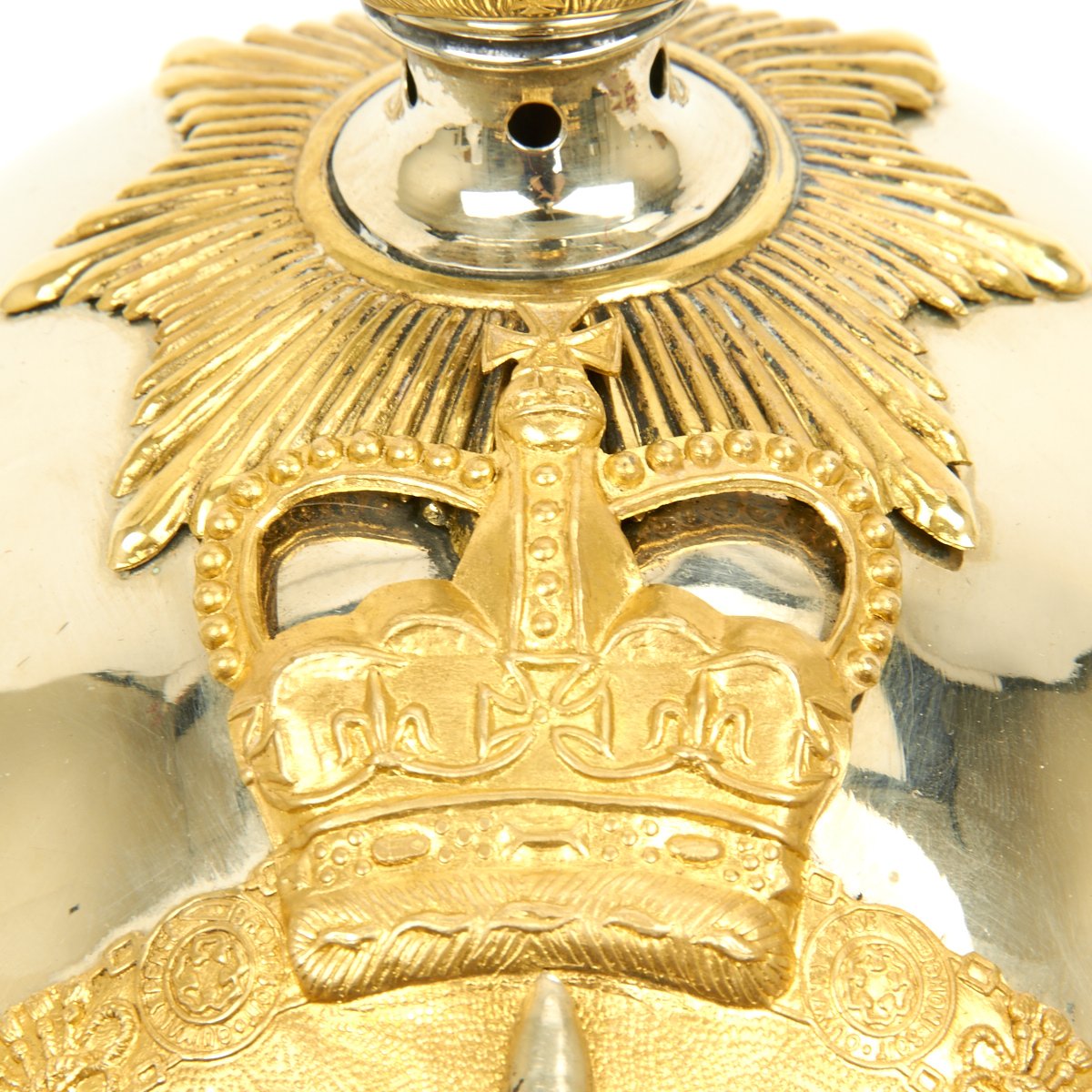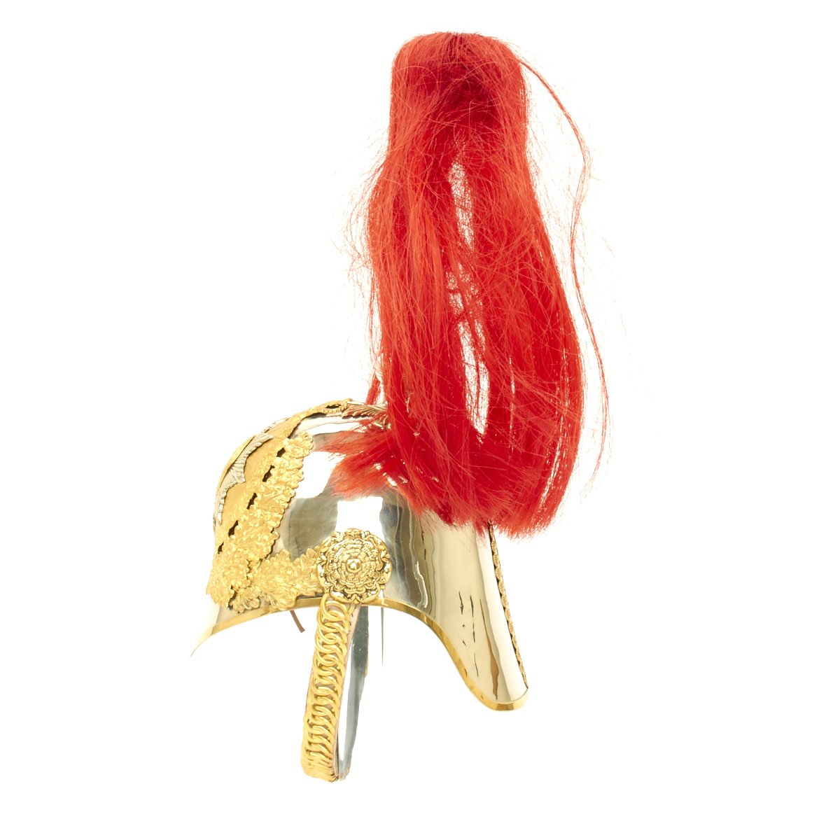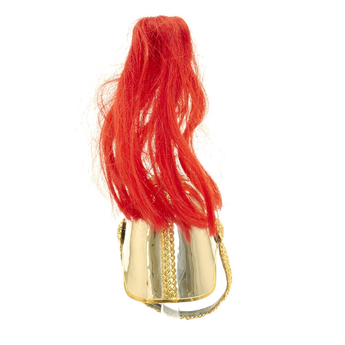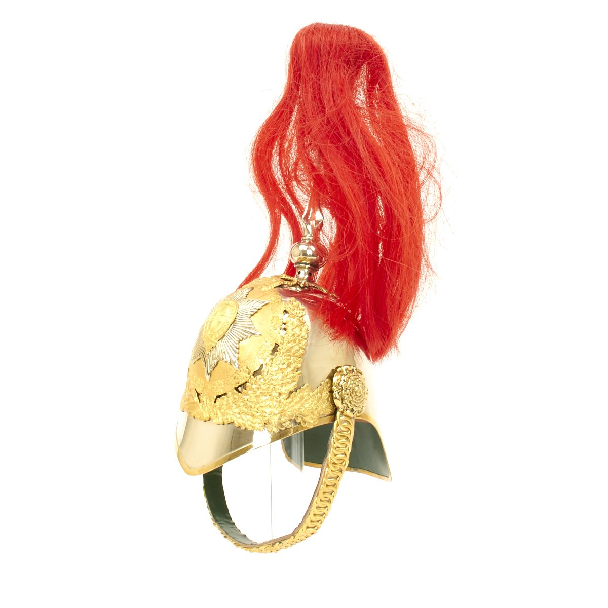 New Made Item: This is an absolutely gorgeous reproduction of the Royal Horse Guards parade helmet. It is brass and polished steel construction, with incredible attention to detail. It comes complete with a correct leather liner, brass ringed chin scales and a red dyed genuine horsehair plume. The helmet plate displays a Queen's Crown indicating military service after 1952. Fits head sizes 7 (56cm) to 7 1/2 (60cm).
