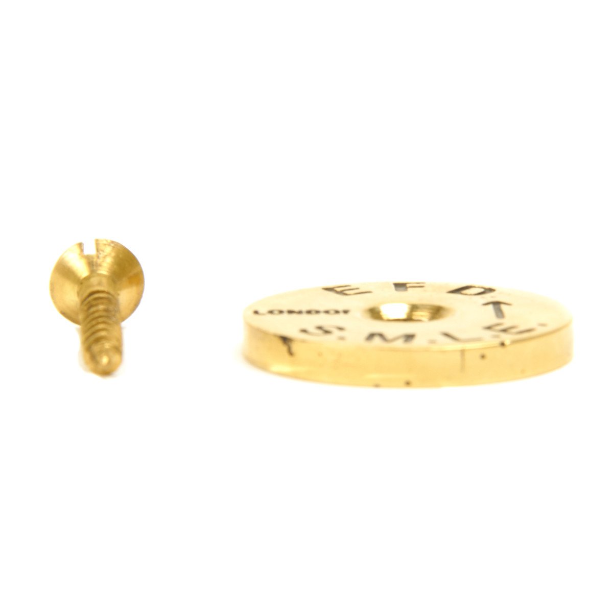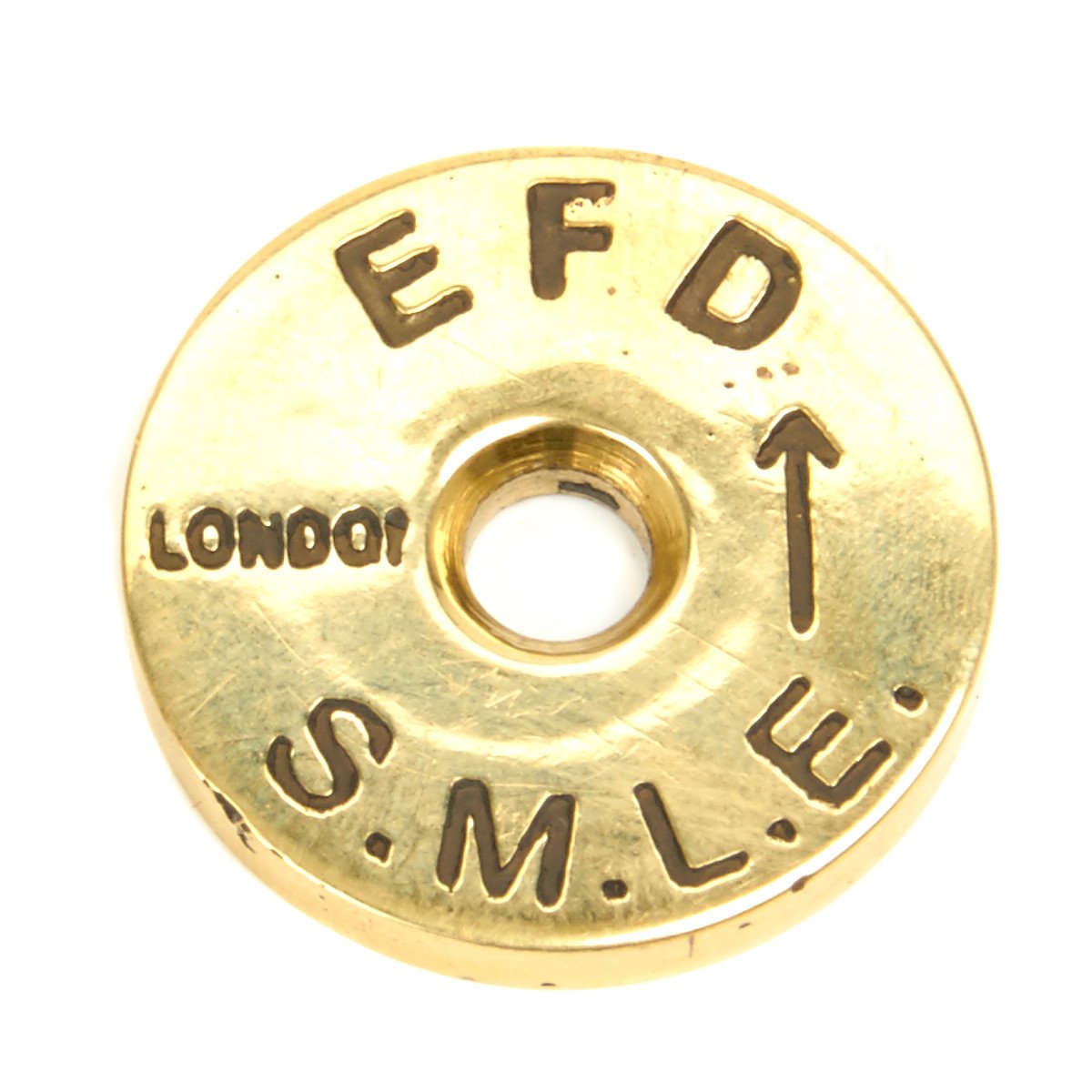 New Made: British Brass Marking Disc, complete with SMLE markings. So often missing, we have re-manufactured these steel and brass circular marking discs intended for unit and other markings found on the butts of Mauser and Enfield rifles. Approximate diameter of disc is 15/16 inches.