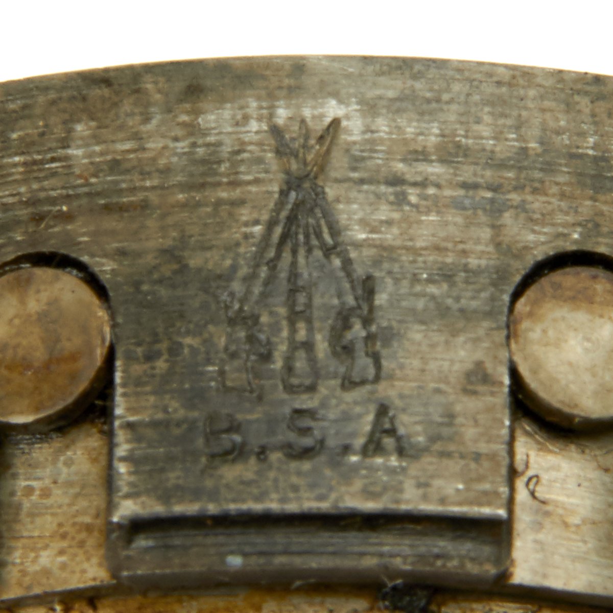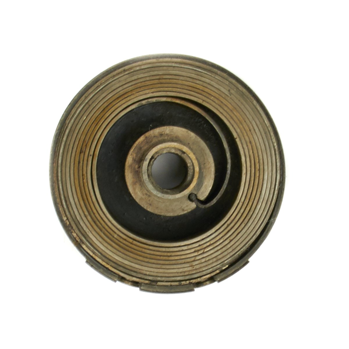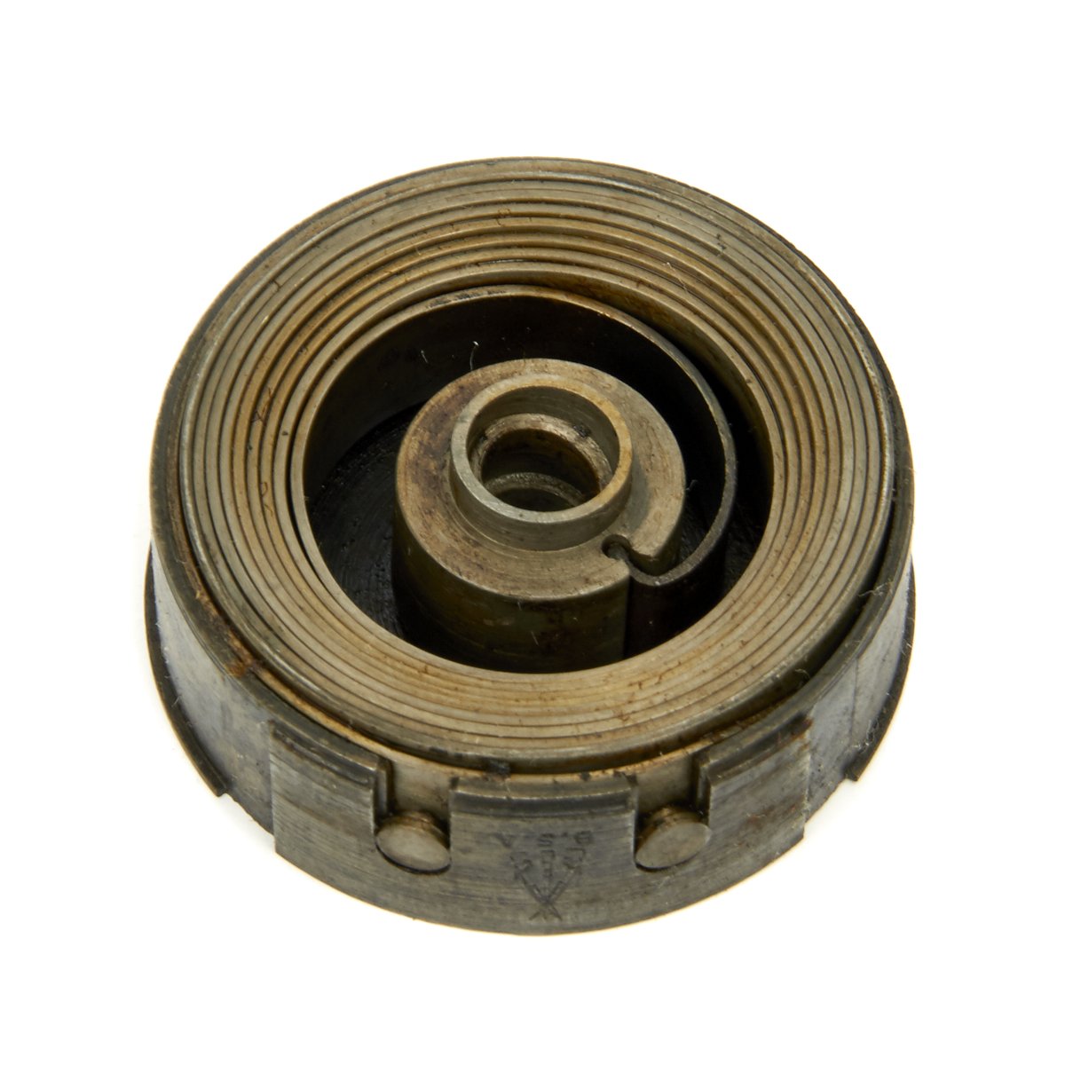 Original Item: The distinctive profile of the Lewis Light Machine Gun is due in part to its return spring, which is a spiral spring such as one finds in clocks, unlike guns that use coil springs. This return spring is housed in a semicircular housing that projects below the receiver. The assembly consists of the spring itself, the return spring casing, and the return spring hub. Our return spring assemblies are supplied in an original screw-top steel case. Three versions of the spring are available: Grade 1, which shows some use; Special Select, which appear to have little or no use; and BSA manufacture, which show the BSA logo of stacked Martini-Henry rifles with fixed bayonets. All springs, whether Select, BSA, or Grade 1, have screw-top steel cases of the same used condition.