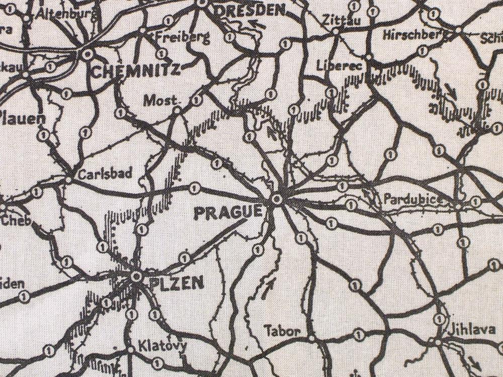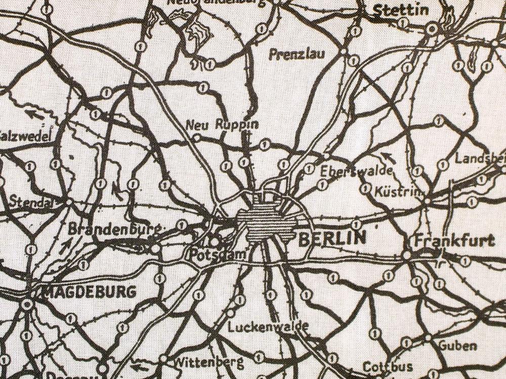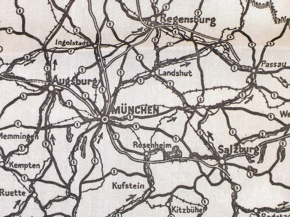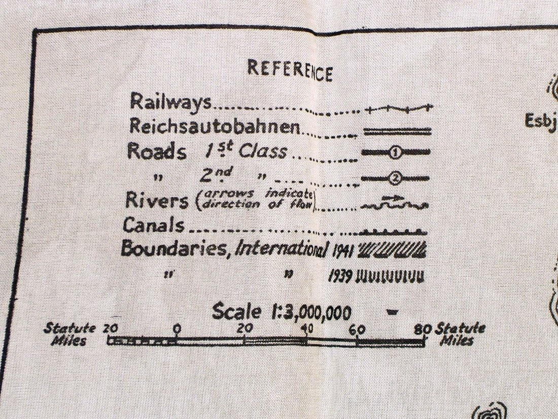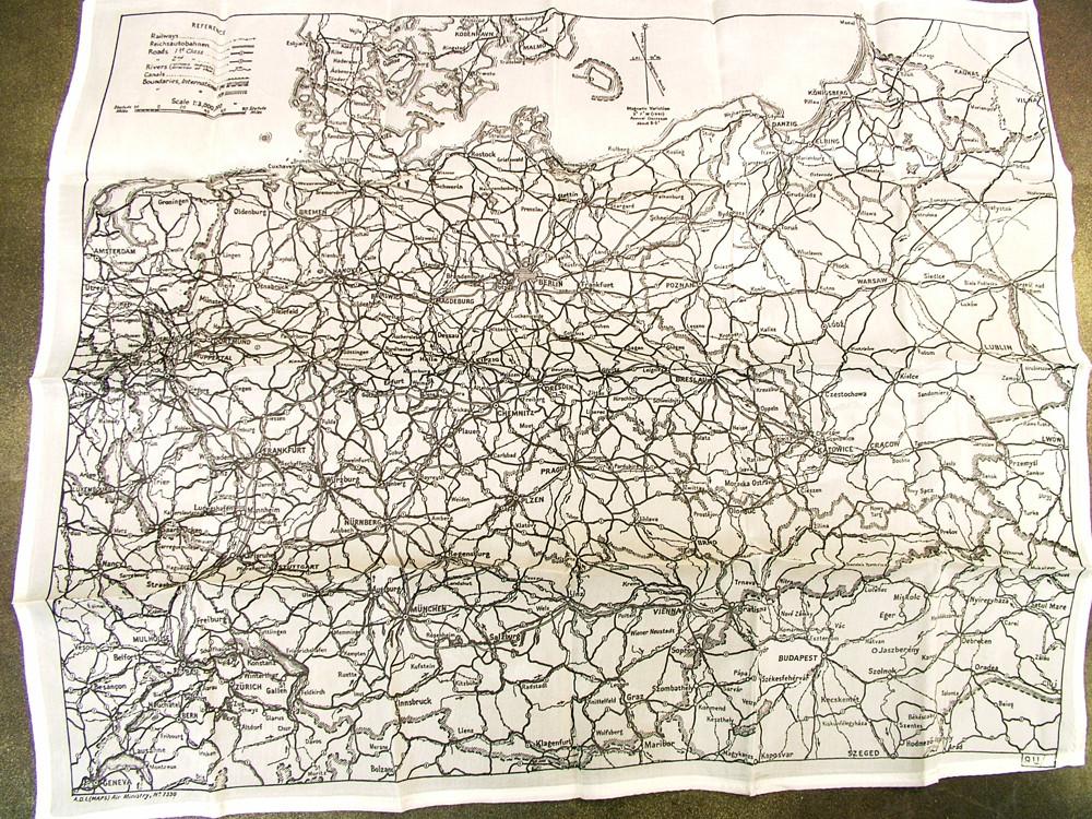 Constructed of Silk to withstand water damage and tearing, each map has a sewn selvage hem around all four sides to prevent fraying. Printed in Black and White, these cover greater Germany and parts of the immediate countries abutting the Third Reich. In addition to cities, principal roadways and railroad lines; Canals and Rivers are also shown with arrows that indicate direction of water flow as such information was invaluable to downed pilots on the run.