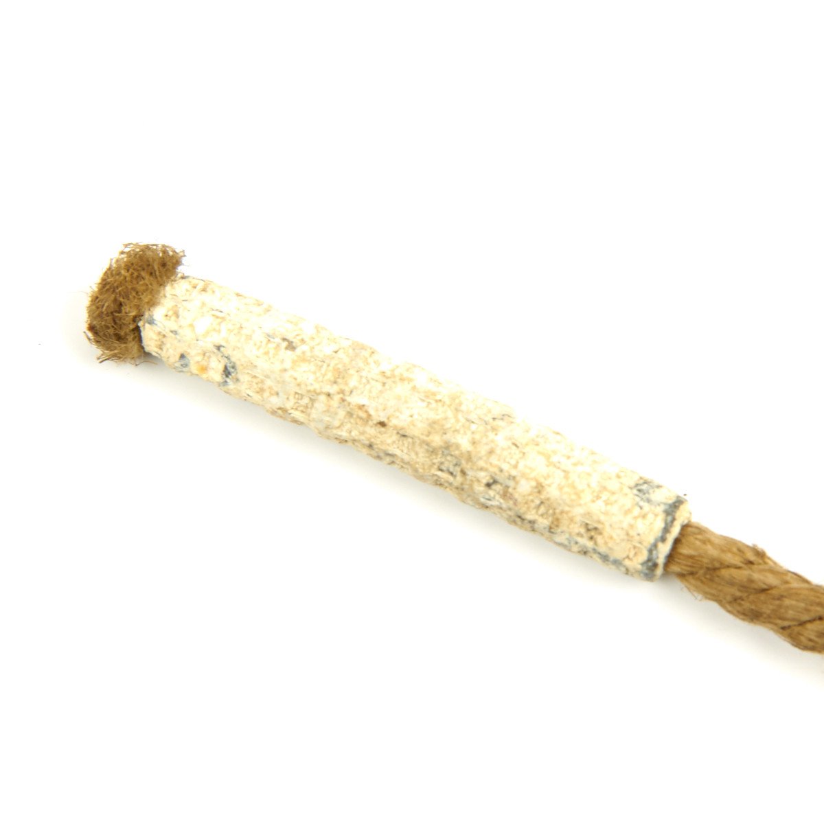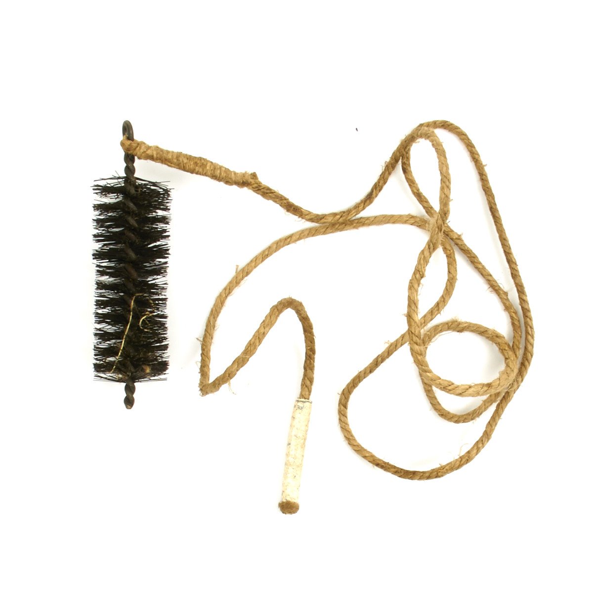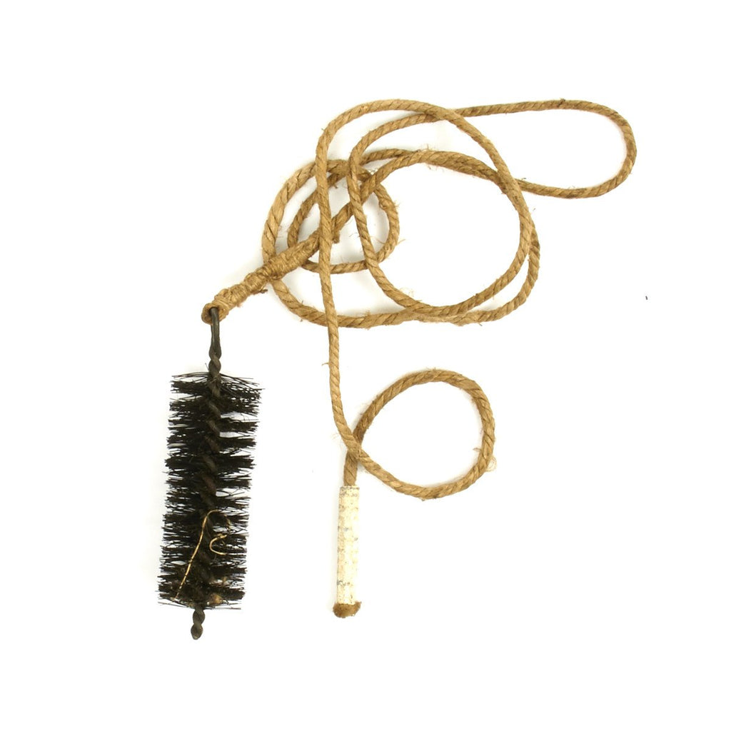 The assembly consists of a bristle brush about 1-inch in diameter attached to a fiber cord about 36 inches long. A lead weight is crimped onto the far end of the cord. The cord is attached to the brush loop with traditional whipping. We have very few of these original magazine cleaning brushes. Most look to be unissued.