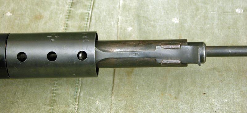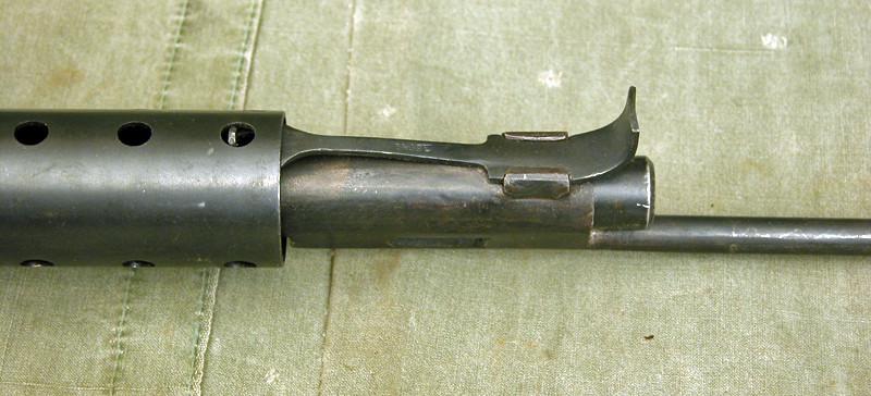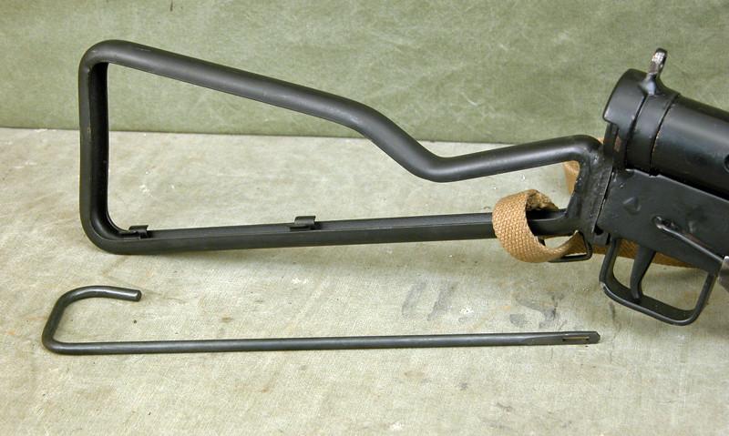 The Mk II was the most widely distributed of the various Sten models, and was featured in numerous motion pictures, including the marquee poster for the great The Bridge On The River Kwai. This sample has the popular No. 3 Mk. 1 loop butt stock, fitted with the Sten cleaning rod in spring clips, and also has the original cocking handle with the protective flange but without the safety projection.