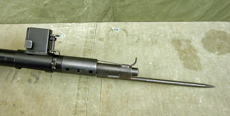The magazine housing is marked STEN MK II and fe 56719. The f indicates manufacture at Royal Ordnance Factory (6) at Fazakerley, and the serial itself is e56719. This piece includes an original unissued Sling, Carbine, Sten, Mk 2, and a replica Mk II Sten bayonet with original scabbard. It also includes a set of the original internal parts, including the Mk II bolt, recoil spring, recoil spring guide, and recoil spring cap.