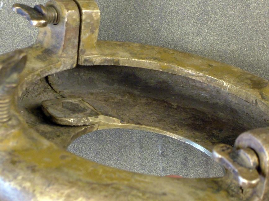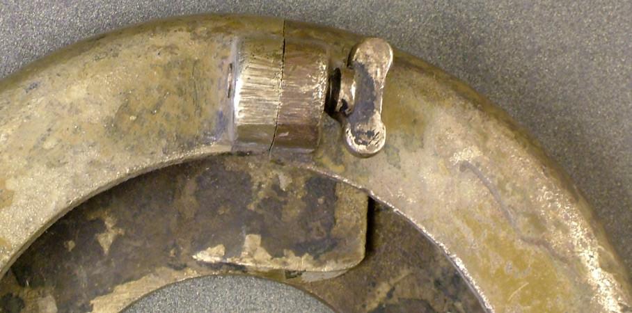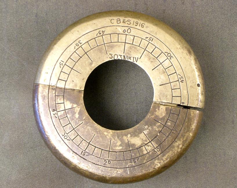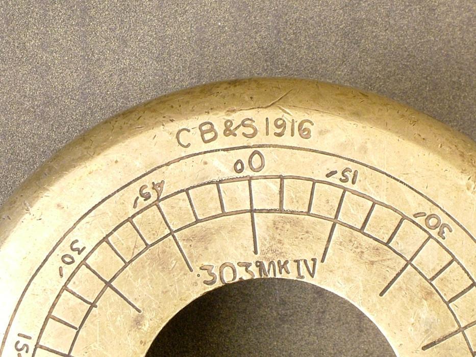 Original Item: Elevating dials were used until 1918, when they were removed and scrapped. They were replaced by indicating marks place directly on the elevating wheel itself. They are very rarely seen. See Dolf Goldsmith, The Grand Old Lady of No Man?s Land, page 463. The dial is made in two haves which screw together and clamp to the elevating wheel. In our trials, they only fit onto brass elevating wheels. The steel wheels are apparently a little larger. Since most of the elevating dials were scrapped, few have survived. IMA has only two.