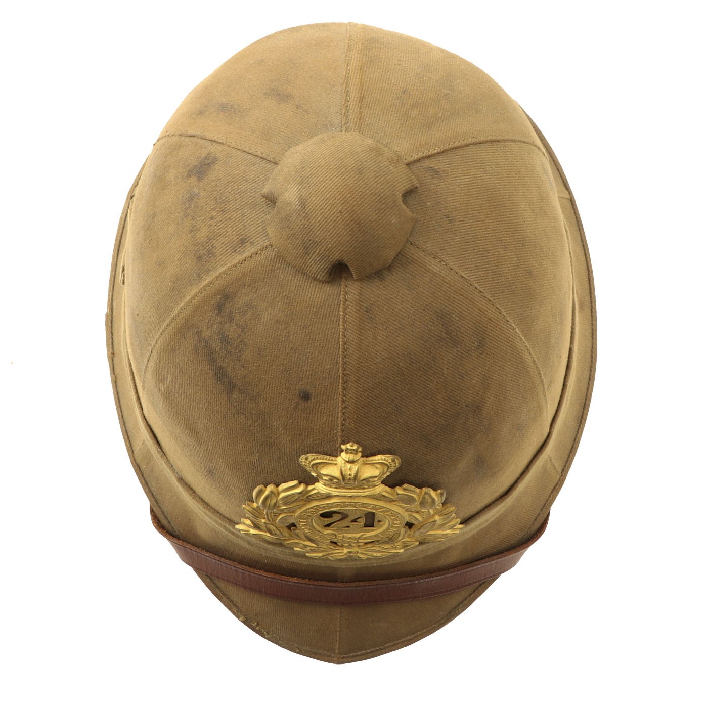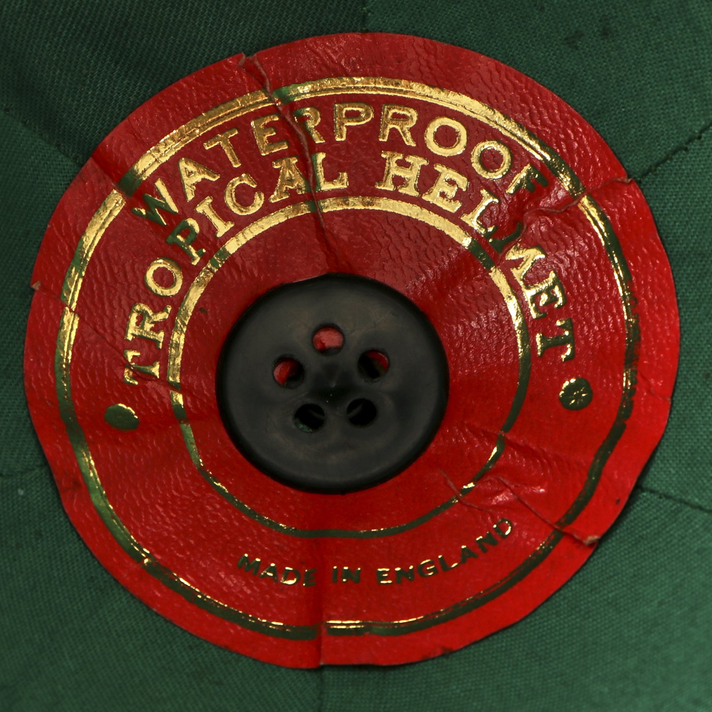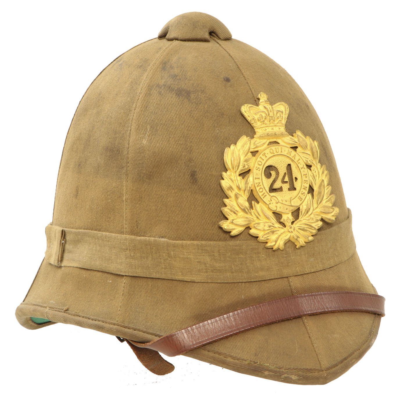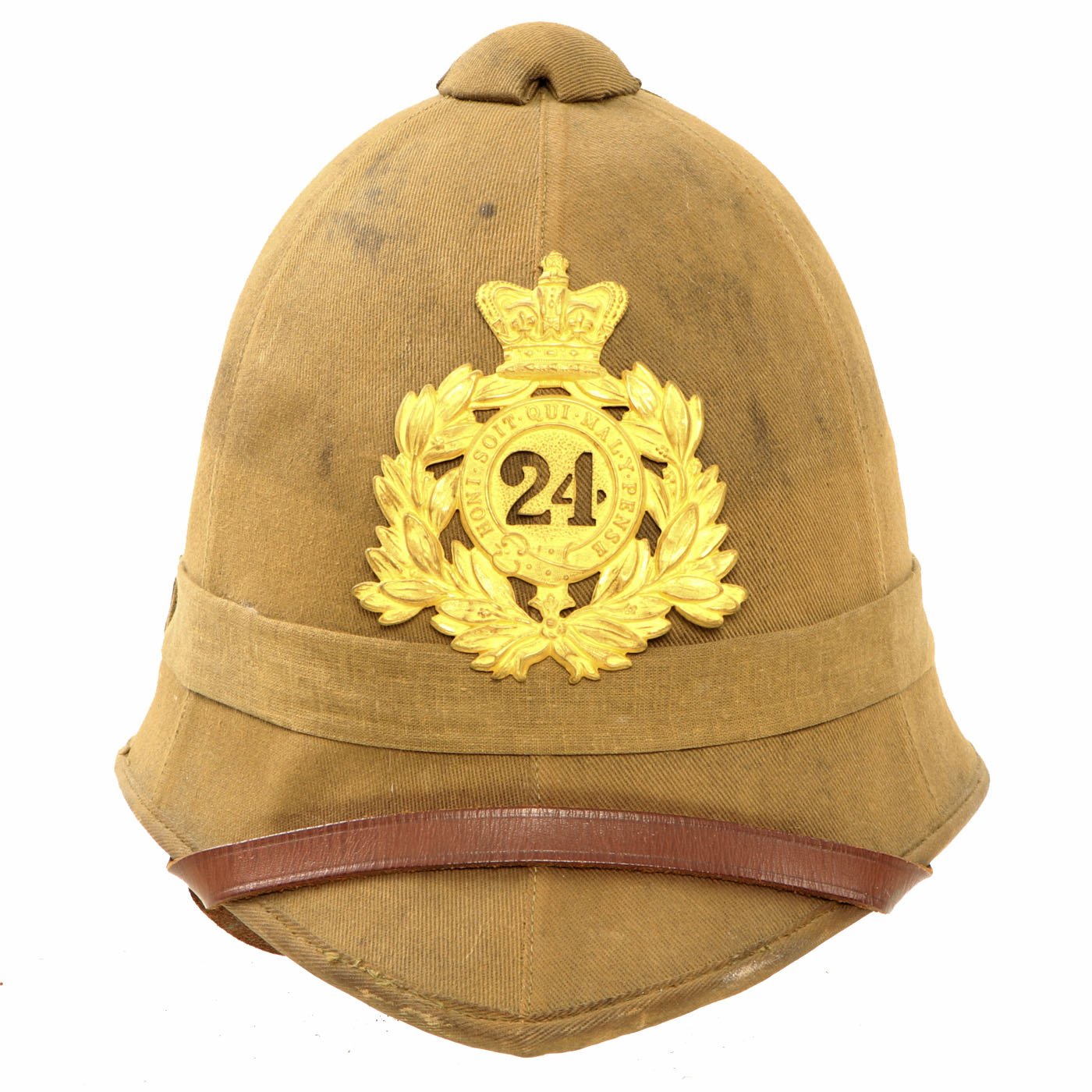 - Vintage Reproduction helmet, probably 50 years old. This is a high quality pith helmet marked in the interior Waterproof Tropical Helmet Made In England. It features a quality Victorian era 24th Regiment of Foot helmet plate. The helmet is approximately a size 7 1/2 US (60cm). Nicely aged making it perfect for display or historical reenactment.