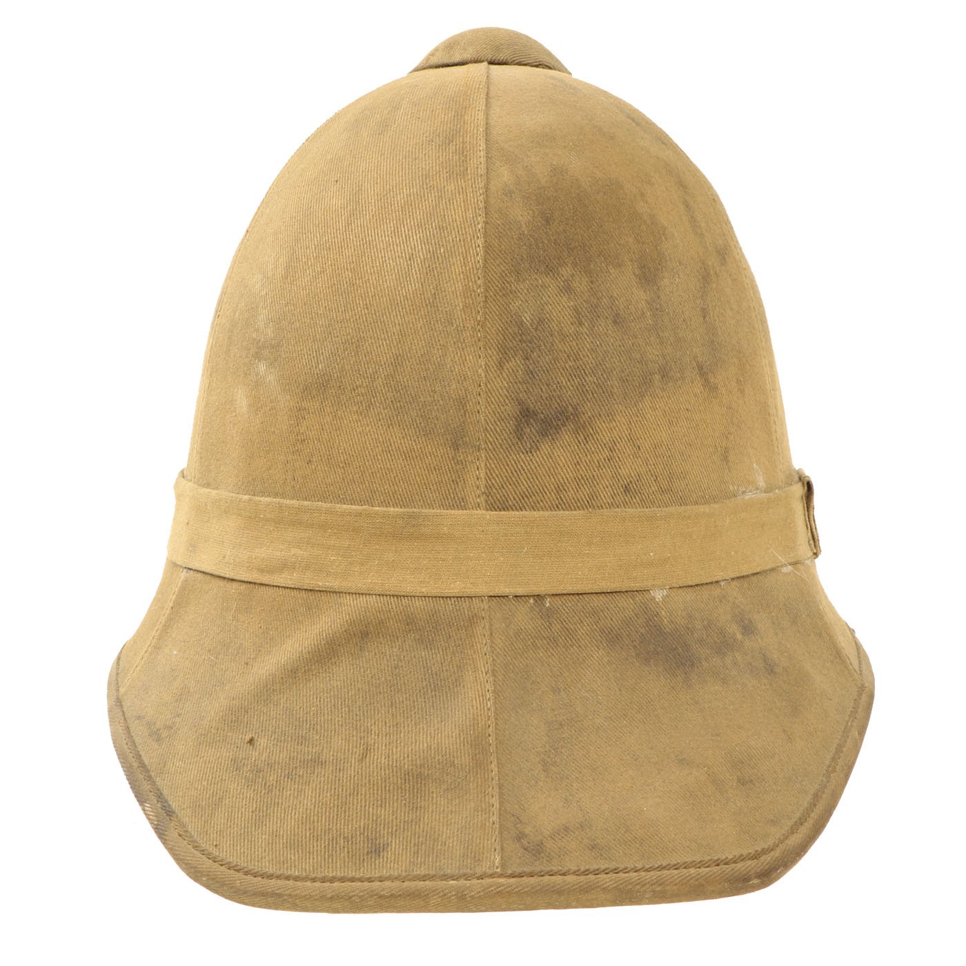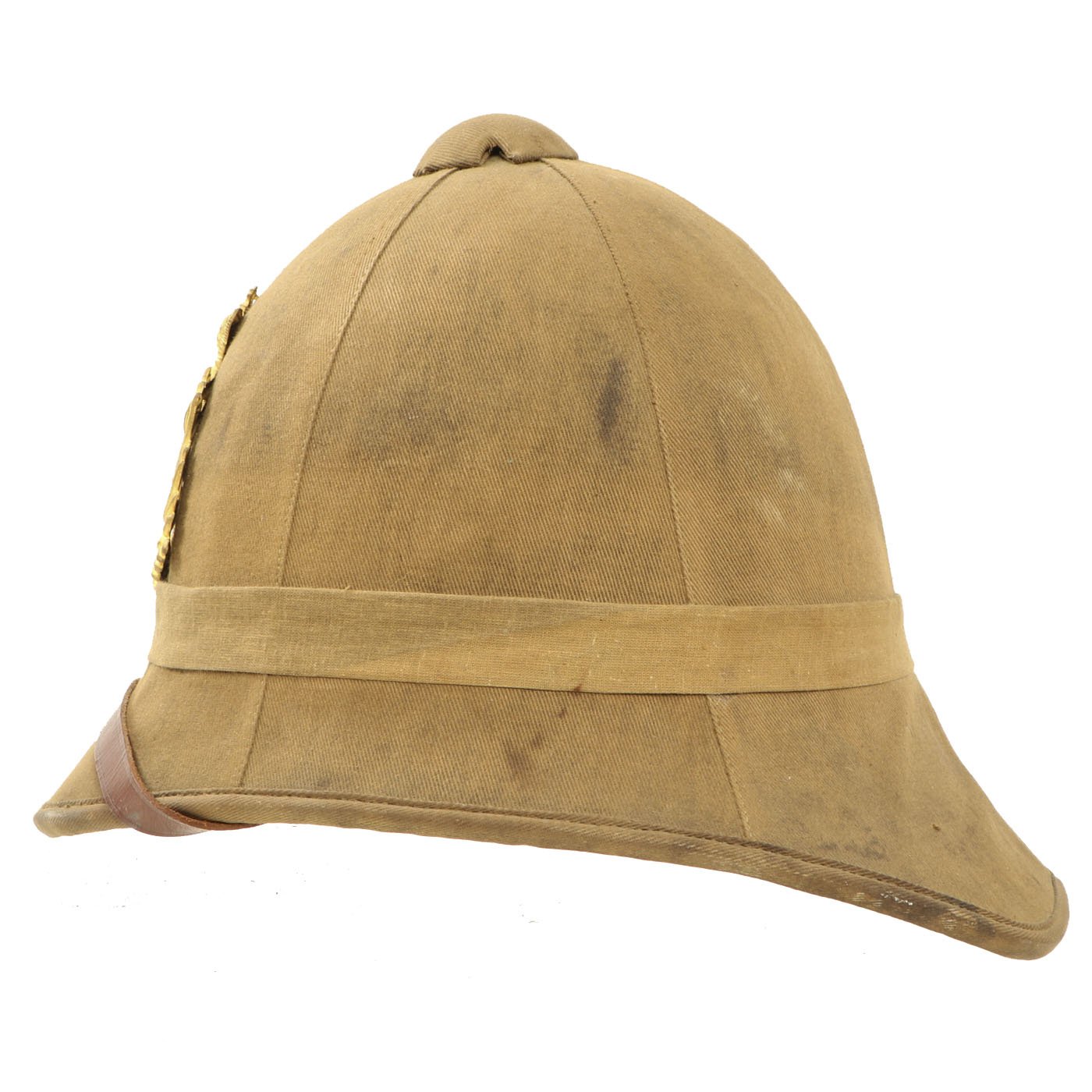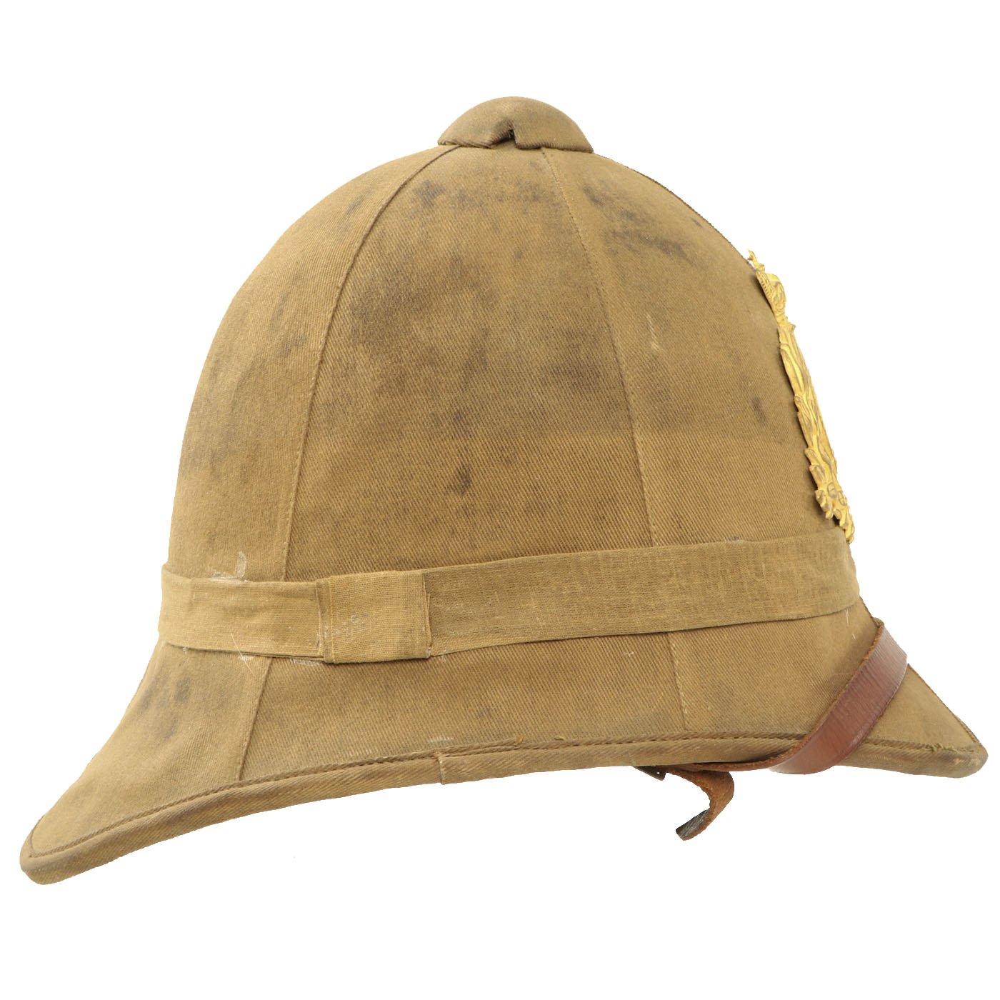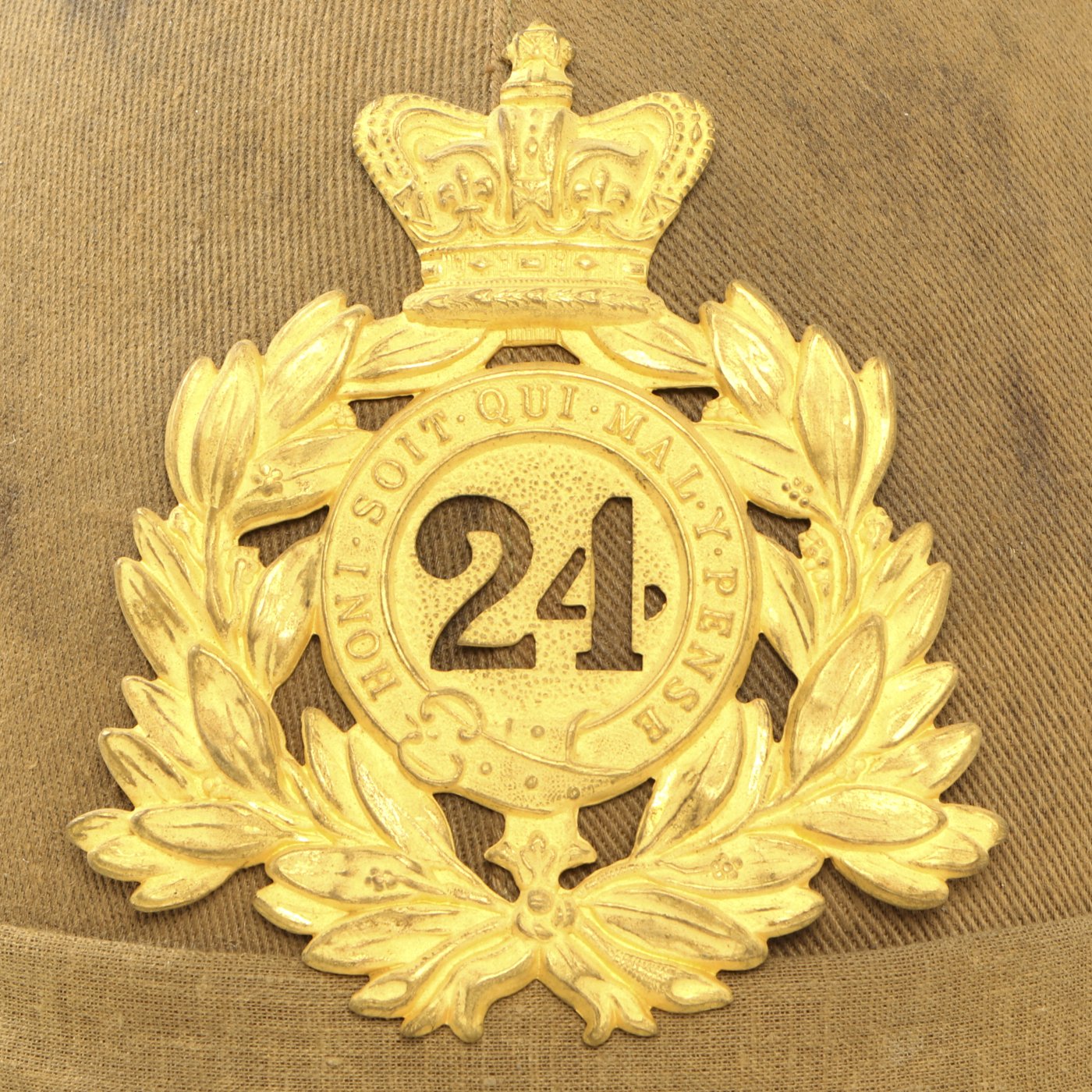 - Vintage Reproduction helmet, probably 50 years old. This is a high quality pith helmet marked in the interior Waterproof Tropical Helmet Made In England. It features a quality Victorian era 24th Regiment of Foot helmet plate. The helmet is approximately a size 7 1/2 US (60cm). Nicely aged making it perfect for display or historical reenactment.