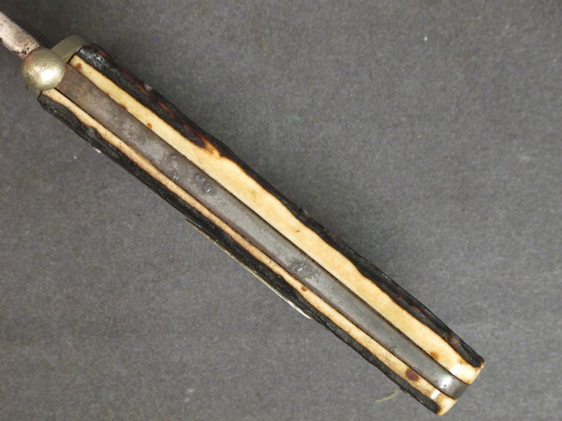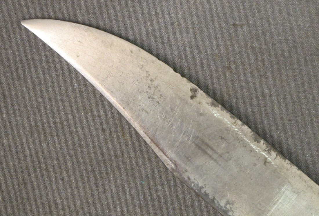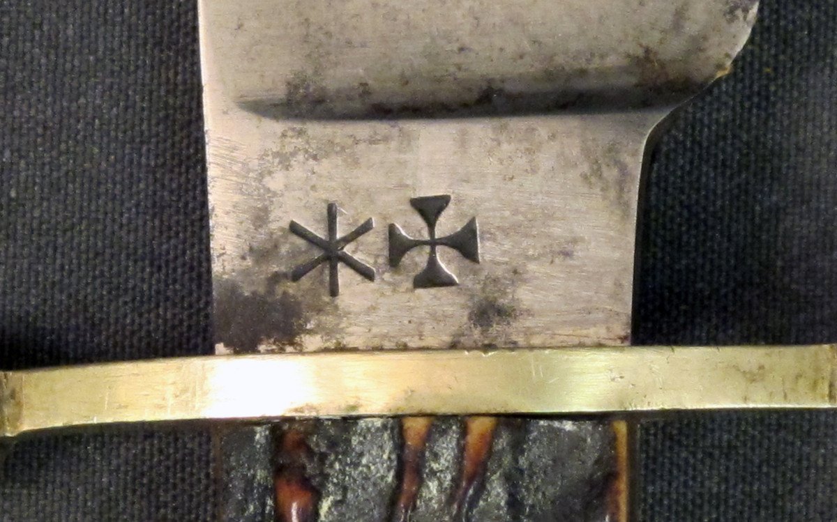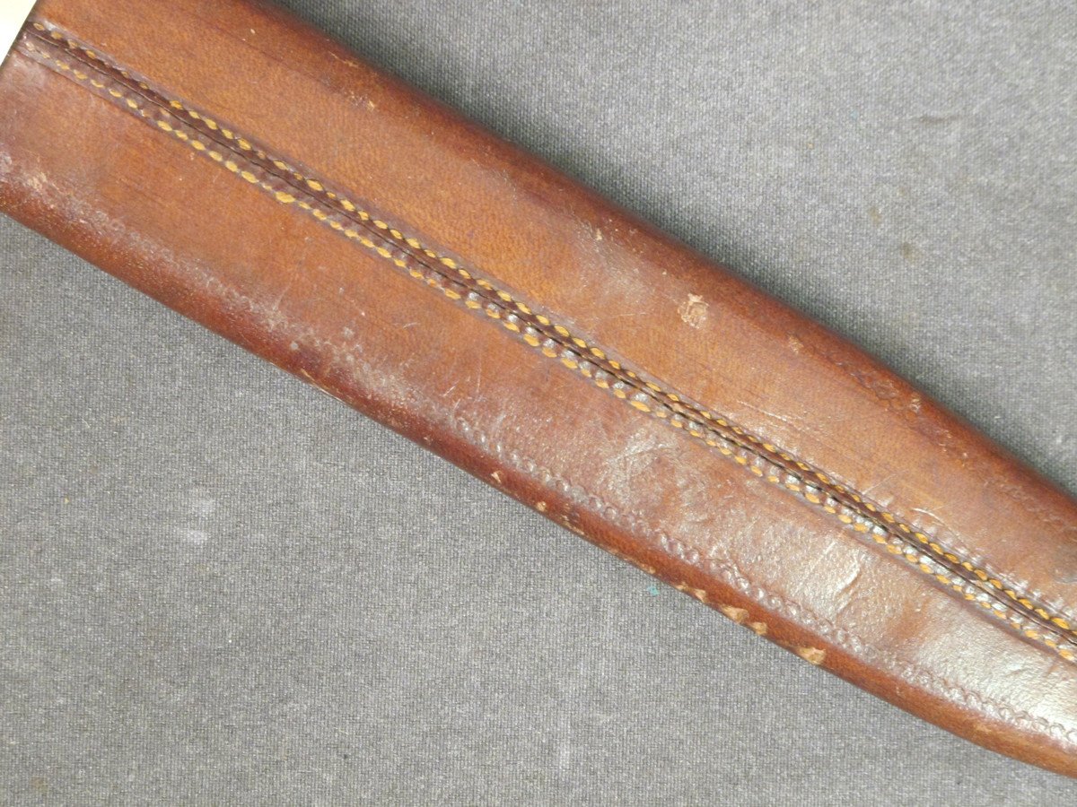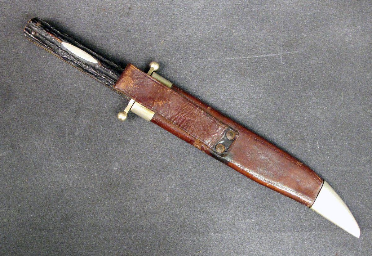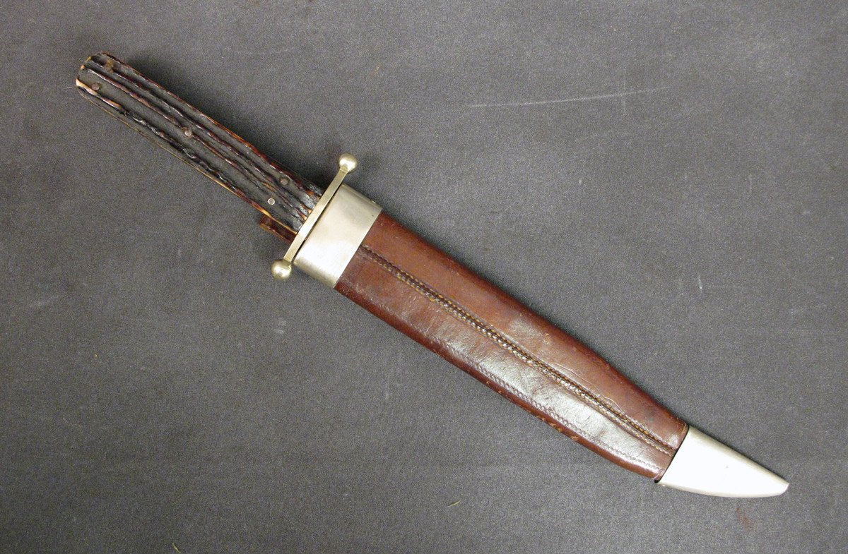 Complete with brown leather Scabbard with German Silver top and bottom mounts and leather Belt Loop. Some age spots to blade illustrating that it is probably 125 years of age.
