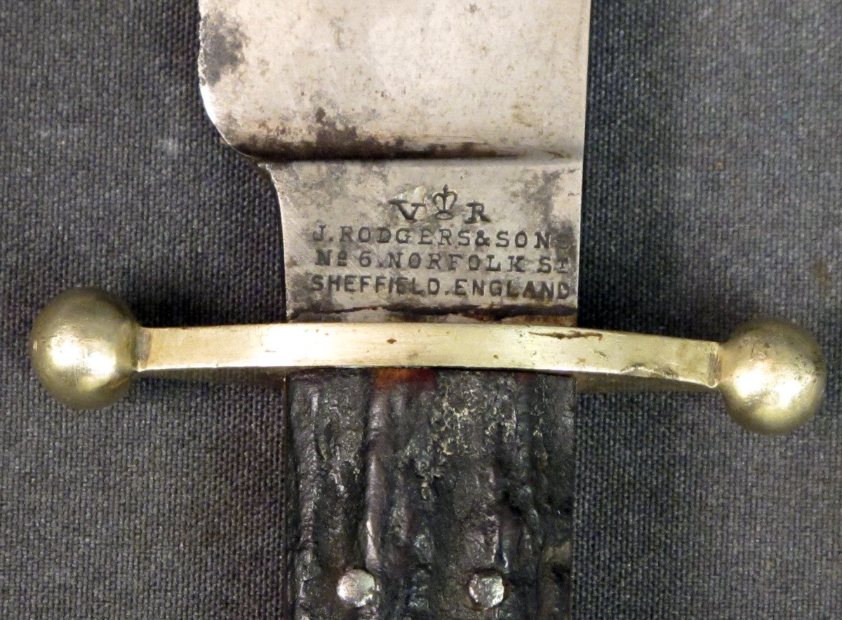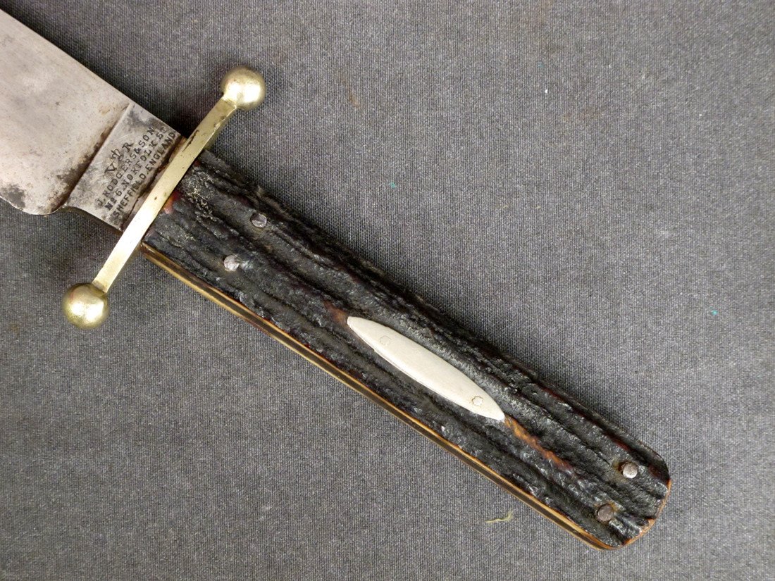 Original Item: Only One Available. Well, this is a real classic! Marked "Crown" over "V.R.", "J. RODGERS & SON, No. 6 NORFOLK ST., SHEFFIELD, ENGLAND this wonderful knife is still fitted with the original Stag Horn Grips, 8" Bowie Blade and measures 12.5" in overall length with a German Silver Crossguard.