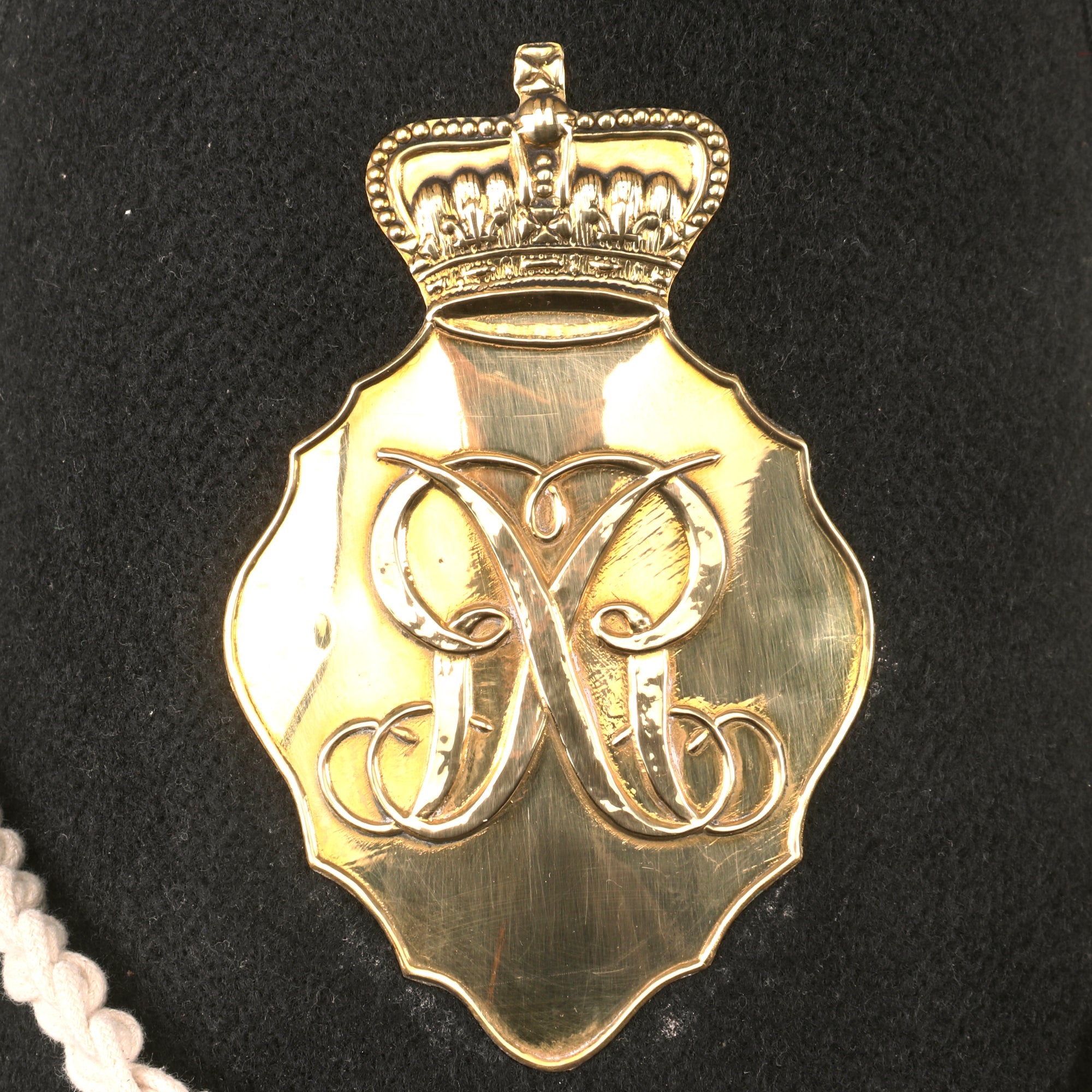 A top quality 1812 pattern English infantry soldier’s cap as worn by the majority of British foot-soldiers at the Battle of Waterloo. Often referred to as the Belgic shako, these were a short-lived design. The shakos bear a brass plate in front which has a crown and “GR” cipher, the royal symbol of Britain’s King George III (in Latin, “rex” means “king”). A japanned leather peak complete the cap. The white cord and tassels complement the caps well connected to a cockade on the left side.