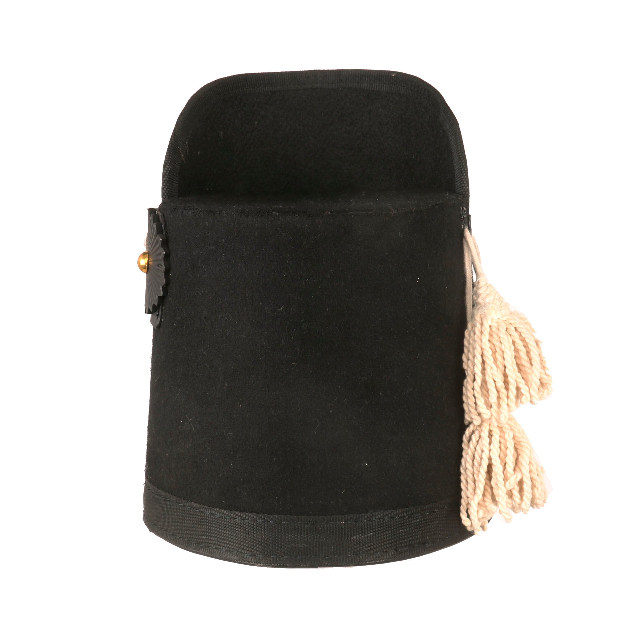 The new British cap retained several features from the old stovepipe design.  The body of the hat was still made from stiffened blocked wool felt. Inside, the linen cap bag was stitched at the edge to the thin leather band that transitioned from the outside to the inside of the cap at the bottom edge. The company affiliation was still denoted by the coloured worsted tufts: white over red for Battalion companies, green for the Light company and white for the Grenadier company.  At the base of the tuft there was still the black tooled leather Hanoverian cockade with regimental button.  However, the placement of the tuft and cockade had been moved to the left side of the hat to make way for the false front.  The body of the new design was about six and one half inches tall, but across the front of the cap was an eight and a quarter inch high tombstone shaped piece of felt.  It was bound in black worsted tape and bore a brass plate in the shape of a crowned baroque shield.  On the shield was the regimental number or name of the unit.  Running from the base of the plume across the front of the cap under the plate and terminating on the right side were worsted cords.  Grenadiers and Battalion men had white cords, but Light companies often preferred green.  The Light companies in 1814 were ordered to wear a bugle badge and regimental number in place of the baroque plate.