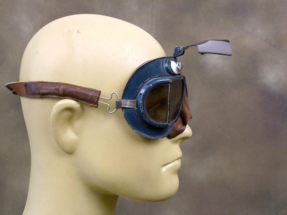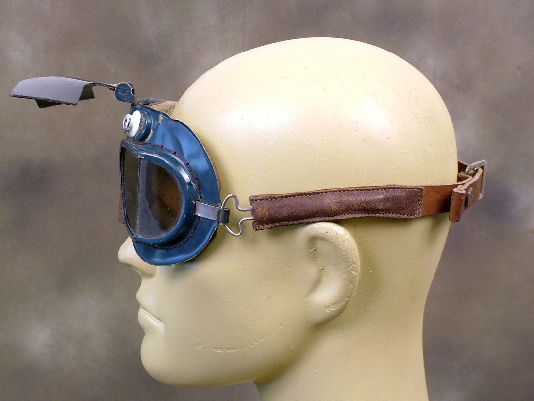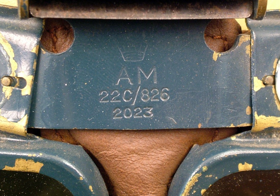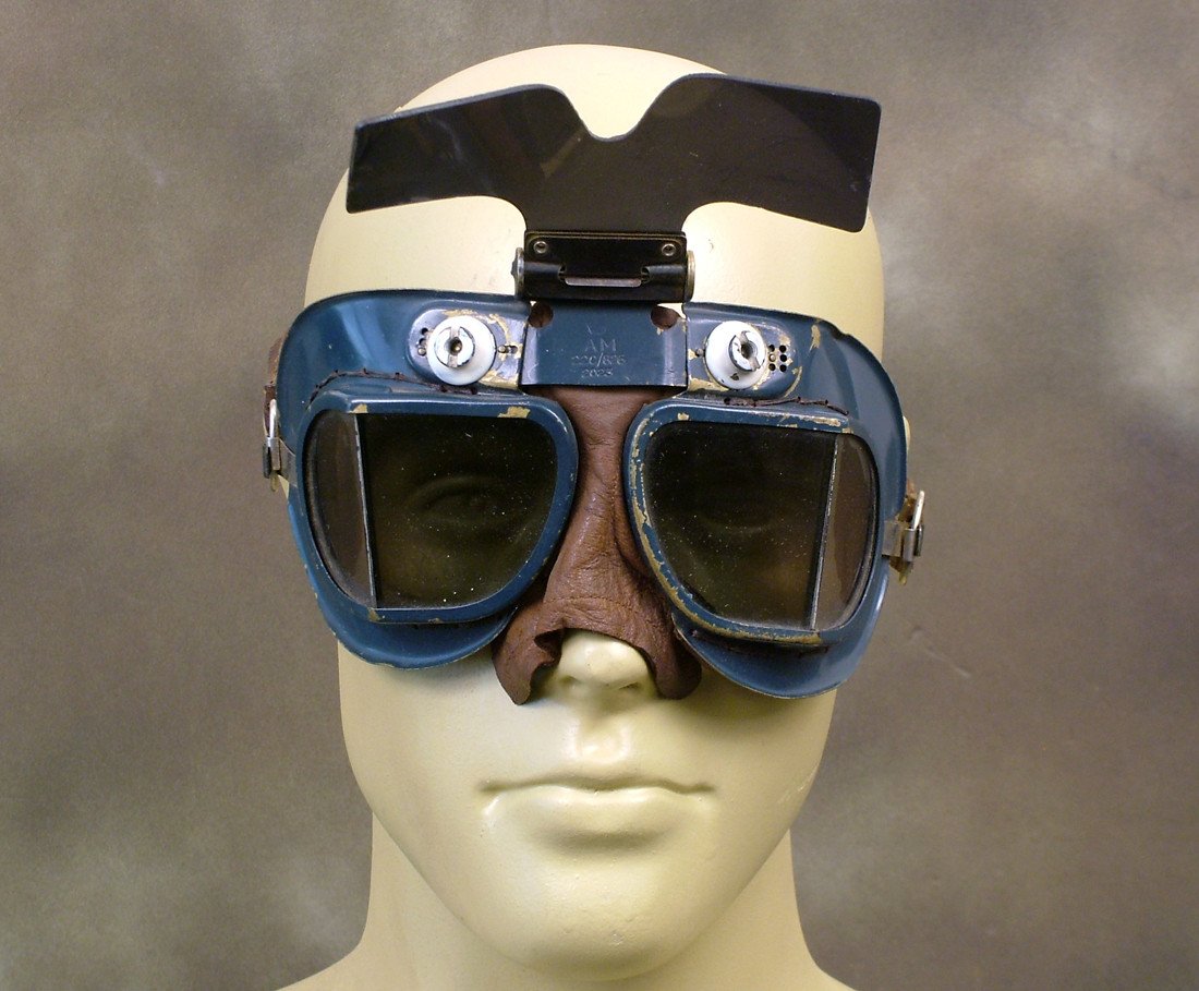 Original Item: One Only. Very rarely found complete with the original "Flip Sun Shield" these are very well marked Authentic British WW2 era Fighter Pilots Goggles as used by Spitfire and Hurricane pilots. Well marked with "King's Crown, over A.M." (Air Ministry) over "22C/826" above "2023". Leather lined with leather adjustable head strap. Still retains the very rare early dark filtered "Sun Glass" flip down eye panel with nose cut out which was always removed in later service. In an original RAF dark blue paint finish to steel parts these are exceptionally rare WW2 British Pilots Fighter Goggles, as issued in the very beginning.