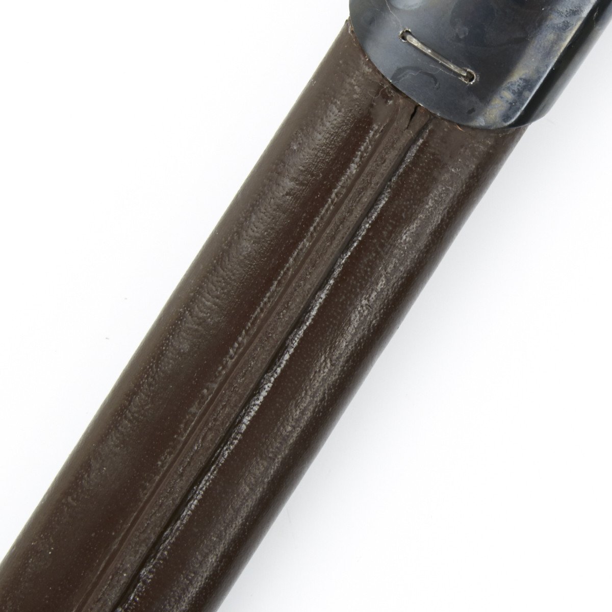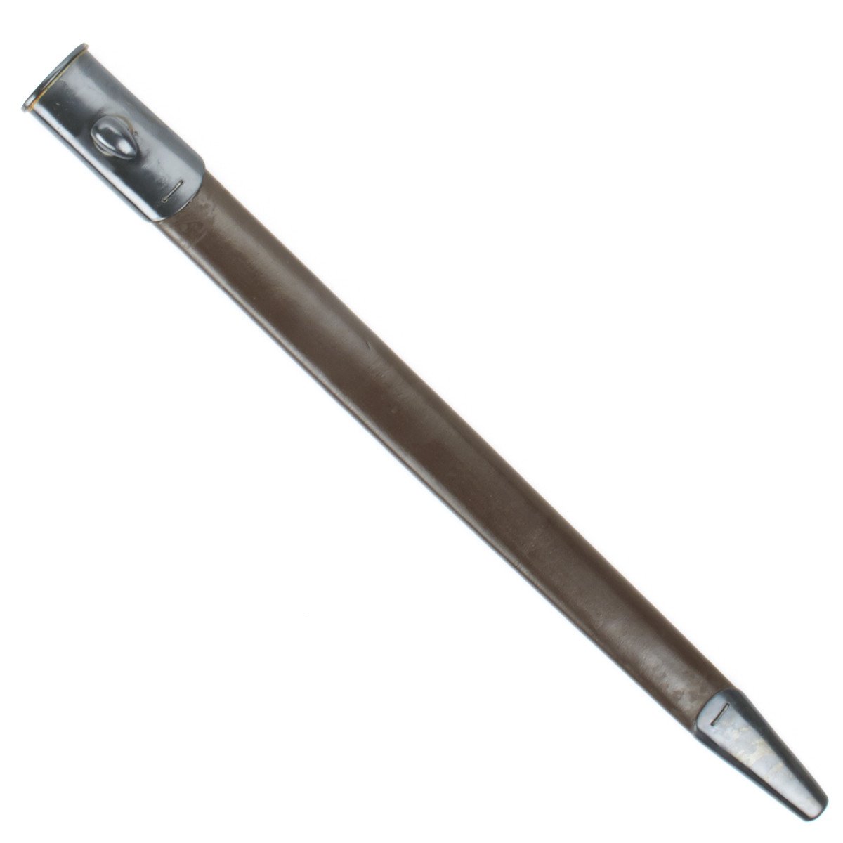 New Made Item: An excellent reproduction of this long (17" blade) bayonet scabbard used by the British in WWI. Brown leather with blued steel mounts. Fits 17 inch bladed 1907 Pattern SMLE Bayonets.