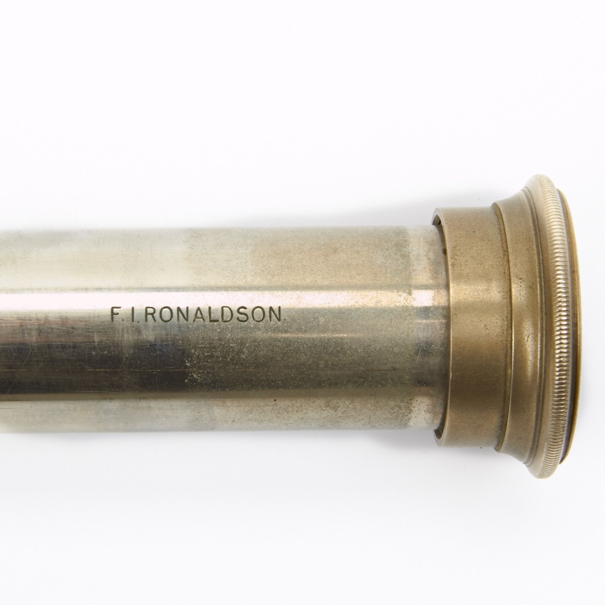 Measures 24 inches when fully extended. This telescope is fitted with a nice sliding sun shade to front and the optics barrel bears the marking of the naval officer F.I. RONALDSON.