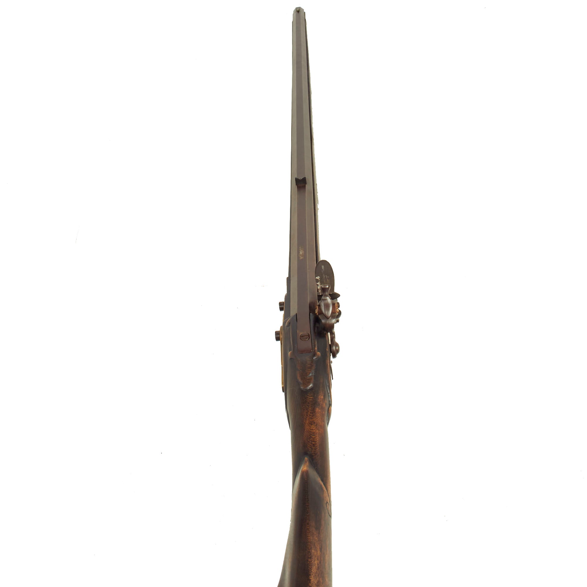 The barrel is fitted with standard fixed sights, and the lock is a nice replica "trade" flintlock, very common for the period. It is fully functional, and looks to be very well made. The ramrod has a spiral pattern around it, made by wrapping a burning string around it to give the appearance of figuring. The bore is in great shape, showing crisp 8 groove rifling, with just a bit of wear and fouling towards the front.