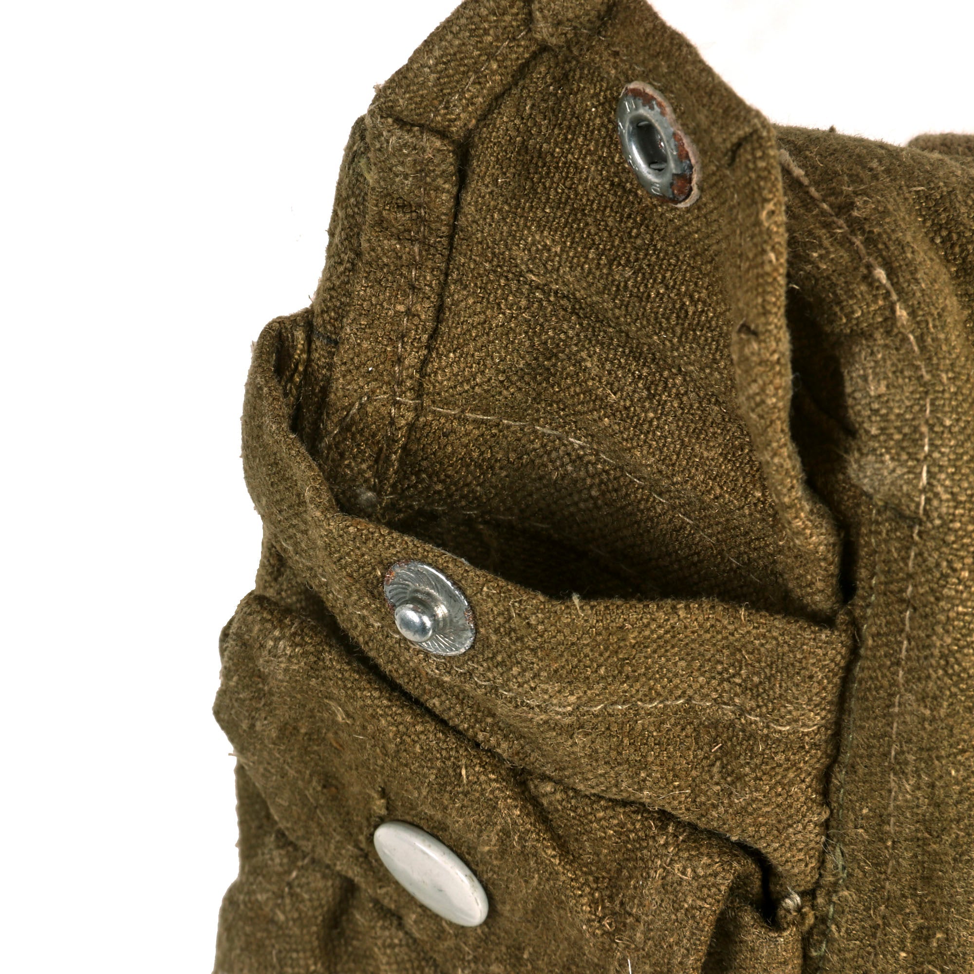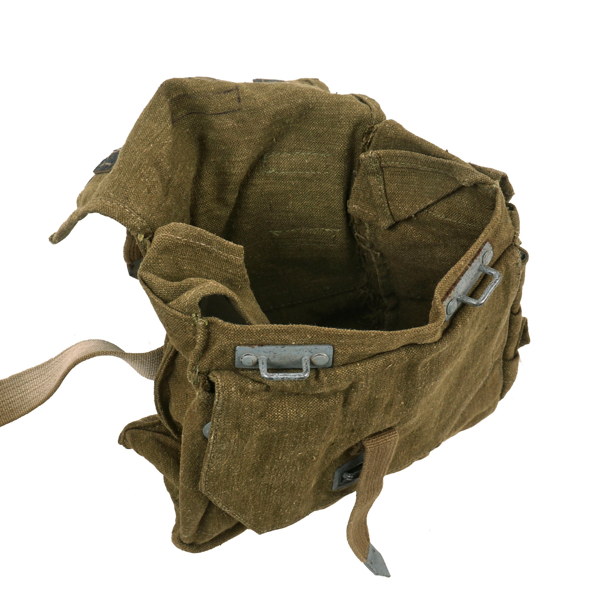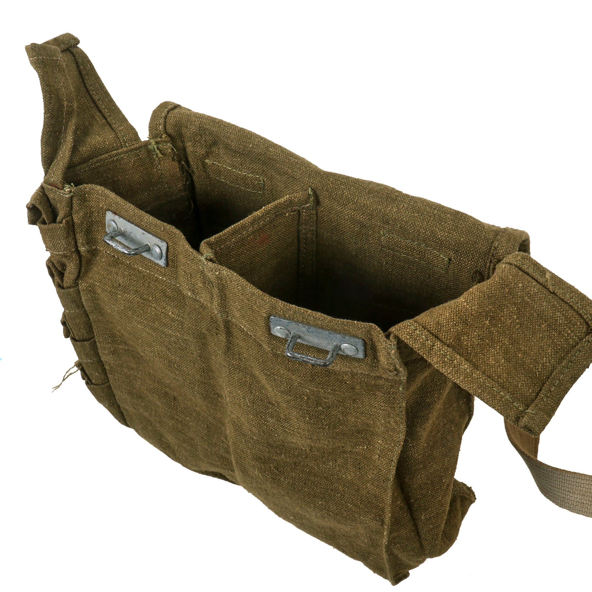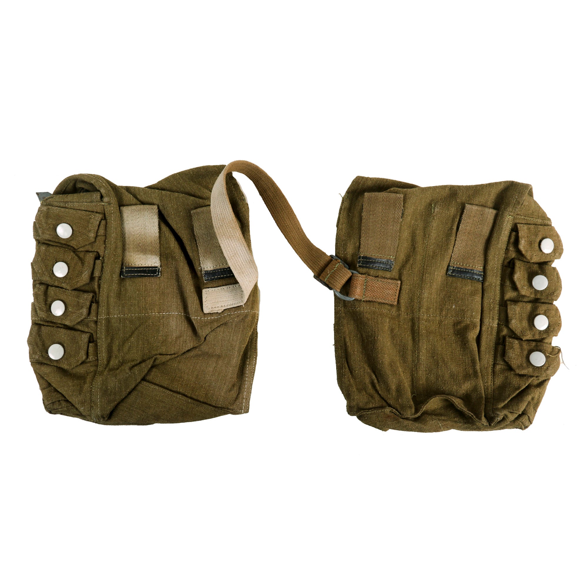 The left pouch was intended for additional explosives and grenades in two compartments. Both pouches have a series of four vertical rifle ammunition pouches intended to carry ammunition in stripper clips. The right side pouch, with only one larger compartment, was intended for the Gas Mask. Each side pouch has belt loops to secure the set at the waist, and strangely enough there are no D-rings attached to the pouches to secure them to the Y-straps. Why this was done is unknown.