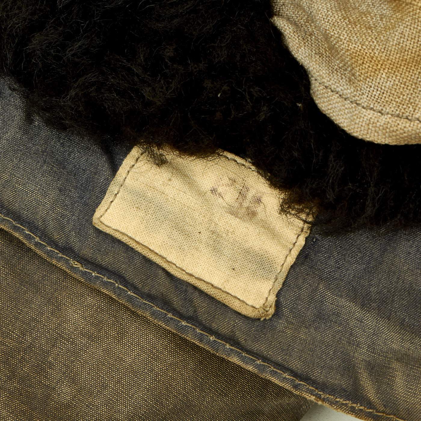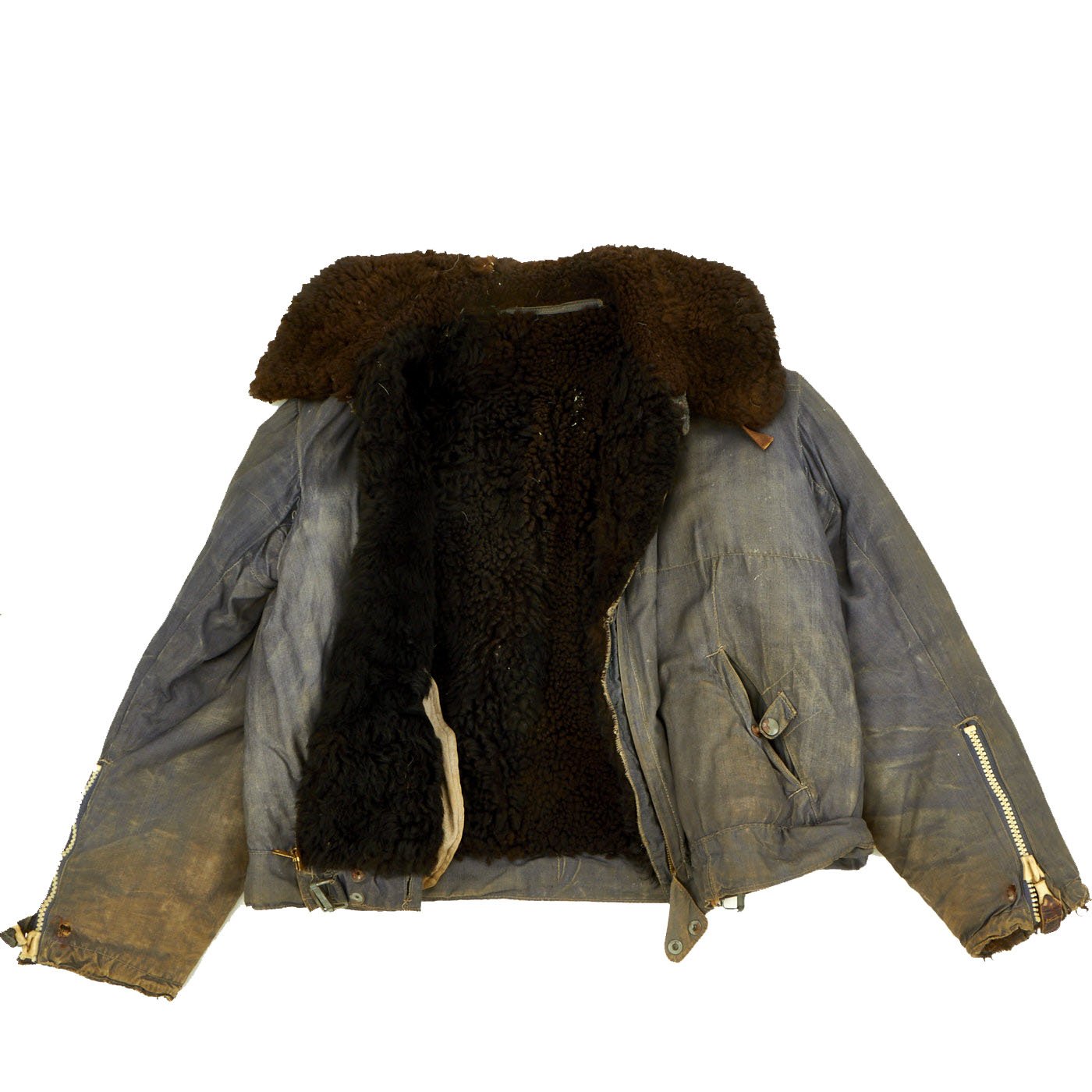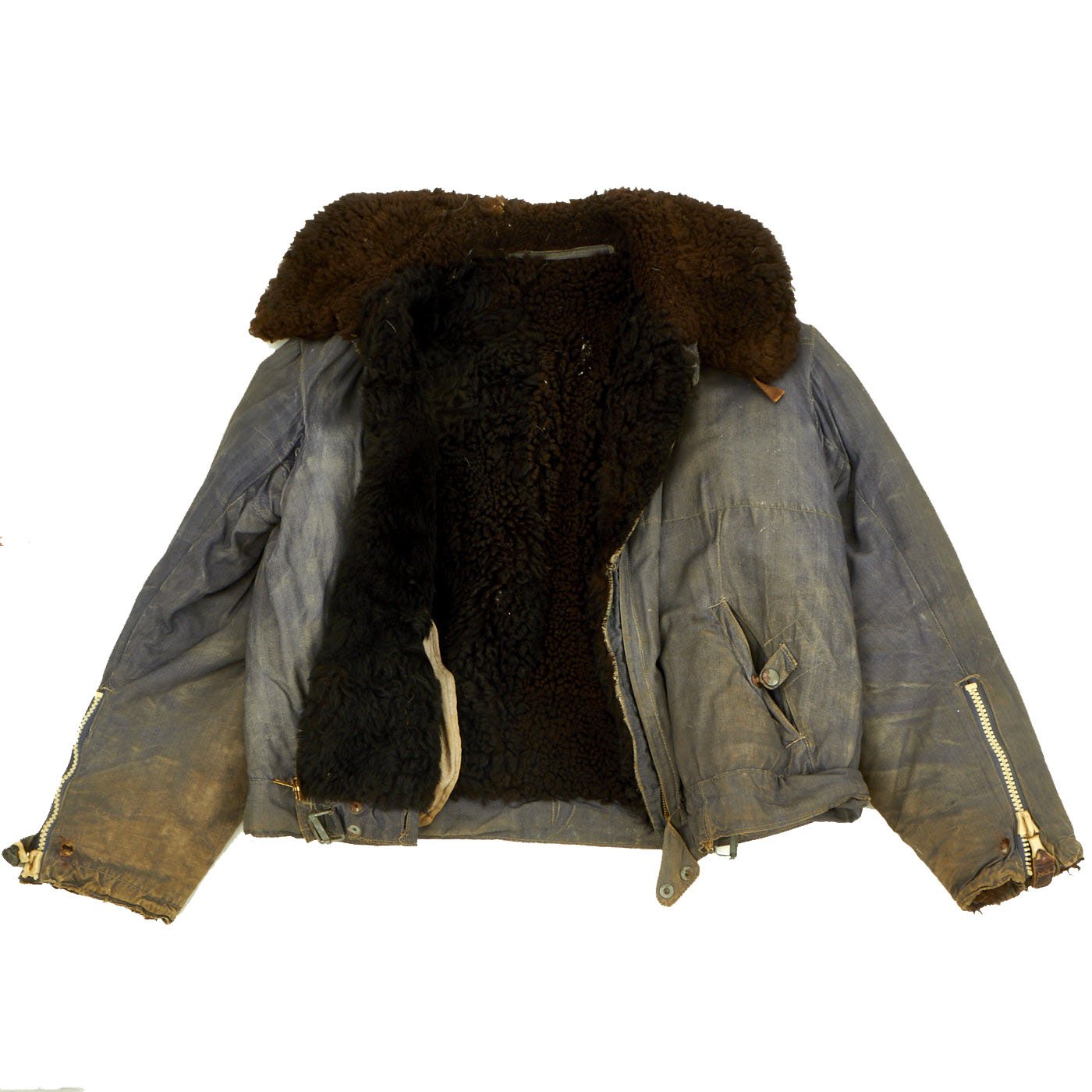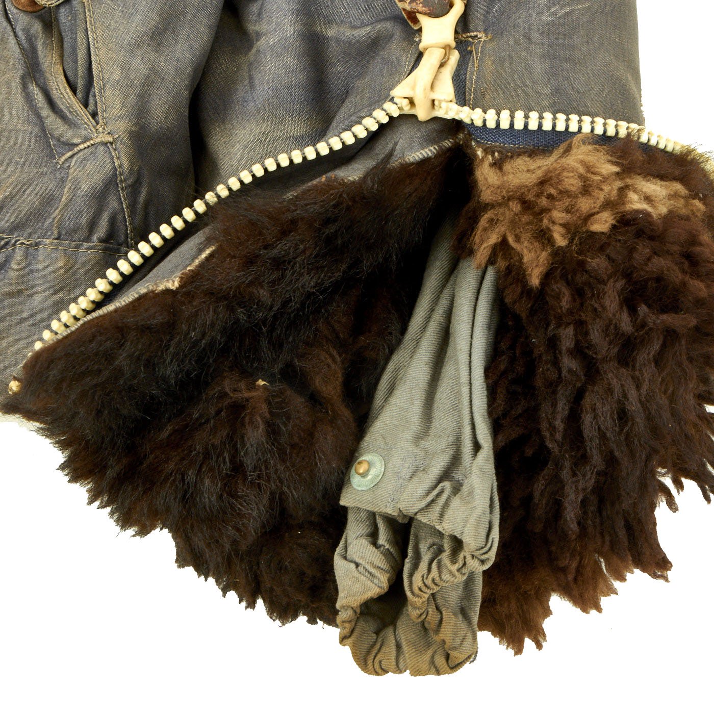 This particular example is of the later war variety which appeared circa 1943-1944. The Jacket is constructed of a cotton/rayon blend outer shell with natural fleece lining, and a large fleece outer collar. The cuffs feature large plastic RiRi Zippers, which are complete with their original leather pull tabs. The jacket is in good condition for it’s age, and shows some damage to the internal fleece lining. On the cuffs, the “male” ends of the zipper securing straps are either missing, or loose. The neck closure strap is broken, however it is included as it was found in a pocket. The original zipper was replaced at some point with an American “Talon” Zipper. The coat overall shows signs of honest wear and age.