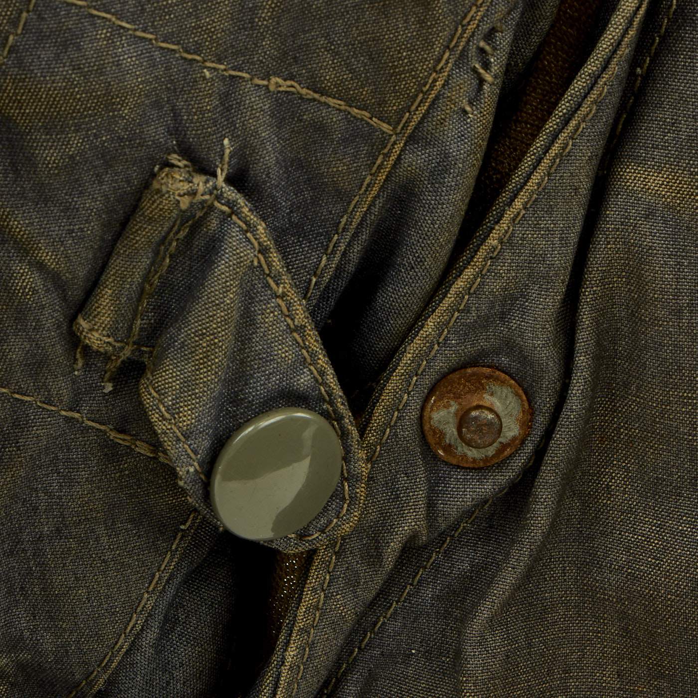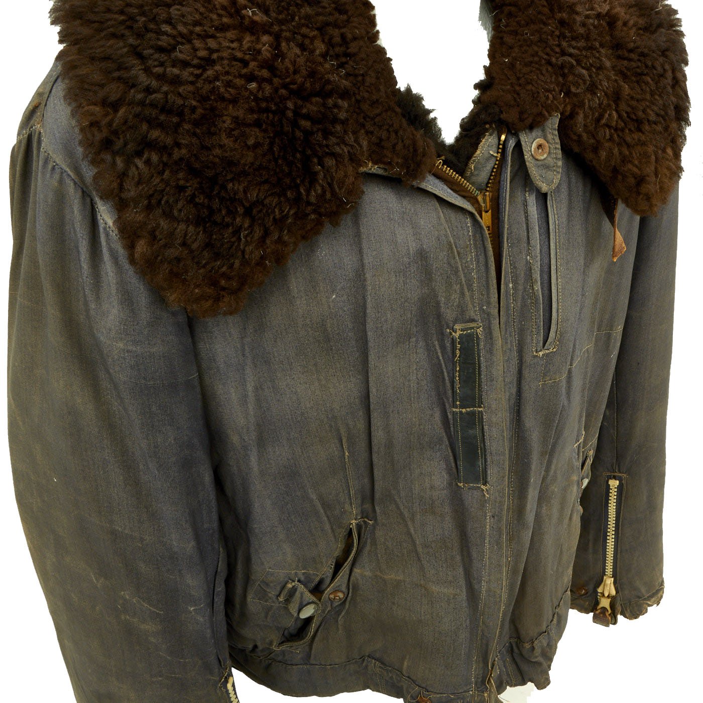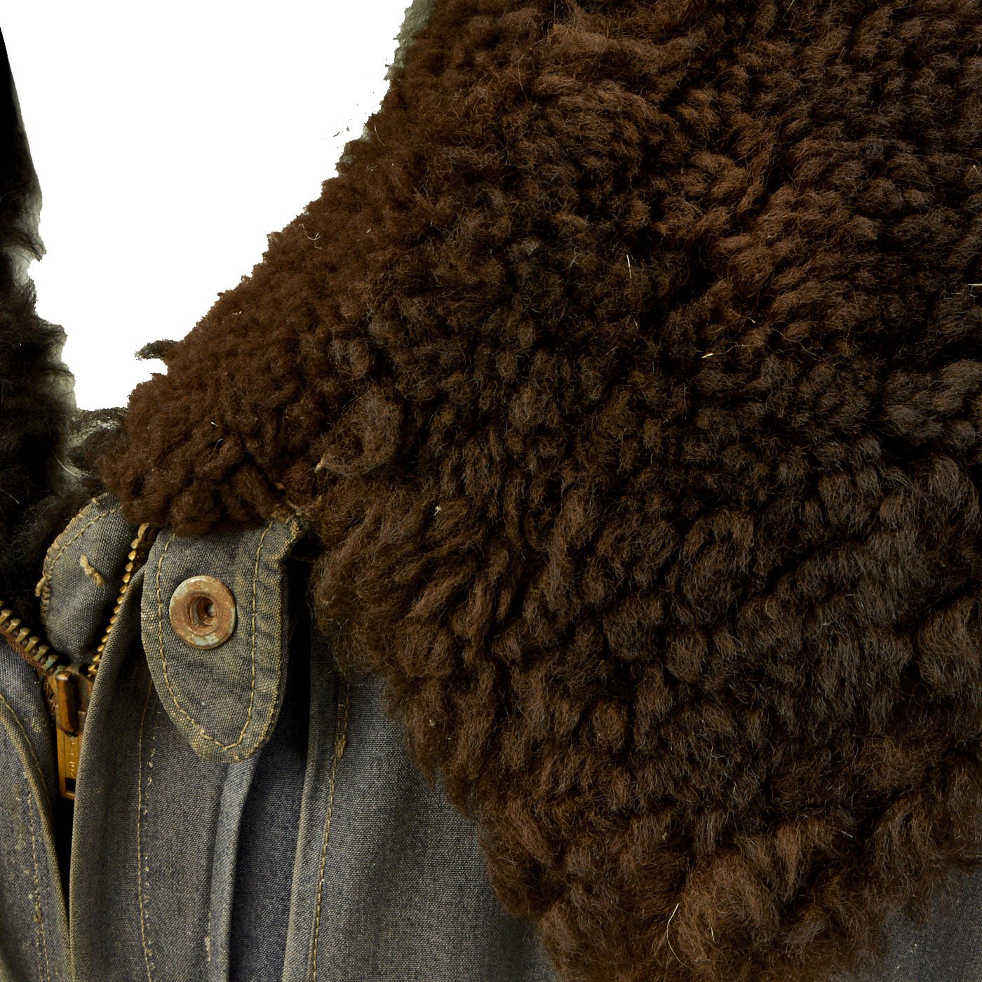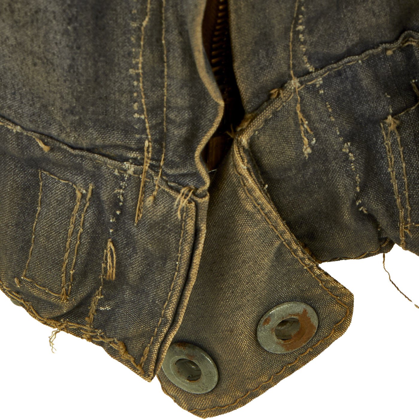 This particular example is of the later war variety which appeared circa 1943-1944. The Jacket is constructed of a cotton/rayon blend outer shell with natural fleece lining, and a large fleece outer collar. The cuffs feature large plastic RiRi Zippers, which are complete with their original leather pull tabs. The jacket is in good condition for it’s age, and shows some damage to the internal fleece lining. On the cuffs, the “male” ends of the zipper securing straps are either missing, or loose. The neck closure strap is broken, however it is included as it was found in a pocket. The original zipper was replaced at some point with an American “Talon” Zipper. The coat overall shows signs of honest wear and age.
