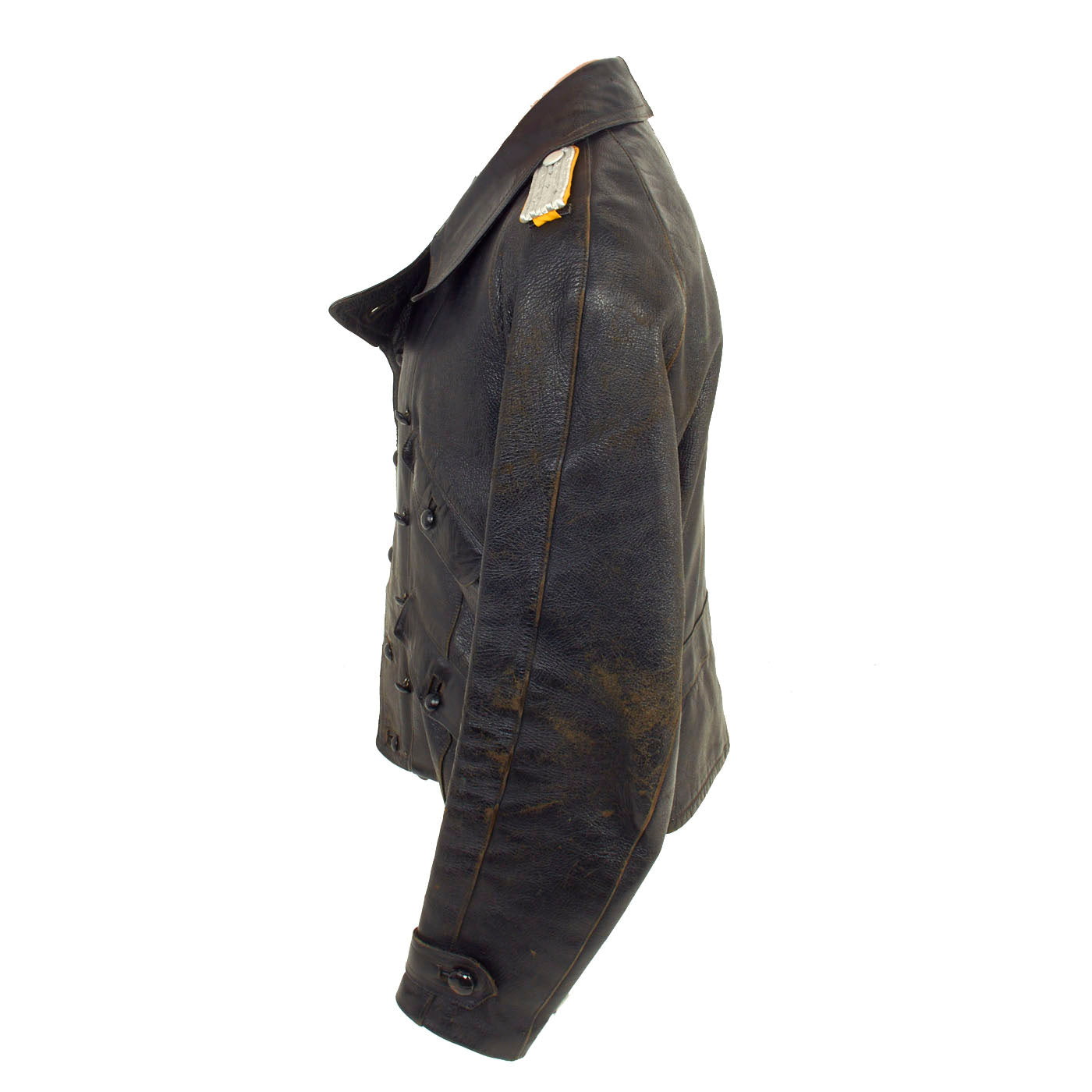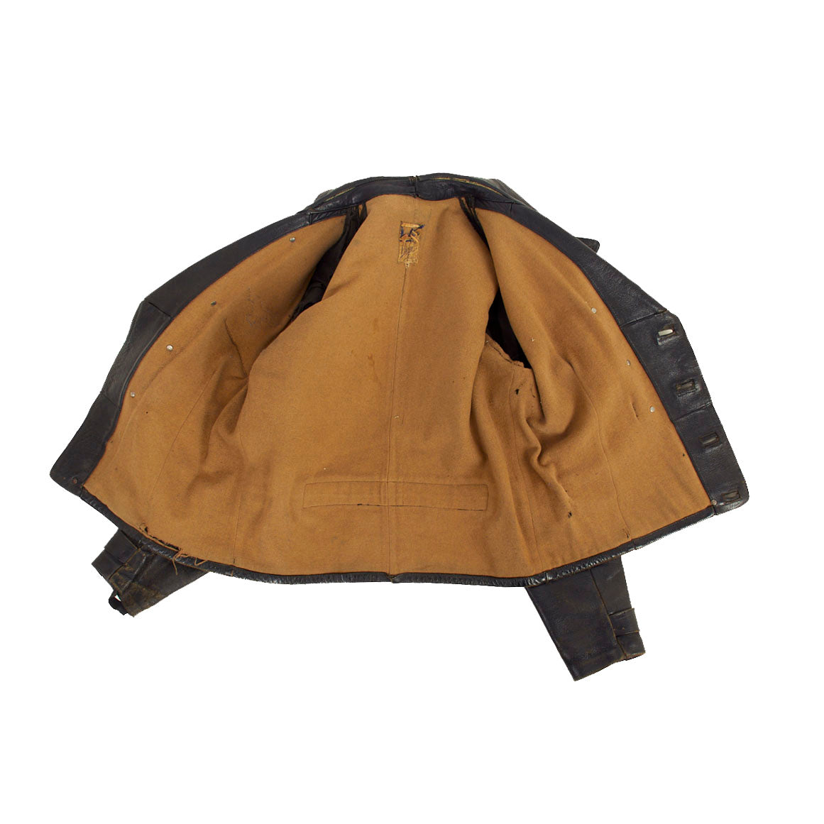 This is a very nice Luftwaffe Officer's leather flight jacket, offered in very good condition with signs of moderate wear during service. There is wear to the black finish, but no tears or cracking that we can see. This example is a very high quality, private purchase, non-regulation flight jacket, featuring multi-panel black leather construction. The interior of this waist length jacket is fully lined, and features a lay down collar. It still has the original maker label on the interior, though it is deteriorated. It originally would have read: