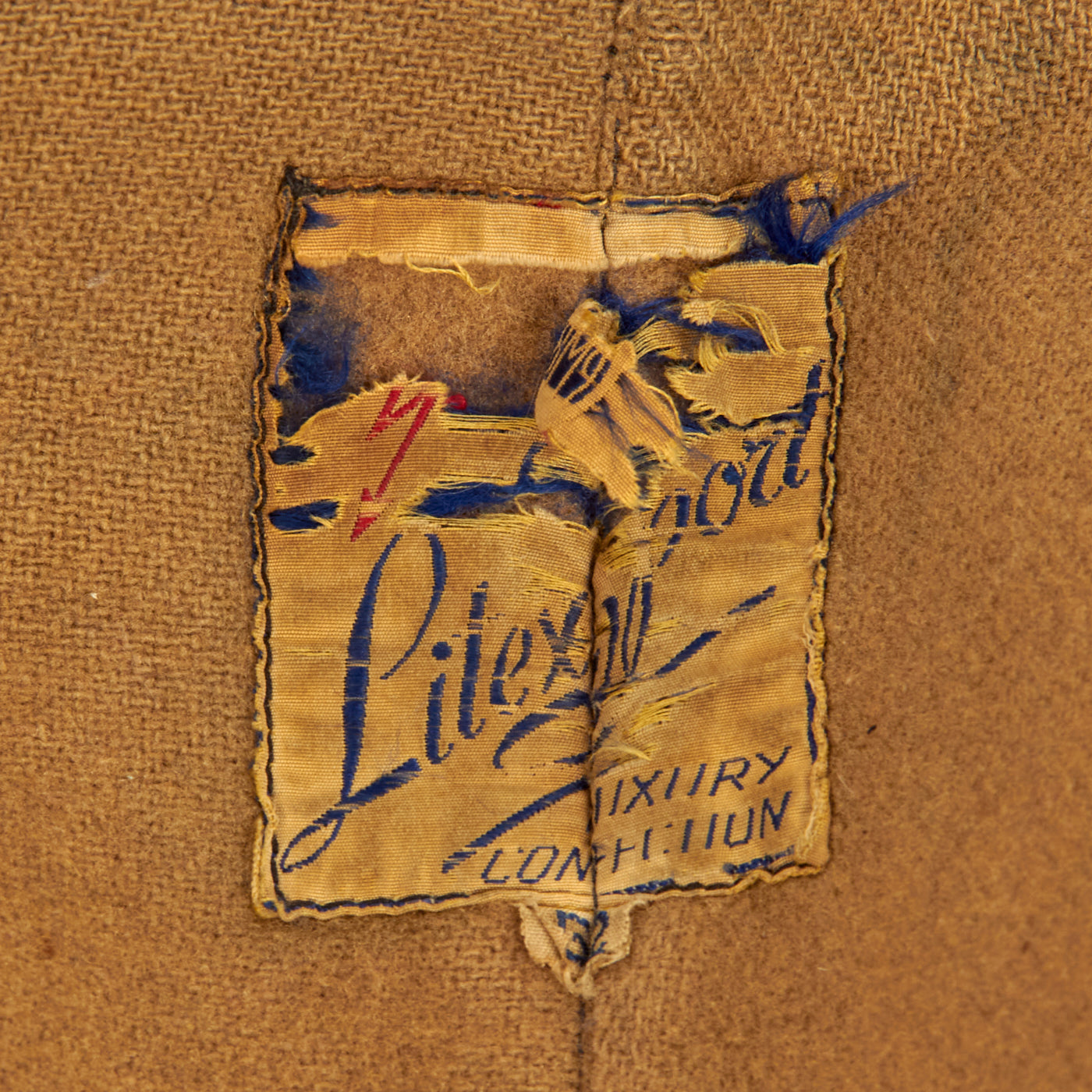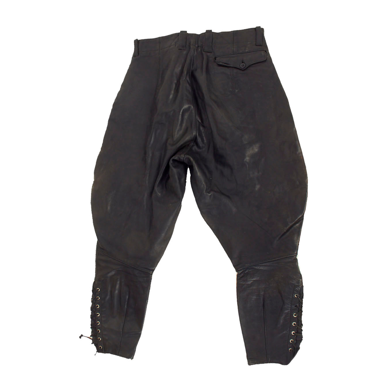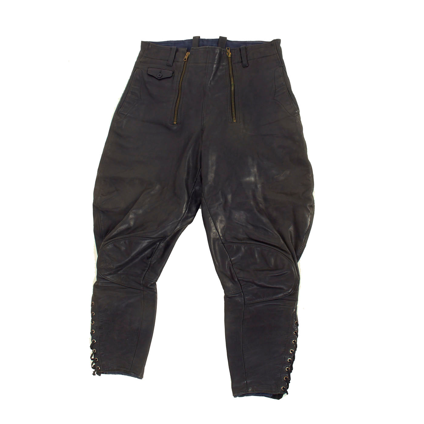 The included leather flight pants are a really nice example, made with a black leather exterior, and lined with a blue fleece type fabric liner. It features a double zipper front closure and has belt loops, but no belt is included. The bottoms of the legs have laced closures to help the feet pass through as well. The two front zipper closures are marked by the German ZIPP brand, based in Nuremberg, and are both fully functional. Condition is very good, with the exterior leather shell in great shape with just a few small repairs that we can see. The interior is very nice, though unfortunately there is just a remnant of the original maker tag on the left rear interior.