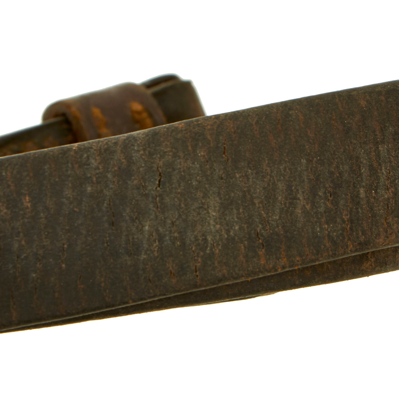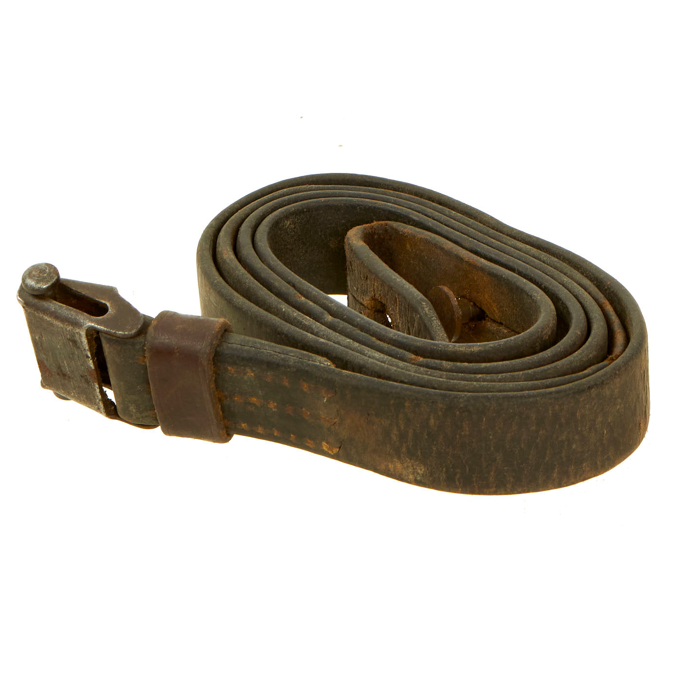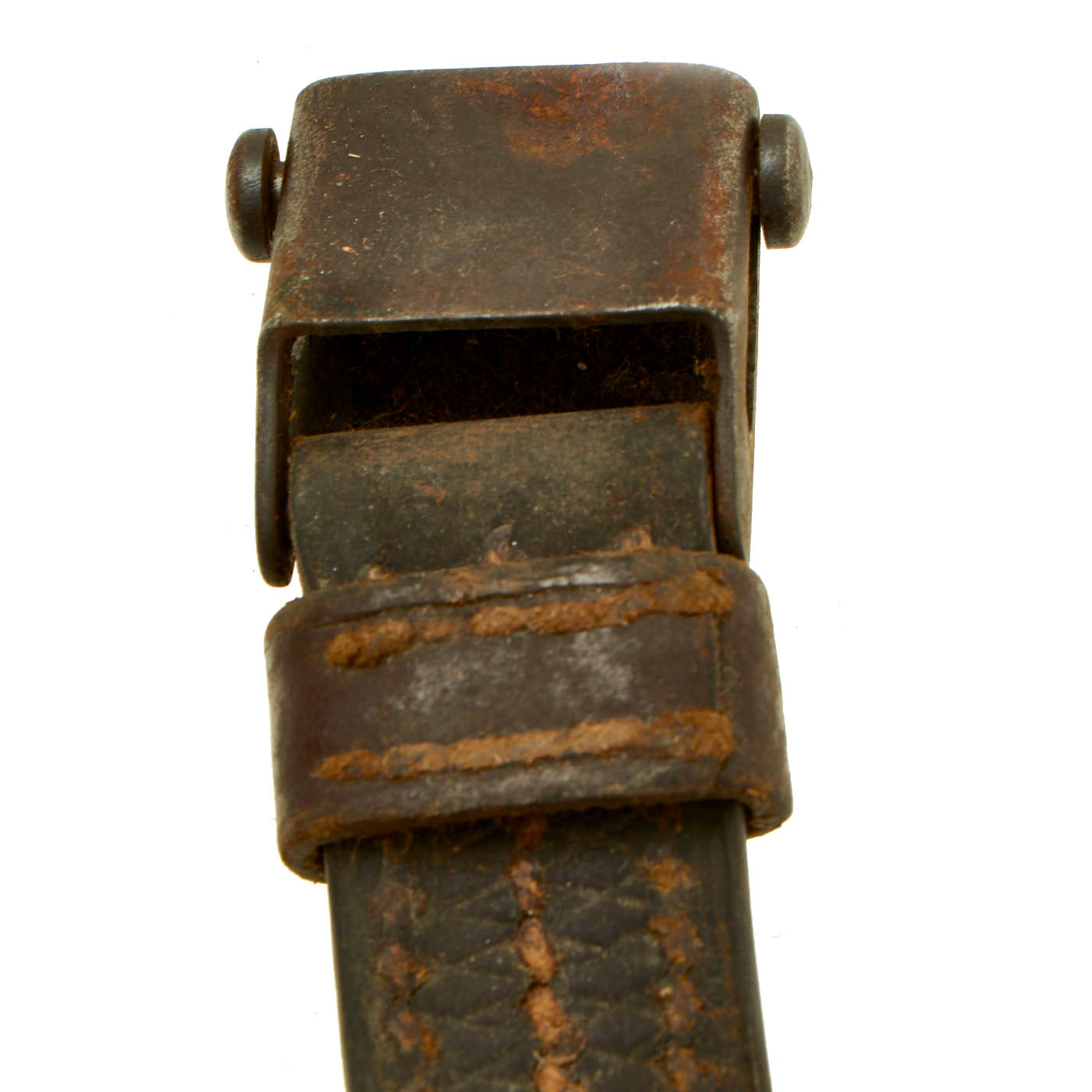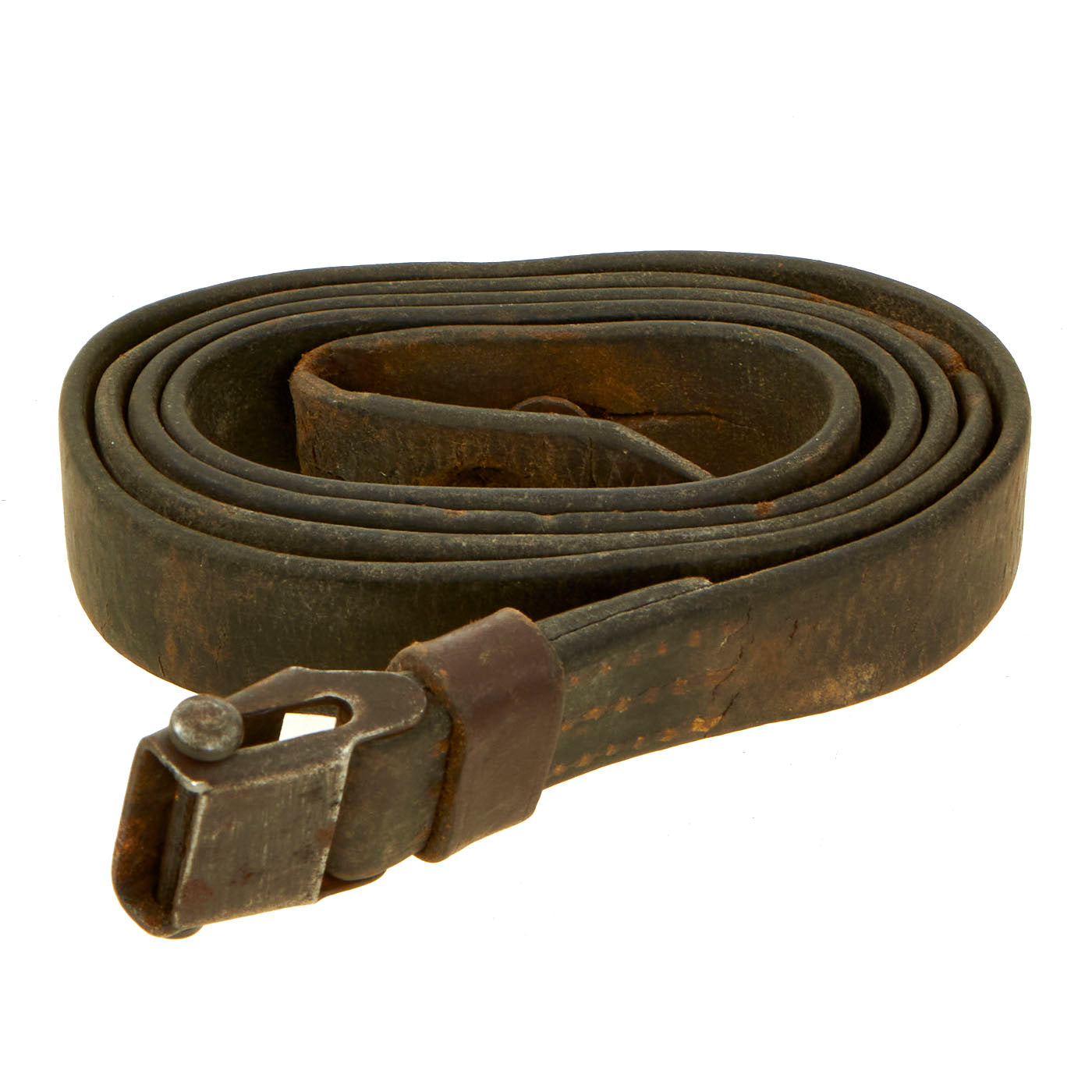 The slings are made of thick brown crosshatched leather with steel hardware. Each sling is fitted with its original steel sliding buckle. The slings are in good, serviceable, condition Some slight variation should be expected with the slings. Some may have original markings, some have reproduction markings, small slight nuances with hardware, and so on.
