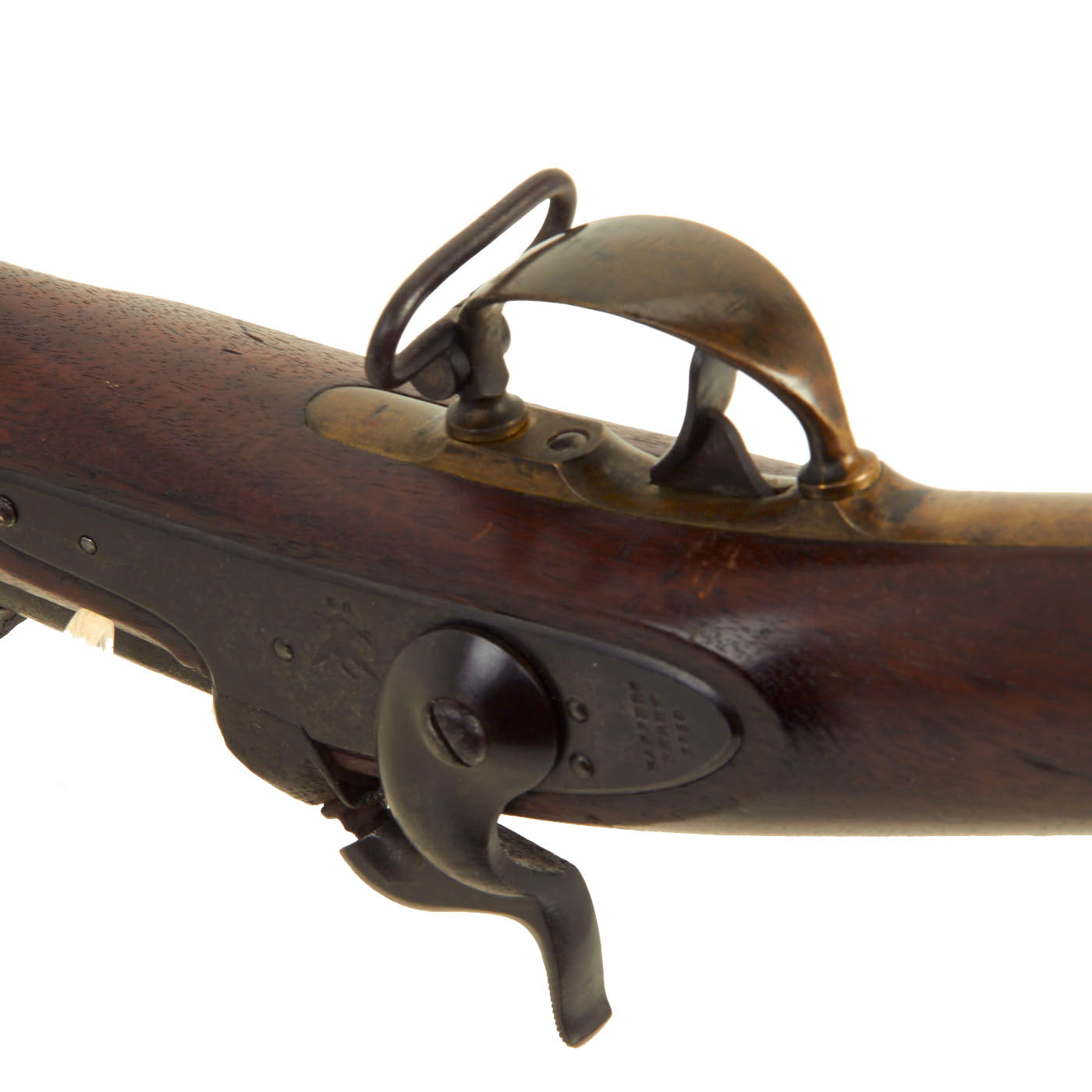 While some examples were made by Government contractors, this lovely example was made in 1850 at the United States Armory and Arsenal at Harpers Ferry, located in Harpers Ferry, in what was then Virginia. After the outbreak of the U.S. Civil war, The North West corner of Virginia separated itself into West Virginia. This example is in lovely condition, a real great example of this type. The lock plate is marked (EAGLE) / U.S. in the center and HARPERS / FERRY / 1850 across the lock plate tail. There is powder burn around the barrel breech, so there is no date visible there, just a faint P / Eagle's Head, as well as W W / P.