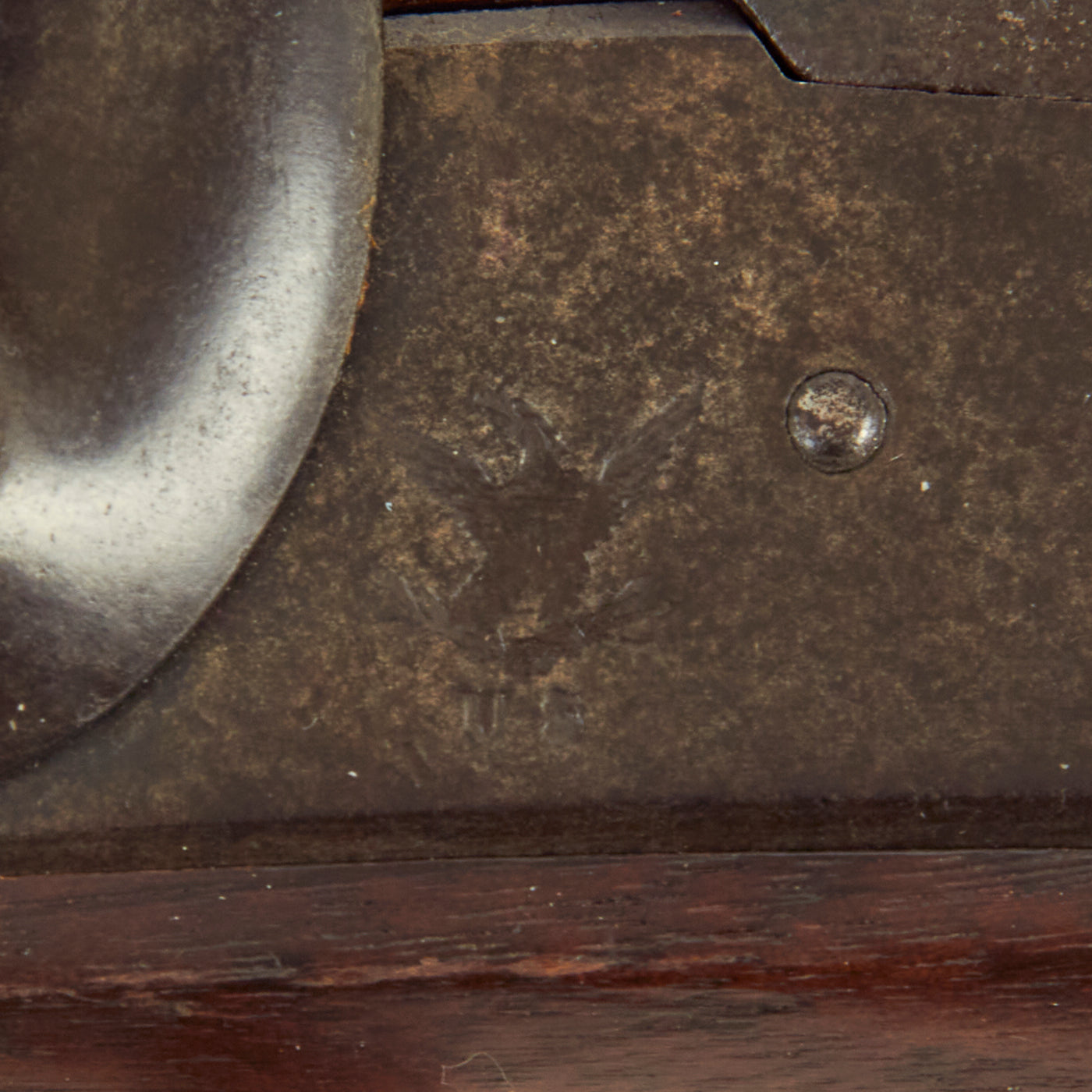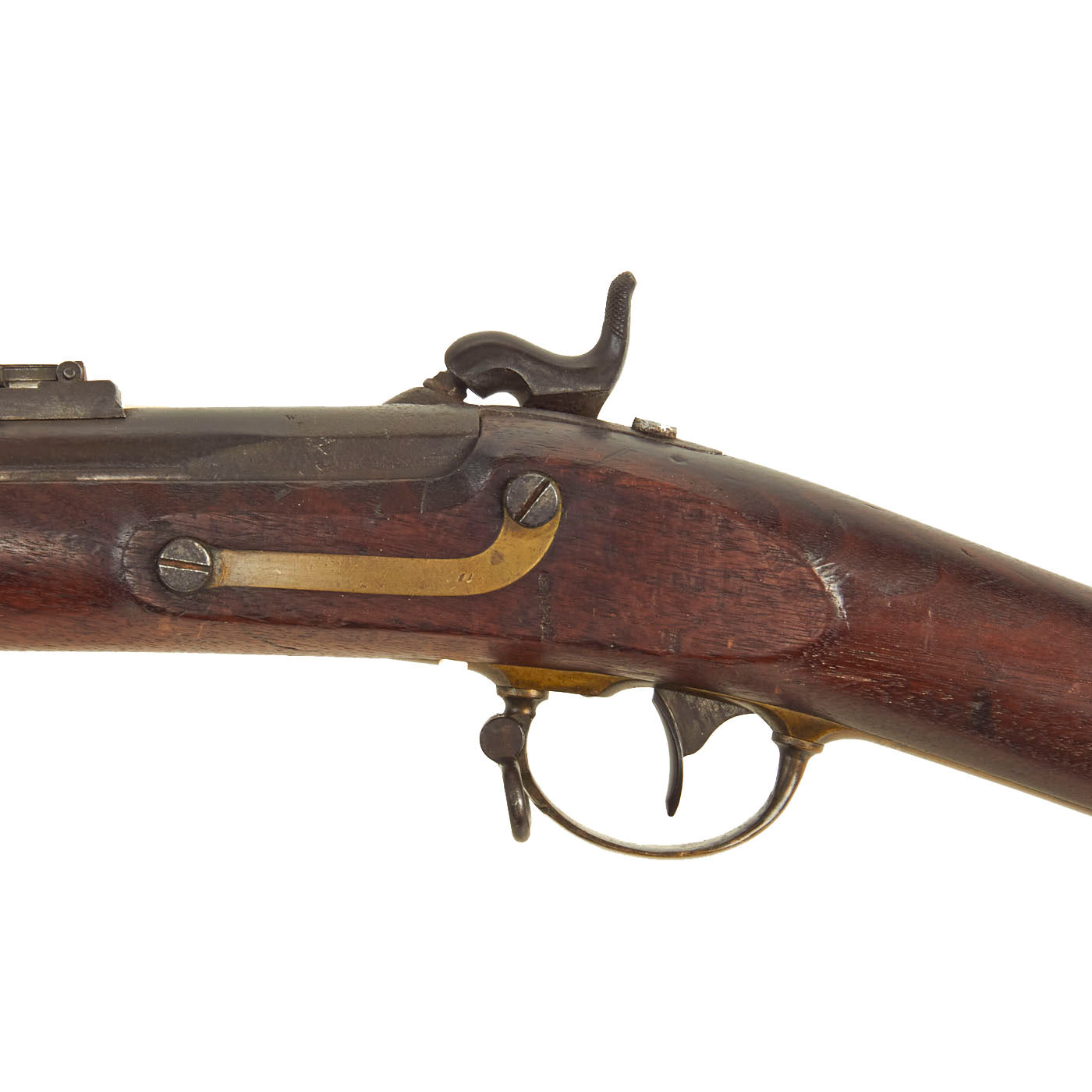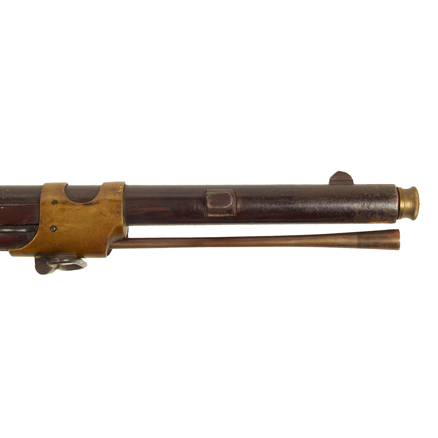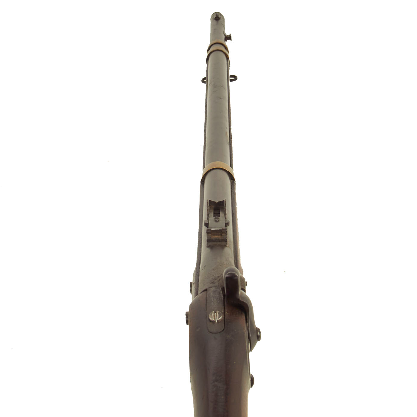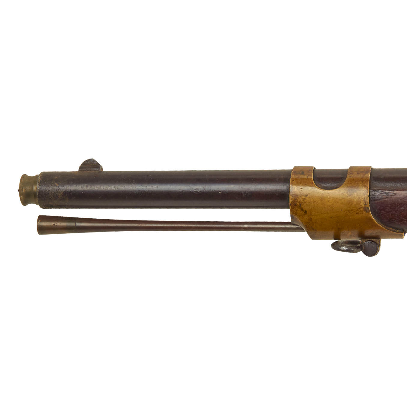 This rifle was definitely converted, and now has a .58 caliber barrel with three groove rifling. The rear sight was replaced with what looks to be a ladder sight, possibly for sharpshooters, and the right side of the barrel near the muzzle has had a bayonet lug added. This is definitely not a Colt conversion, as they used a bolt-on bayonet lug, and would use the three leaf sight from the Colt revolving rifle in the rear. Per information we received with this rifle on a small note in the patch box, it was carried during the U.S. Civil War by Union Soldier John Zie Easton, who was the owner's husband's grandfather.