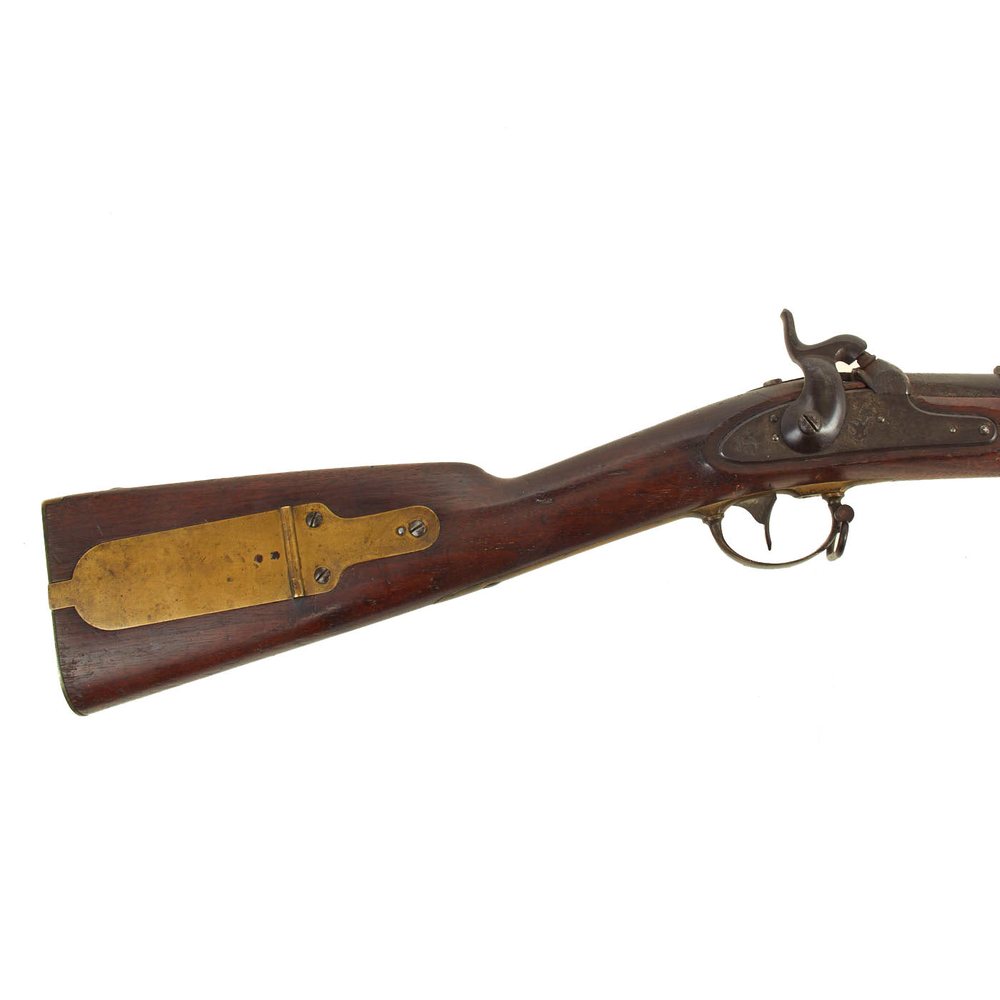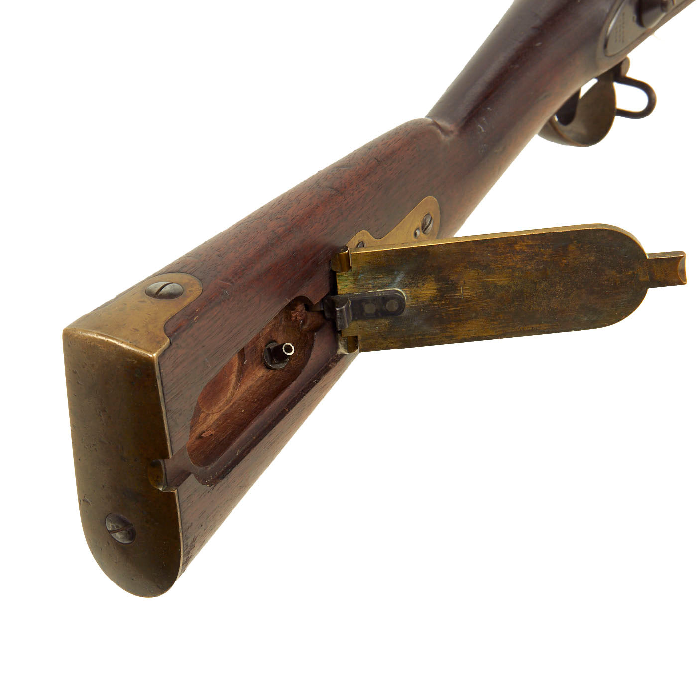 The weapon is fully brass mounted including a brass patch box to the Butt, which was used for storage of patches and sometimes bullets, as well as spare cap nipples, which this compartment has. This way if the nipple broke or was clogged, it could easily be replaced. It was also used to store tools such as the clearing worm and Springfield multi-tool, however there is only the cap nipple in the compartment, without any tools or accessories. There is also a cork muzzle "tompion", used to keep dirt out of the bore.