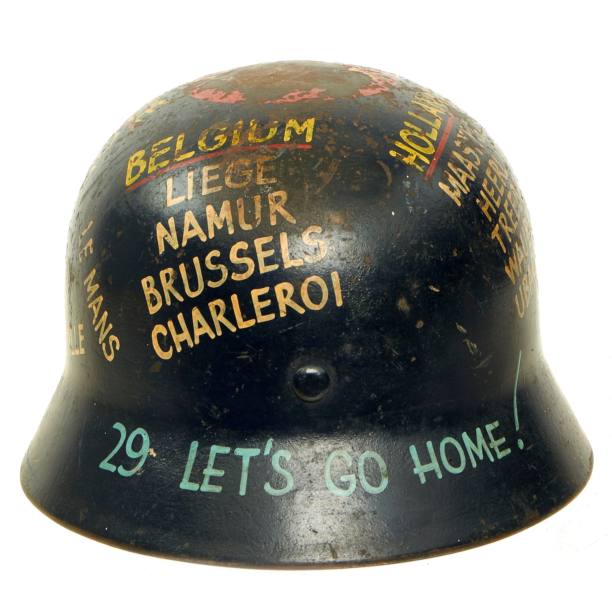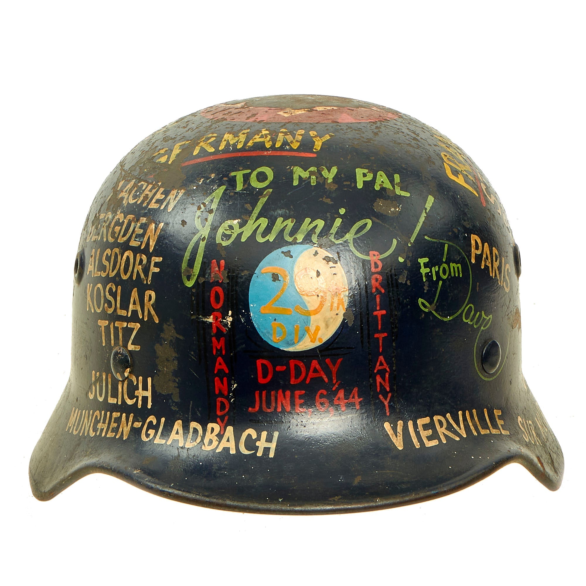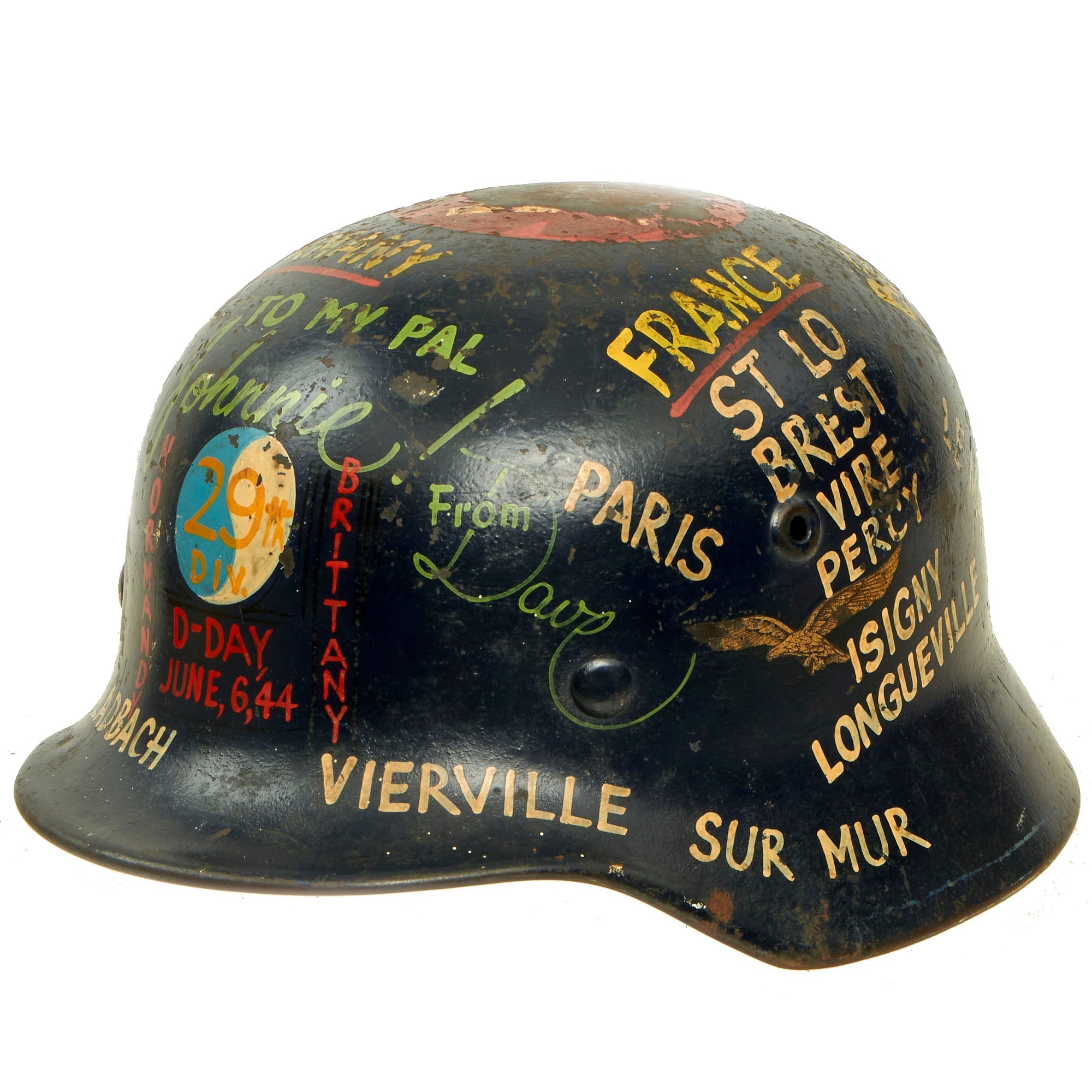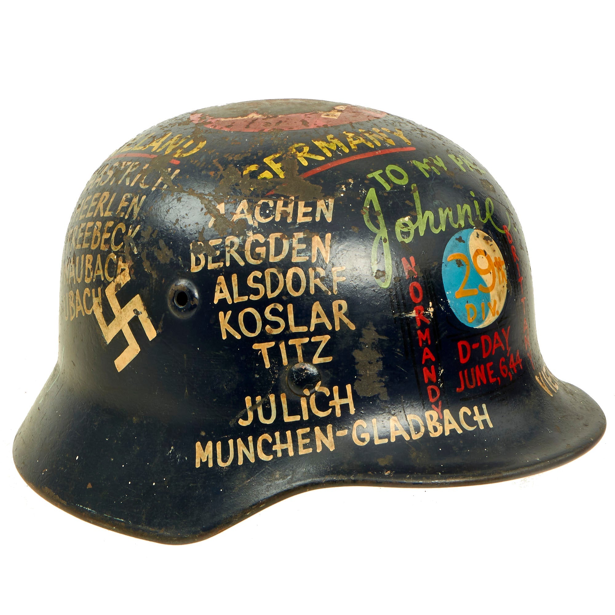 Original Item: One of a Kind. This is a fantastic USGI bring back souvenir German M40 Steel Helmet, captured by Members of the 29th Infantry Division "Blue and Gray", and decorated on the front with their distinctive unit insignia. It was common for soldiers to personalize "bring back" helmets with their unit insignia. Paint was readily available, even close to the front, and soldiers often had spare time to make these lovely pieces of military art.